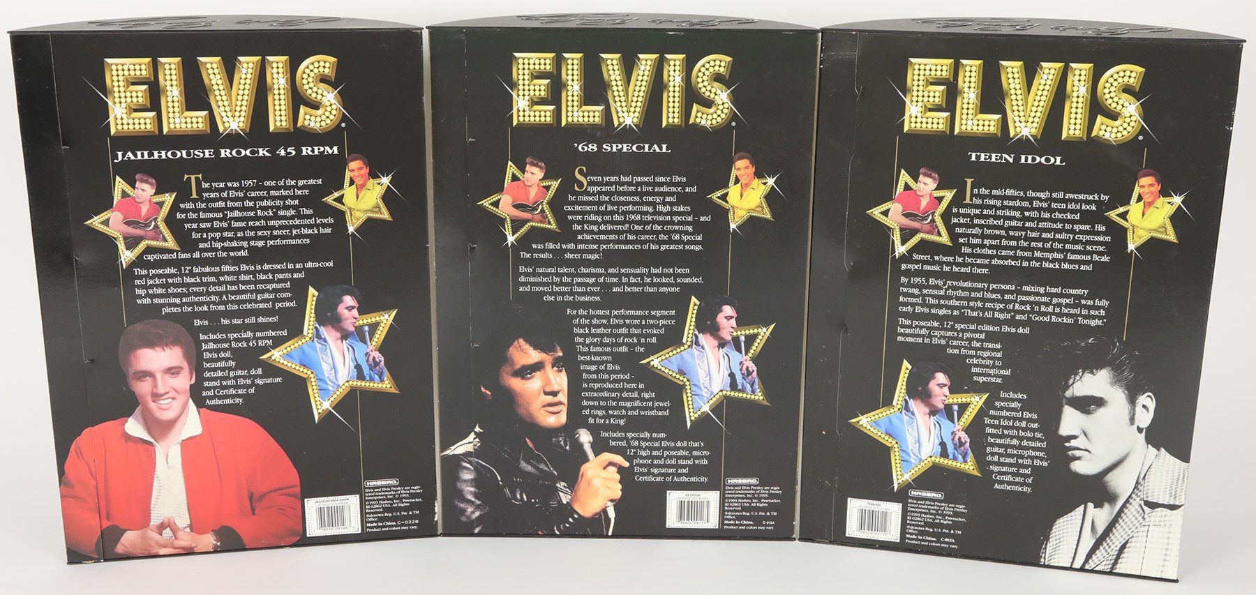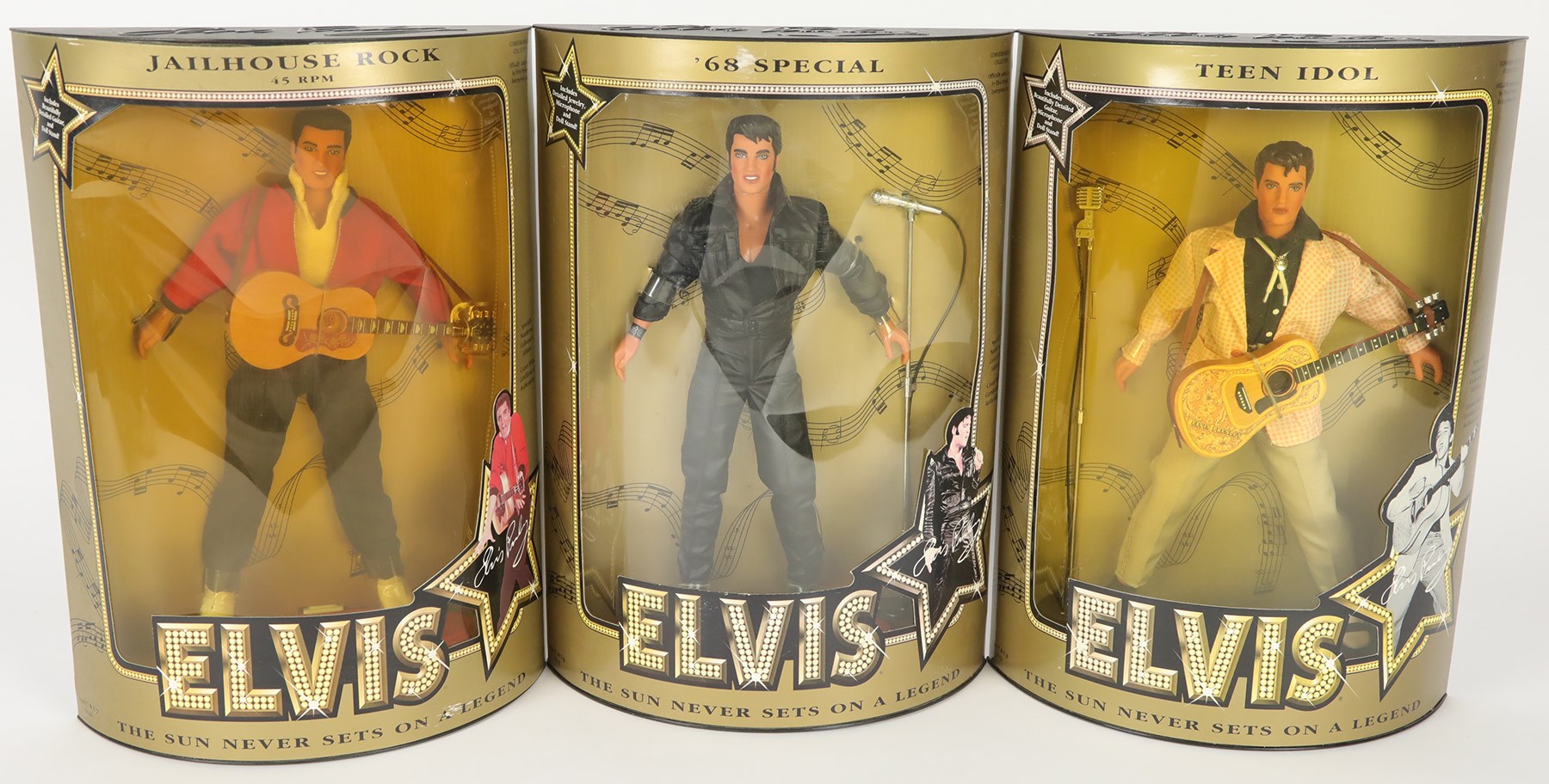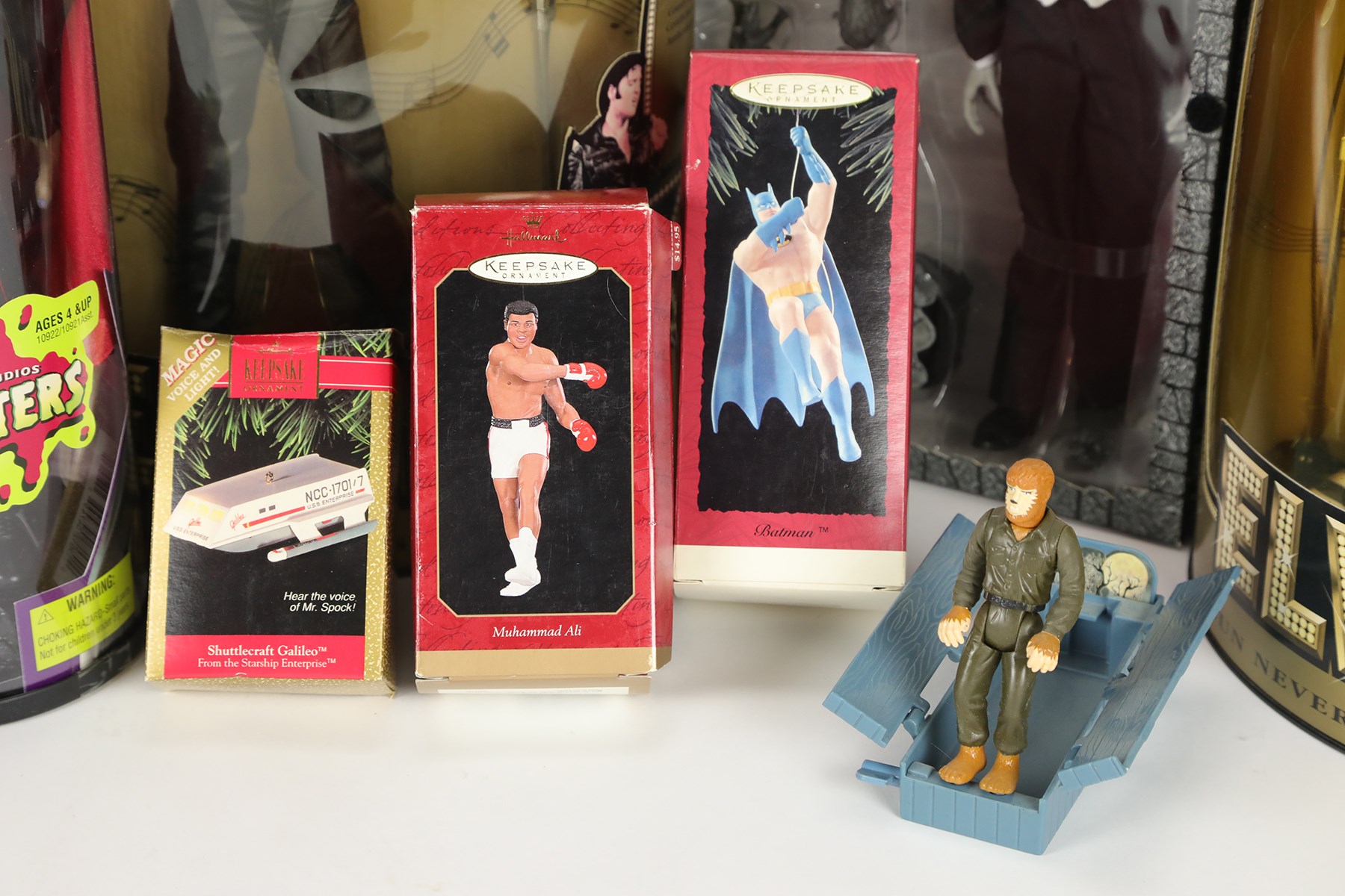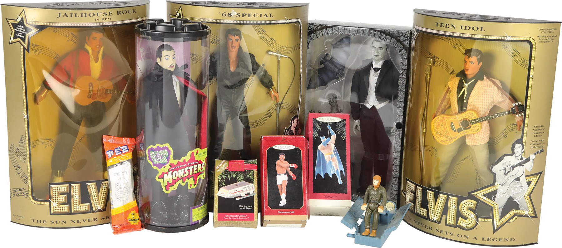 Presented is a terrific inside-the-original-box collection of Elvis and Dracula/Son of Dracula statues, an offering that is so original that is also figuratively "outside-the-box." Plus, the offering contains seven other figures or ornaments: Bat Man and Muhammad Ali Christmas ornaments, a Shuttle Craft Galileo ornament, a Batman Burger King figure, and even a "ghost" Pez dispenser, with wrapped Pez candy. 1) Elvis Presley '68 Special ornament, inside the original box. This ornament is based on the 1968 television special in which Elvis appeared before a live audience for the first time in seven years - and he was sensational. The Elvis figure is 12" tall, and wearing an outfit meant to evoke the black leather outfit that Elvis wore in his '68 Special appearance. The ornament comes with great detail, including jeweled rings, watch, wristband, poseable microphone and a figure stand with a facsimile Elvis signature.  It is specially numbered. 2) Elvis Teen Idol, in original box. A 12" tall figure, this ornament is specially numbered. It features Elvis wearing a bolo tie, with a detailed guitar, microphone, and a figure stand with a facsimile signature of Elvis. 3) Elvis Jailhouse Rock specially numbered 45 RPM figure. The poseable 12" fabulous fifties Elvis has a detailed guitar, and a figure stand with a facsimile Elvis signature. All three of the Elvis figures are in EXCELLENT condition.