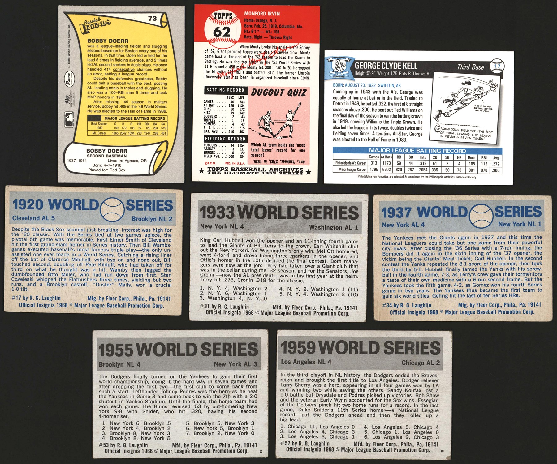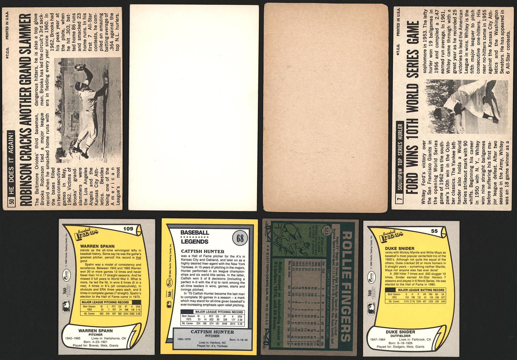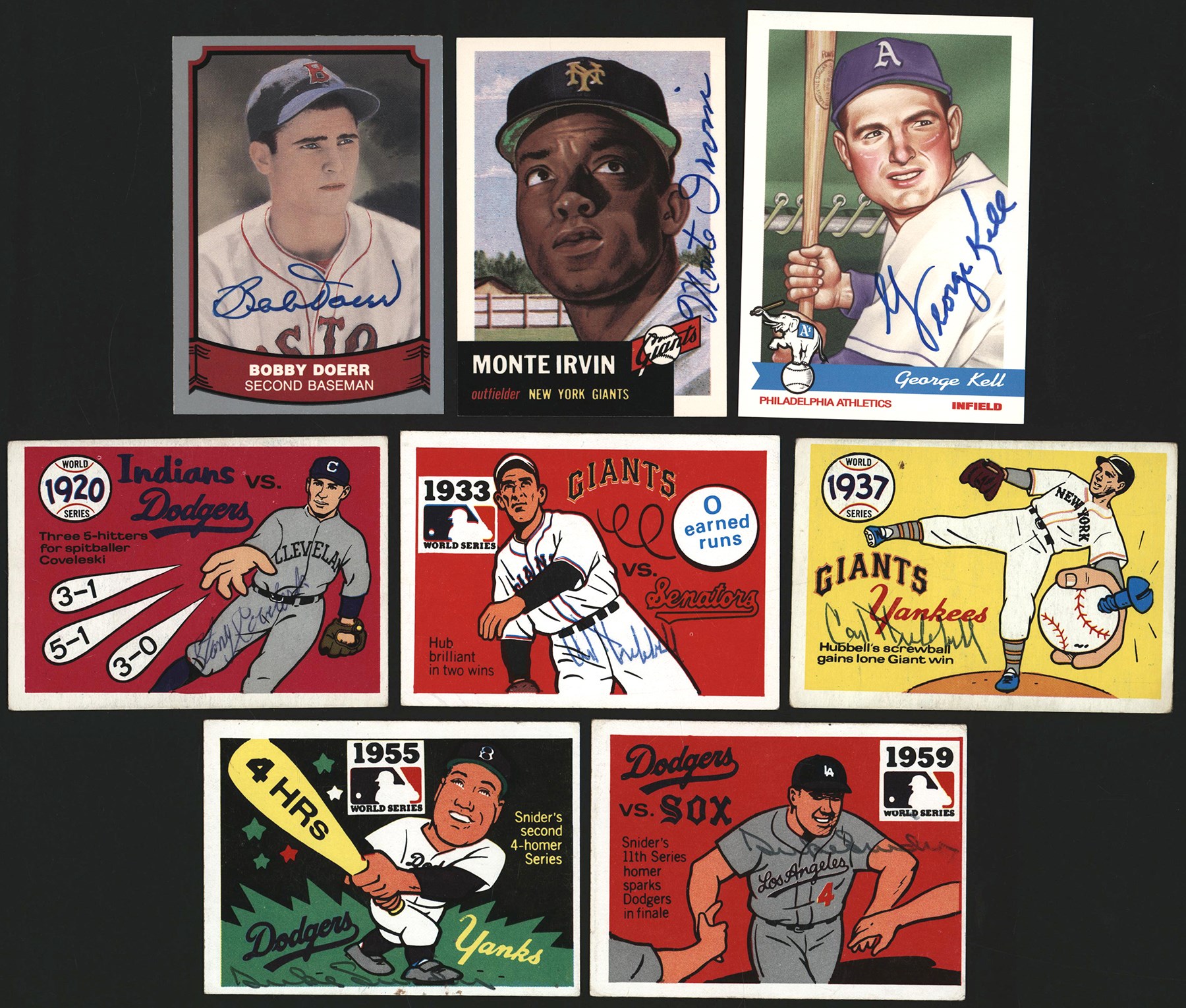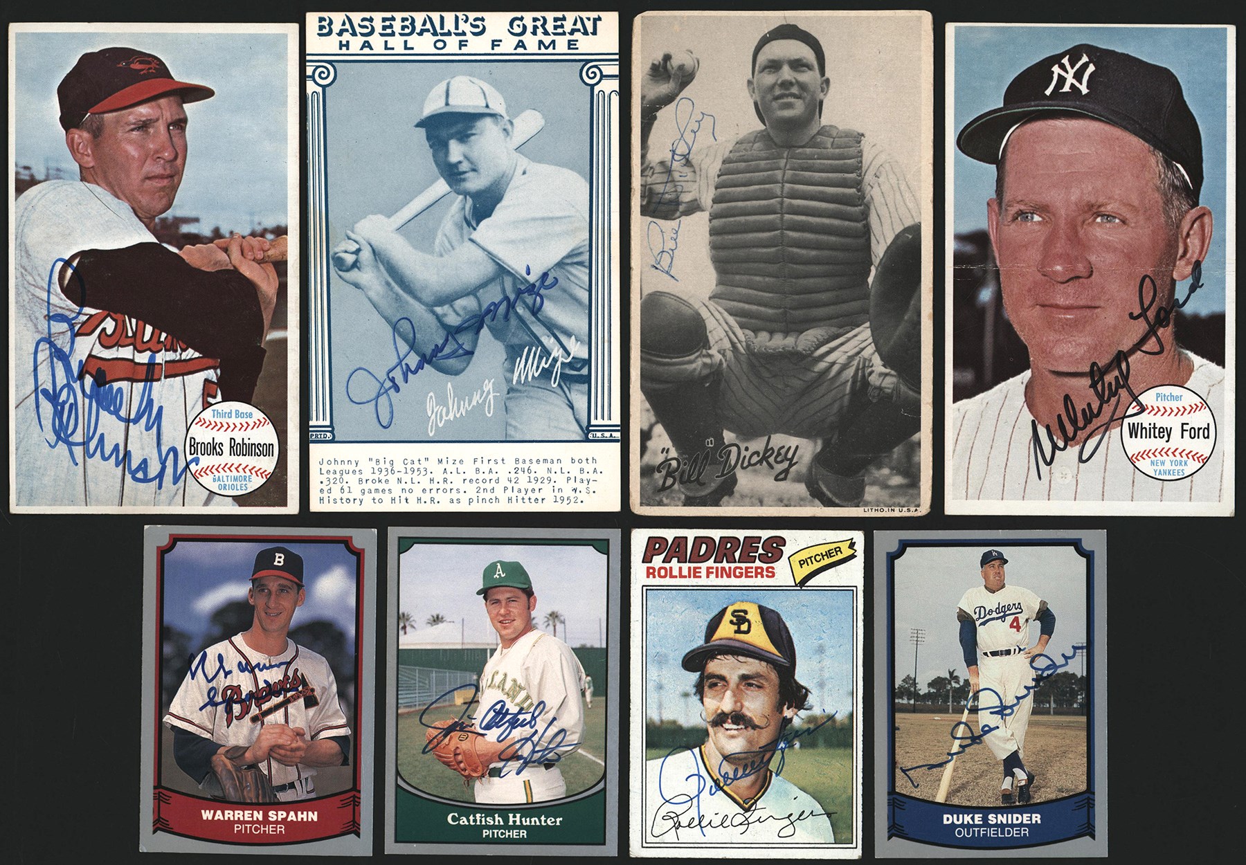Collection of sixteen baseball trade cards, spanning approximately seven decades (1930s-90s), each signed on the front by the respective player. The signatures, scripted in a variety of inks, range in grade from 6/10 to 10/10, averaging 8/10. The cards are in Excellent condition overall, except for the 1936 Goudey "Wide Pen" Premium of Bill Dickey (Fr). The Hall of Fame players represented here are as follows: Coveleski, Dickey, Doerr, Fingers, Ford, Hubbell (two examples) Hunter, Irvin (on a 1953 Topps Archives card), Kell, Mize, B. Robinson, Snider (three examples), and Spahn.