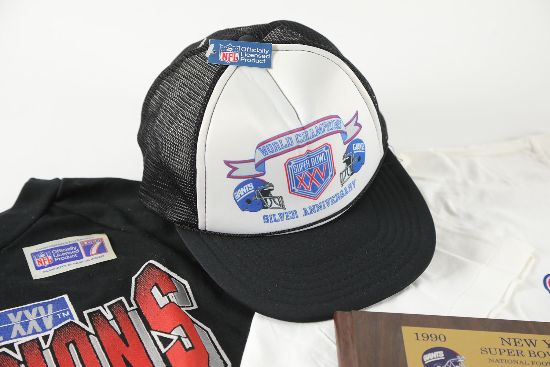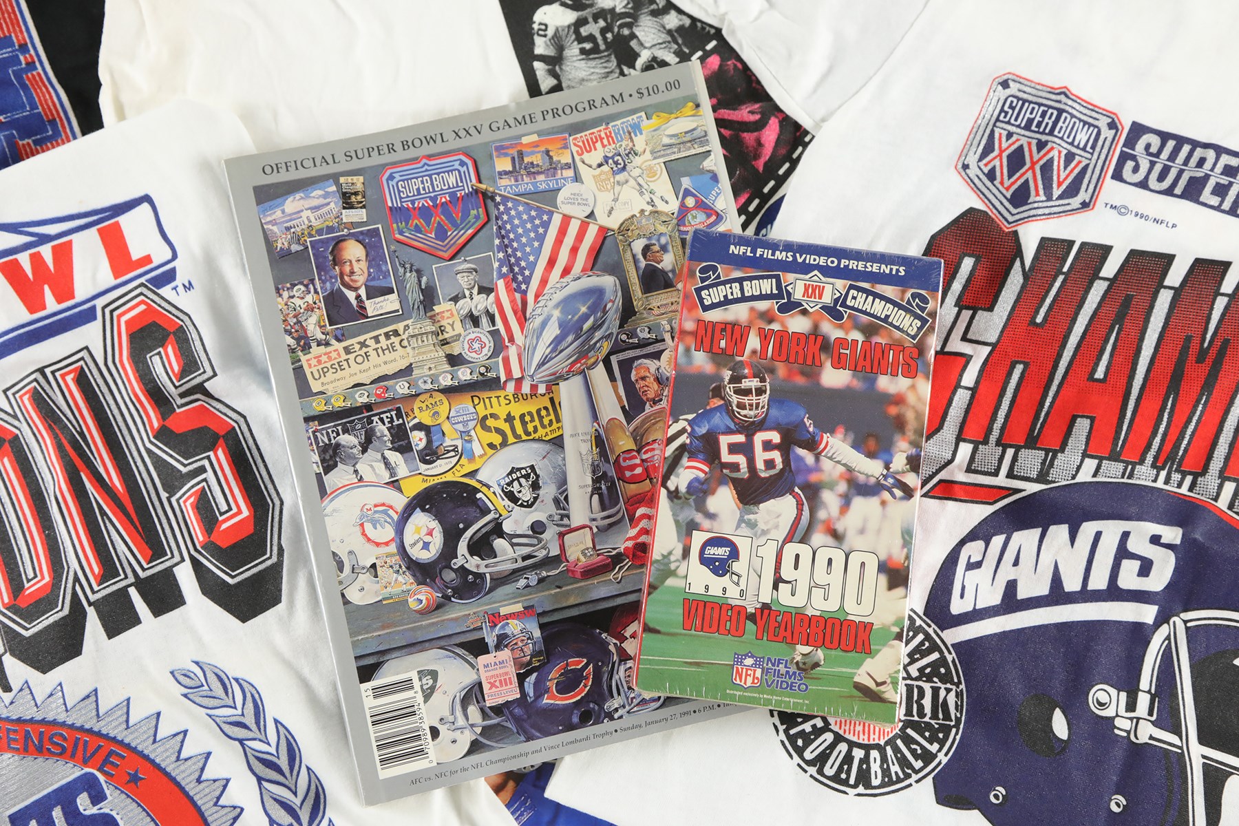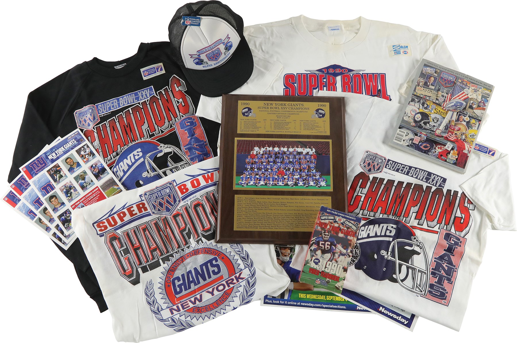 Presented is a New York Giants Super Bowl memorabilia lot. Included is the following: Super Bowl XXV wooden plaque with team photo (13x16"), Super Bowl XXV game program, Super Bowl XXV World Champions hat, Super Bowl XXV Champions VHS tape (sealed), Super Bowl XXV size large sweatshirt, 2 Super Bowl XXV short-sleeve size large t-shirts, 1 Super Bowl XXV size XXL short-sleeve t-shirt, 2004 Giants sticker collection, and three 8.75x11.75" Newsday newspaper advertisements featuring Eli Manning.