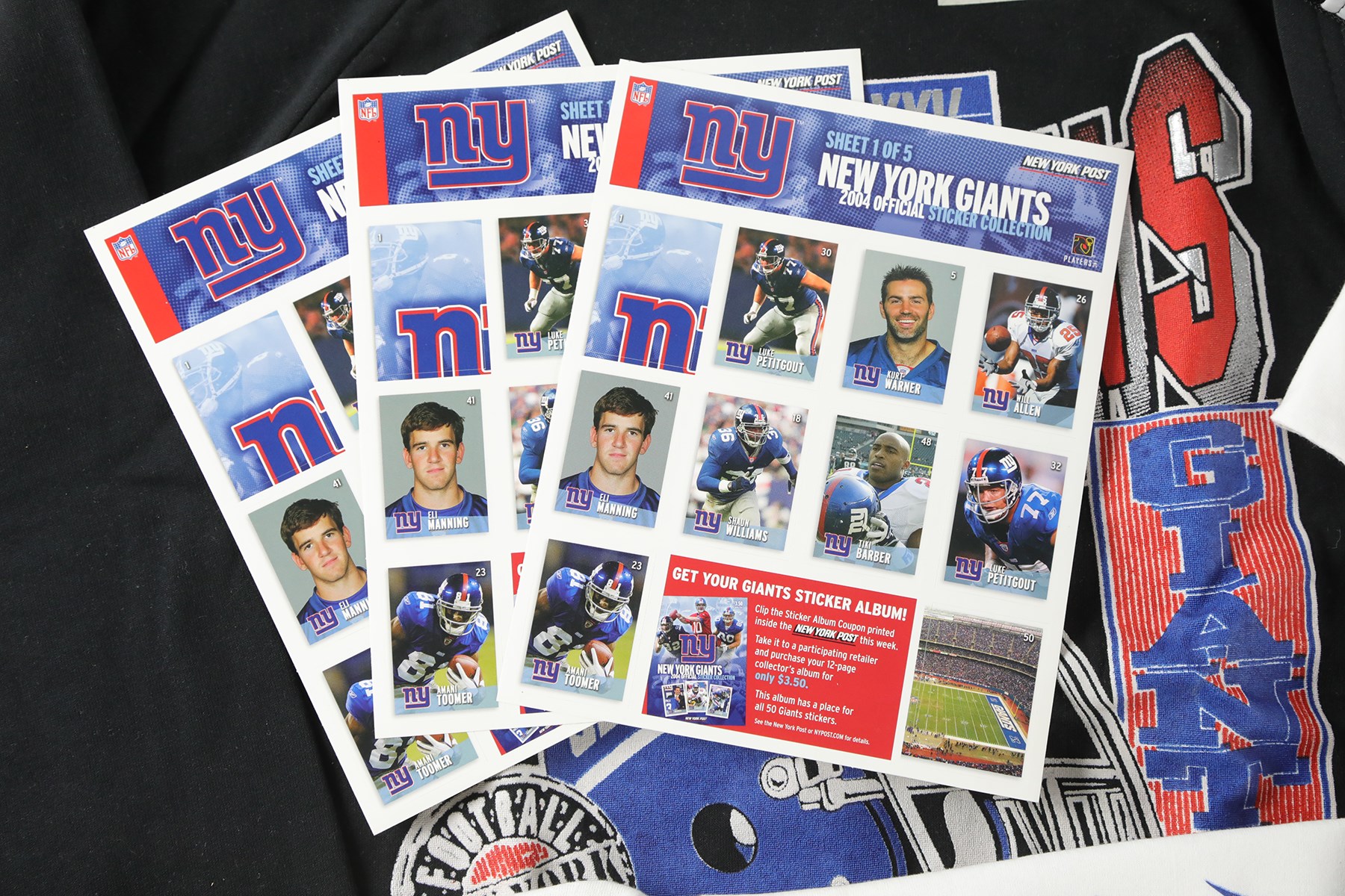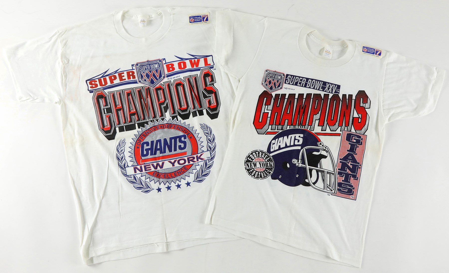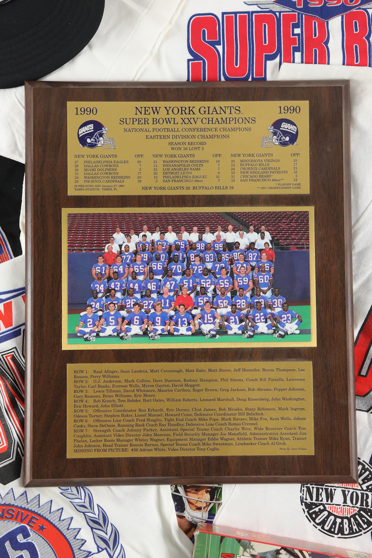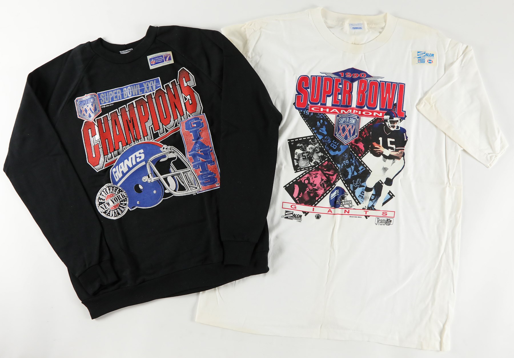 Presented is a New York Giants Super Bowl memorabilia lot. Included is the following: Super Bowl XXV wooden plaque with team photo (13x16"), Super Bowl XXV game program, Super Bowl XXV World Champions hat, Super Bowl XXV Champions VHS tape (sealed), Super Bowl XXV size large sweatshirt, 2 Super Bowl XXV short-sleeve size large t-shirts, 1 Super Bowl XXV size XXL short-sleeve t-shirt, 2004 Giants sticker collection, and three 8.75x11.75" Newsday newspaper advertisements featuring Eli Manning.