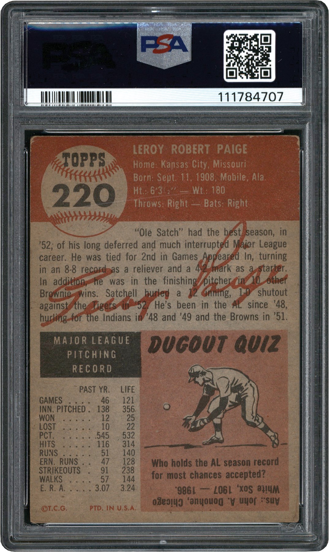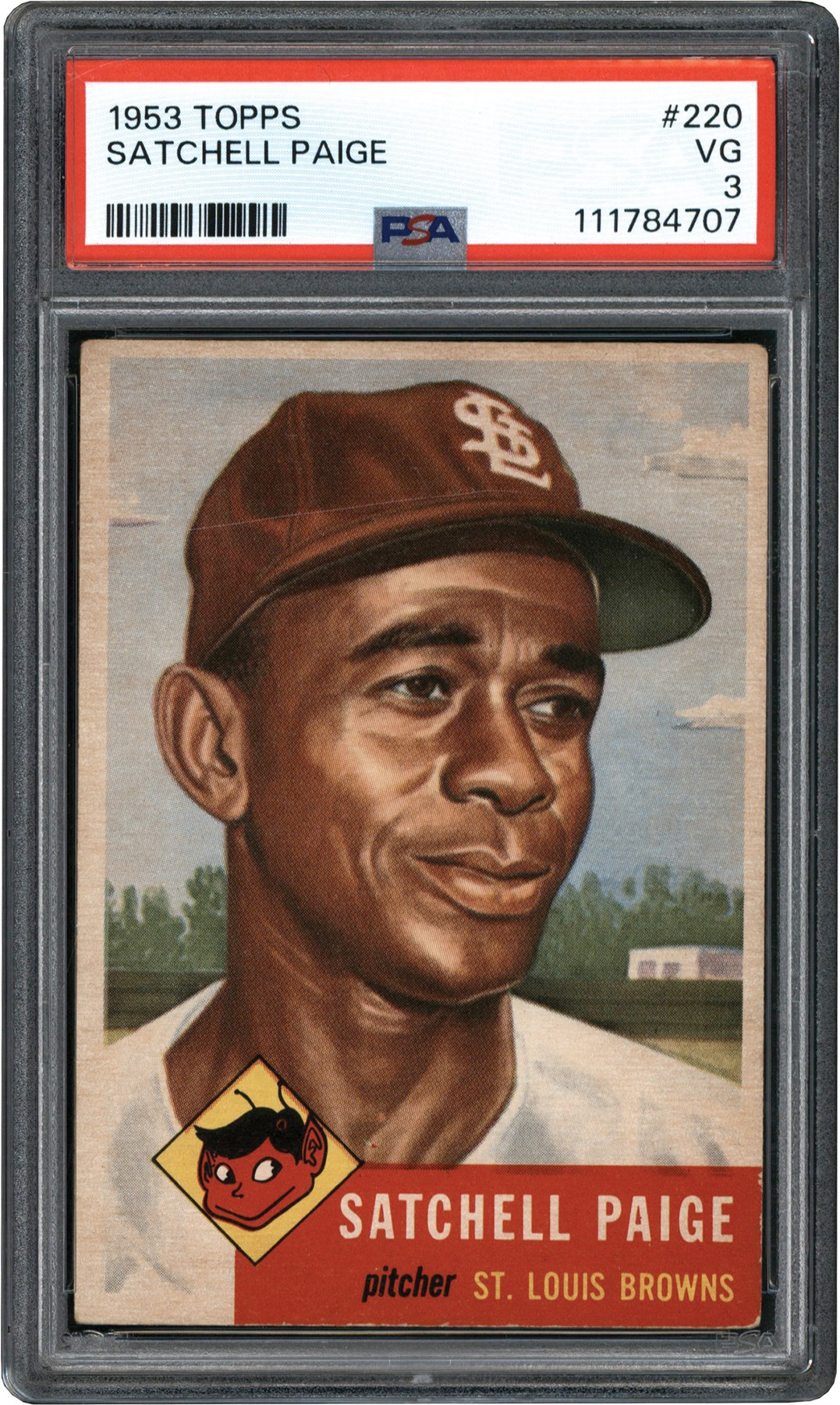 1953 Topps Baseball 220 Satchell Paige card. The card has been graded and encapsulated by PSA VG 3. It has a colorful image of a smiling Paige set against a mostly sky background. The borders are off white while the edges show areas of roughness. Centering is slightly off left to right and top to bottom. All four corners are lightly rounded. The reverse is clean.