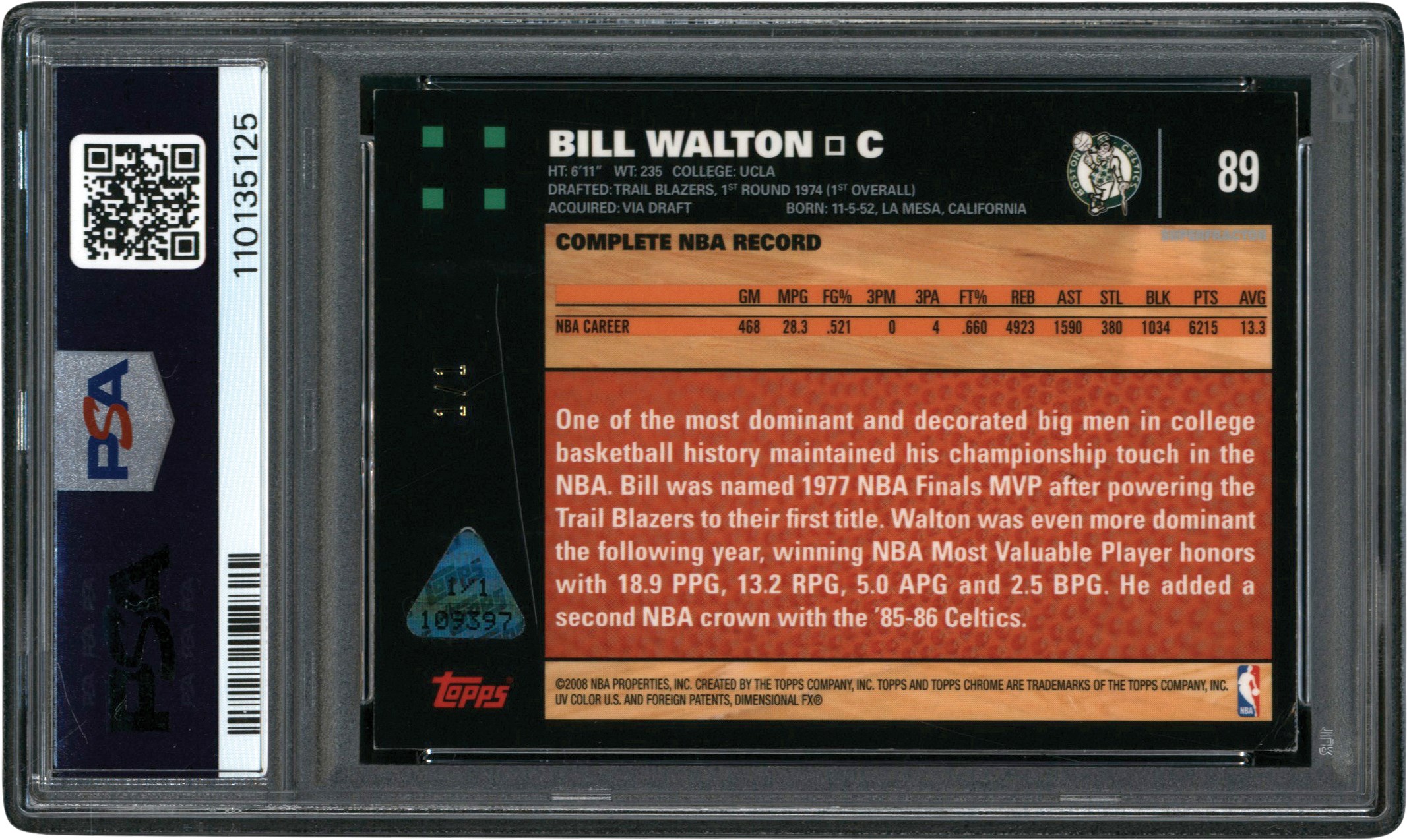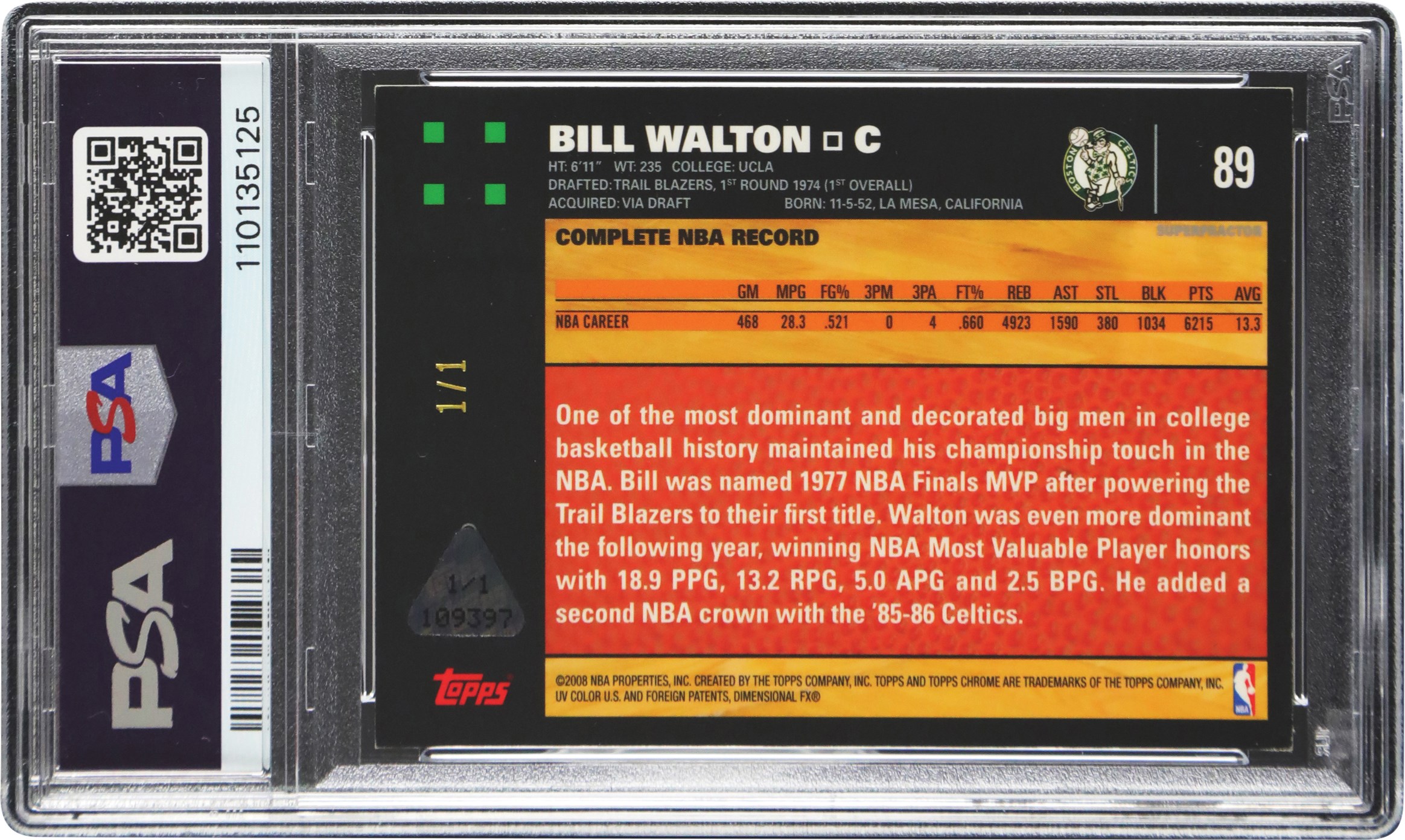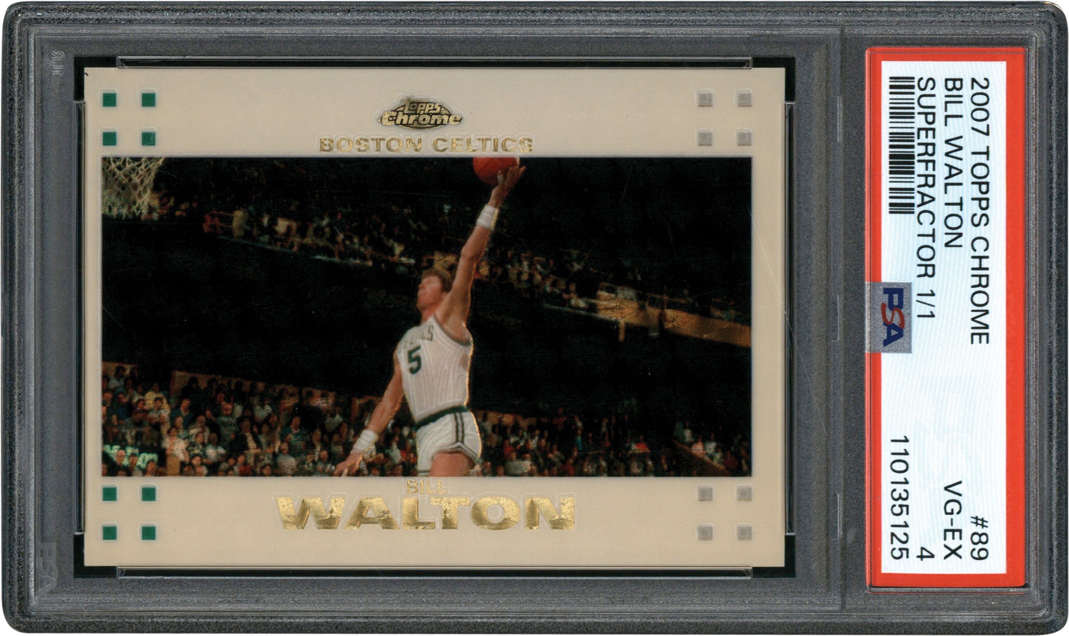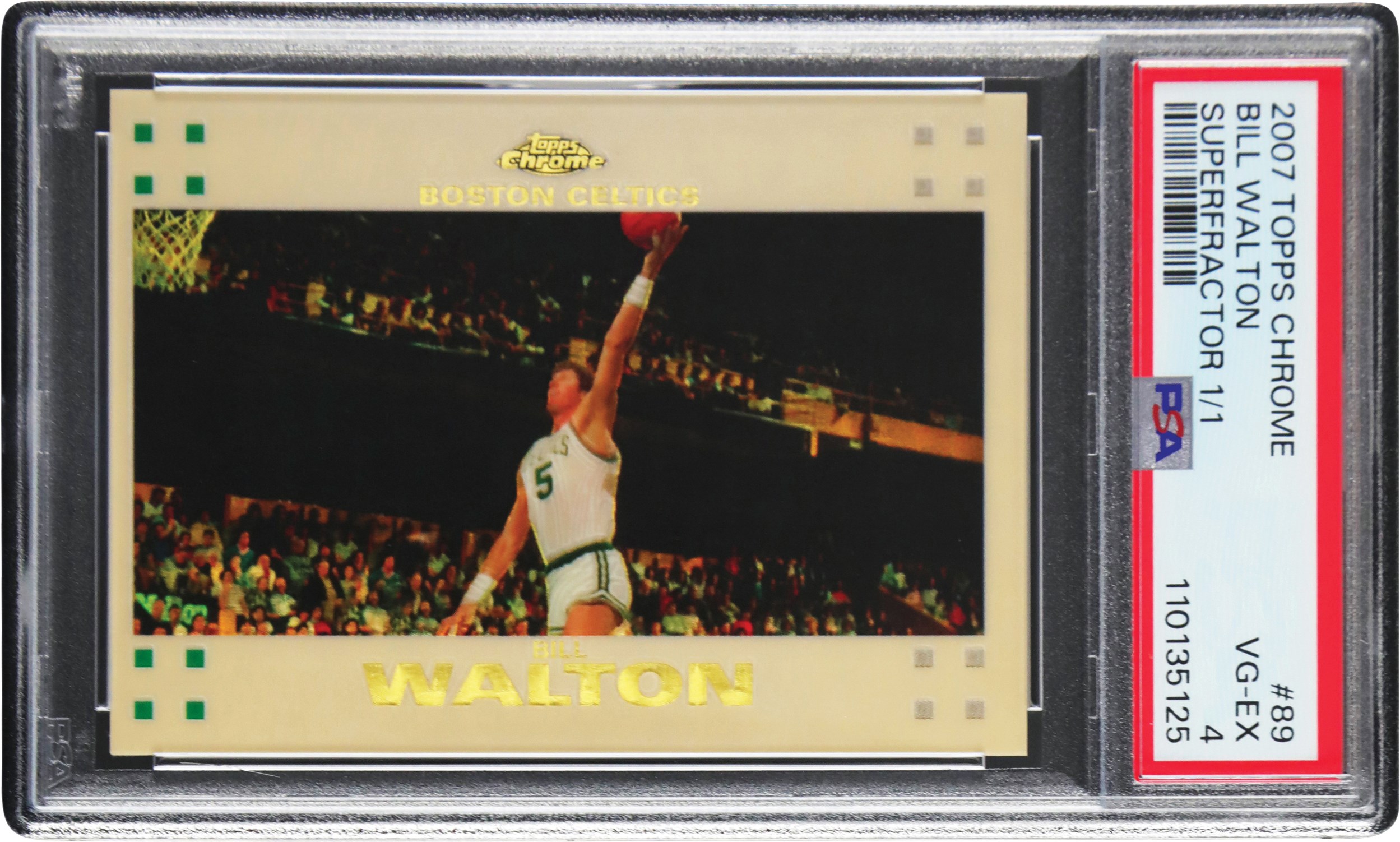 This lot features a 2007 Topps Chrome #89 Bill Walton Superfractor 1/1 card. This card has been graded and encapsulated by PSA VG-EX 4. The Superfractor is the rarest parallel from Topps as they are serial numbered 1 of 1 (one of a kind) and features the gold vinyl parallel look to the card. These cards are extremely sought after by collectors and are becoming more popular by the day. These Superfractors do not come around often so now is a chance to get your hands on a Hall of Famer Superfractor card. The back bottom right corner has wear and a crease which is the reason for the VG-EX 4 grade from PSA. This card is hobby fresh and was submitted to PSA by Lelands in March 2025.