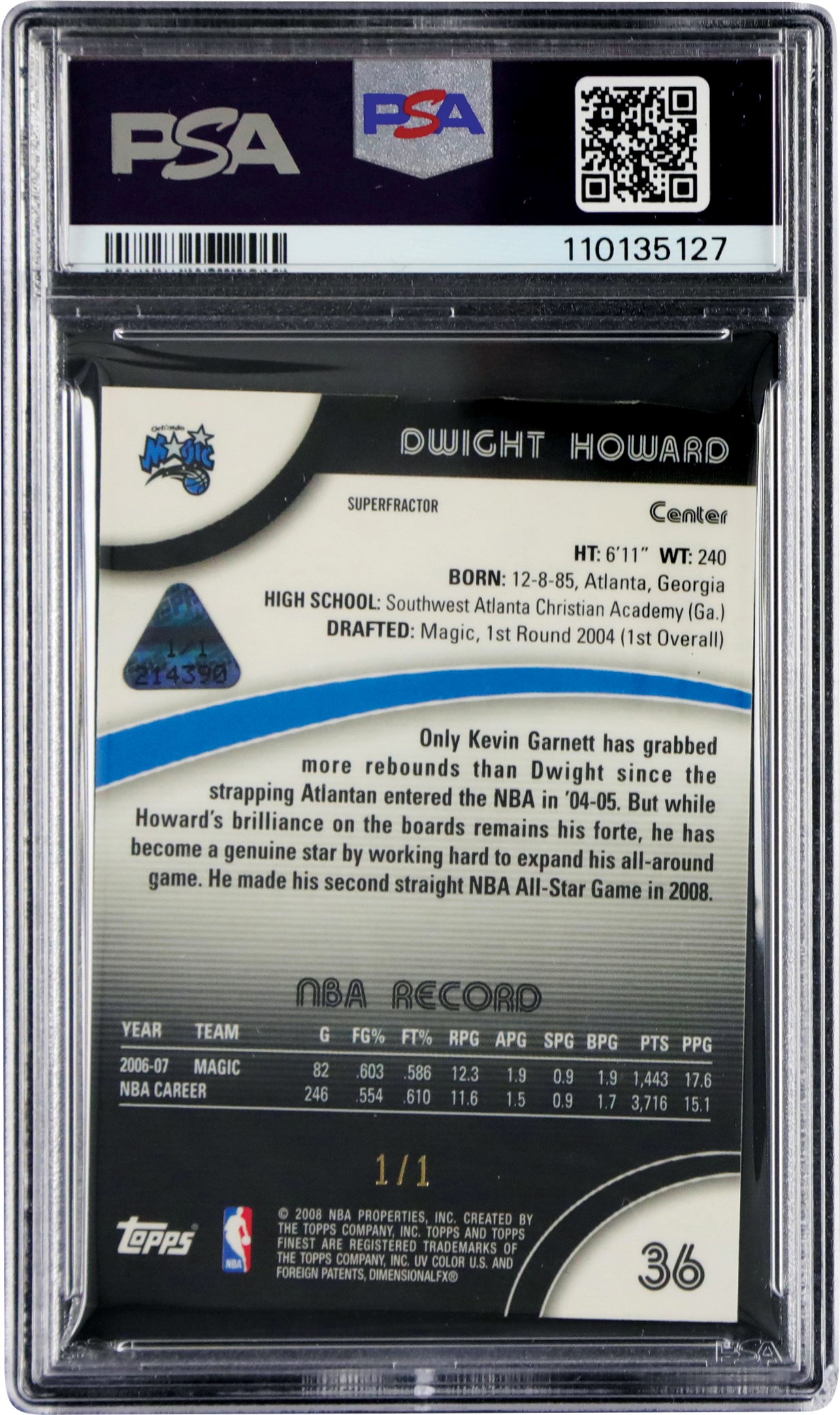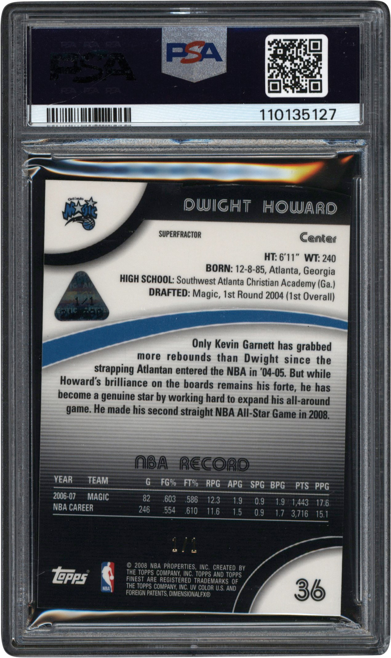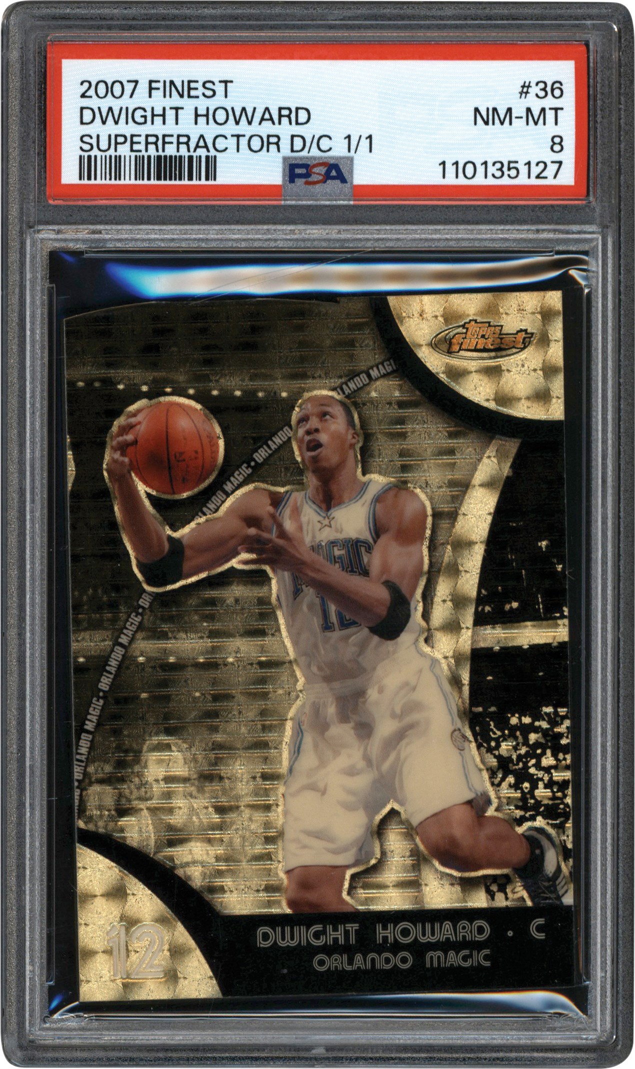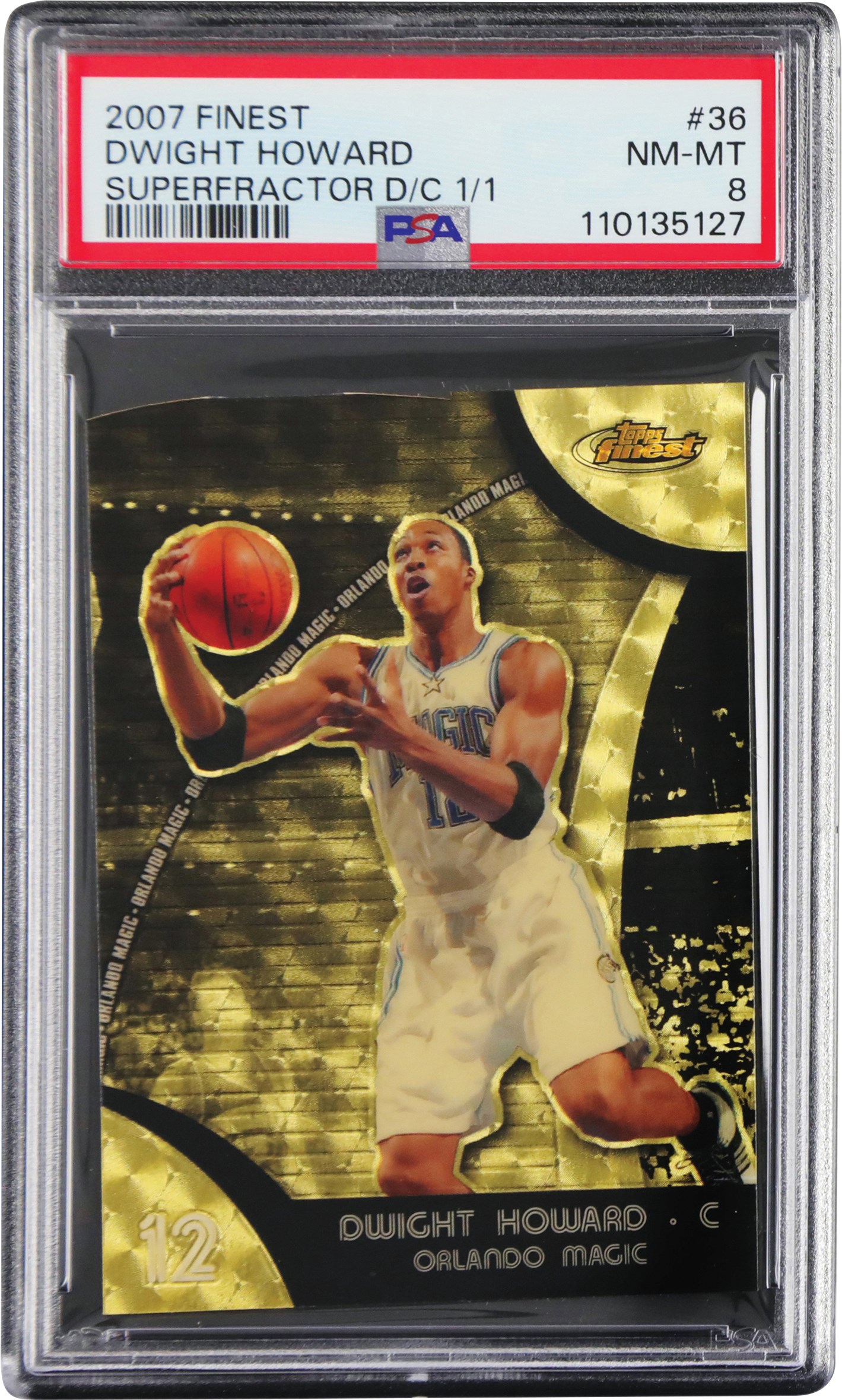 This lot features a 2007 Topps Finest #36 Dwight Howard Superfractor Die-Cut 1/1 card. This card has been graded and encapsulated by PSA NM-MT 8. The Superfractor is the rarest parallel from Topps as they are serial numbered 1 of 1 (one of a kind) and features the gold vinyl parallel look to the card. These cards are extremely sought after by collectors and are becoming more popular by the day. These Superfractors do not come around often so now is a chance to get your hands on a Hall of Famer Superfractor card. This card is hobby fresh and was submitted to PSA by Lelands in March 2025.