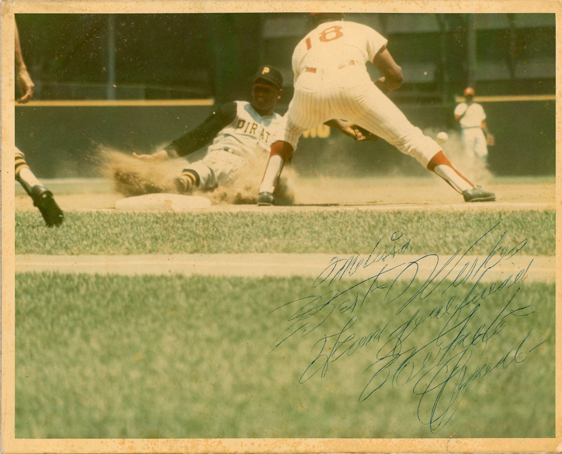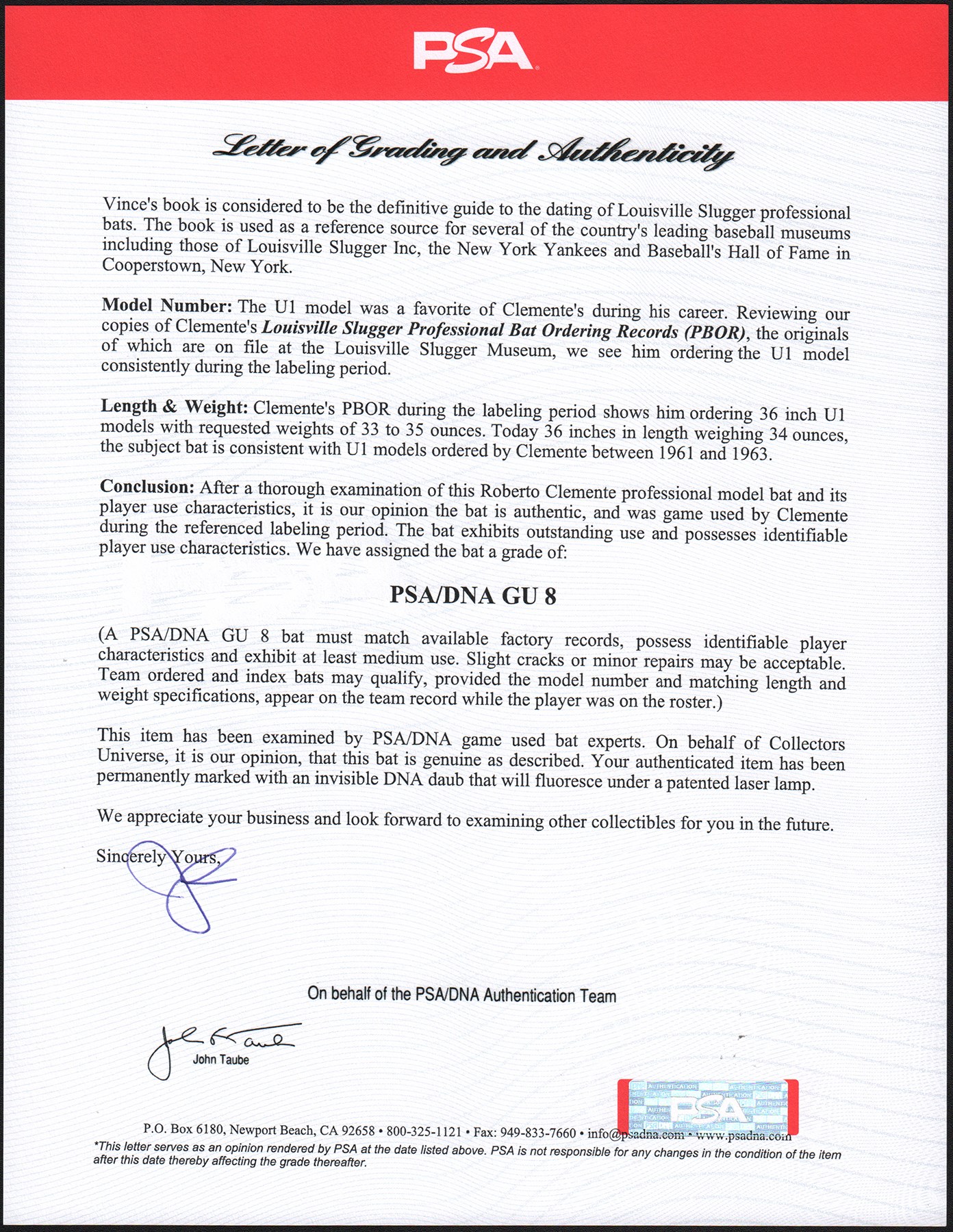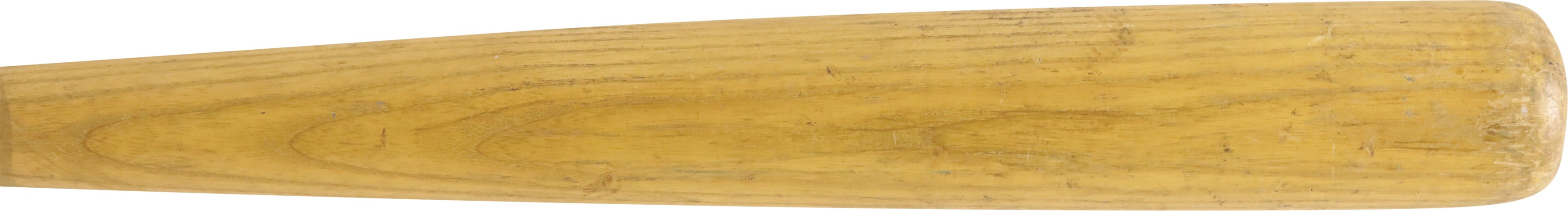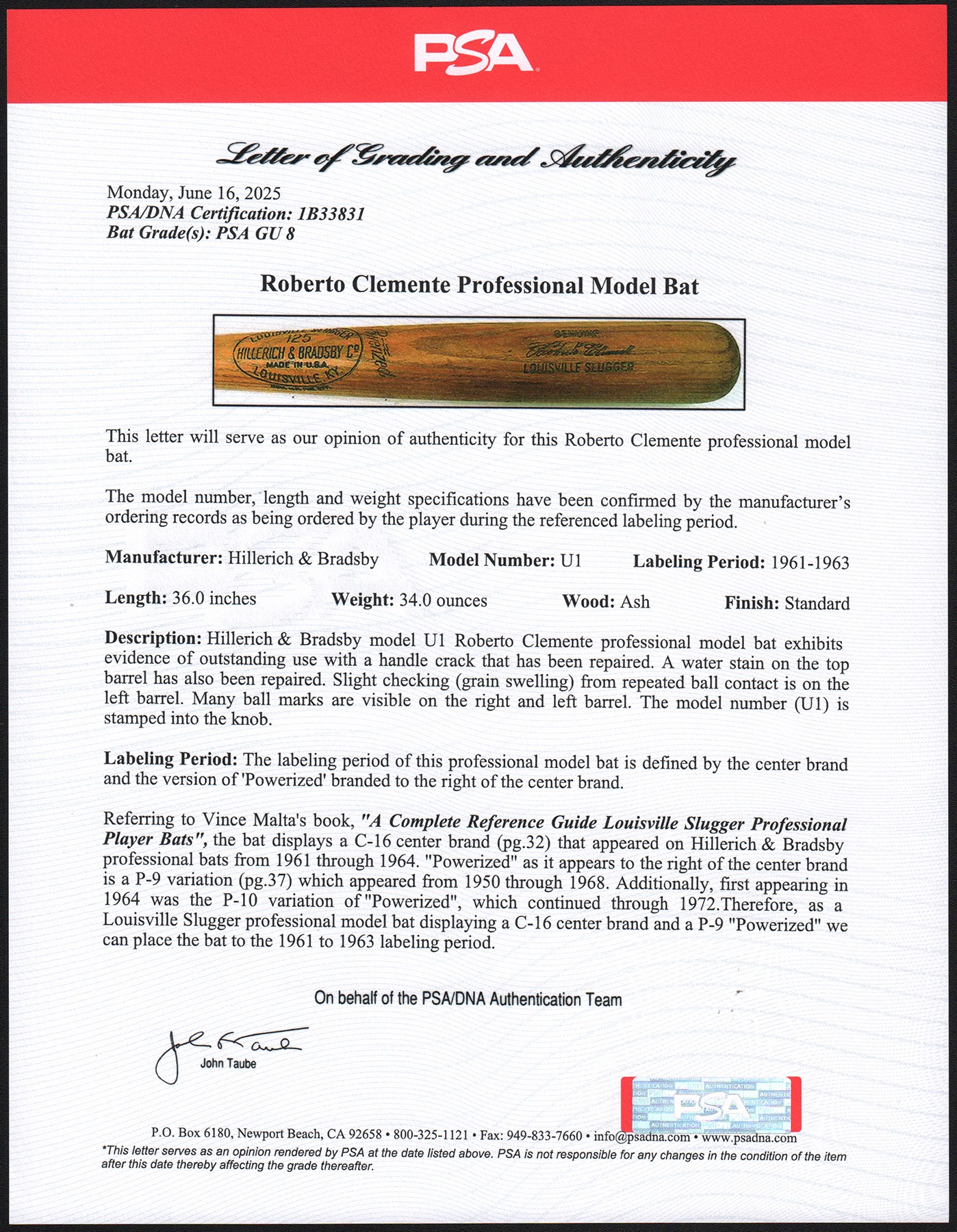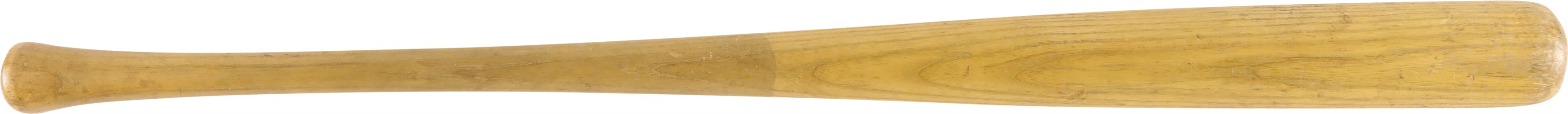 Circa 1965-69 Roberto Clemente Pittsburgh Pirates game used bat. Hillerich and Bradsby model G105 ash bat is 36" long and weighs a hefty 35.6 ounces. The uncracked bat shows terrific use with ball strikes along the barrel, minor paint transfer and general wear. Clemente's number 21 is written onto the knob of the bat in red marker, though it is faded, and "U1" is also stamped. Outstanding provenance accompanies this Hall of Fame gem, as our consignor had seats next to the Pirates' home dugout and became good friends, resulting in this bat being gifted to her. As further authentication, our consignor has presented a personalized autographed photo of Pittsburgh's legend (please note that the photo is for illustrative purposes only and is not included with this lot). Some tremendous accomplishments were part of the five-year span covered by this labeling period, including: Roberto's 1966 National League MVP season; league-leading totals of 209 hits with a .357 average in '67; and Gold Glove awards in all five seasons, adding to his astounding career total of 12. He was tragically killed in a 1972 plane crash while on a relief mission. The .317 career hitter was inducted into the Baseball Hall of Fame in 1973 in a special election. Includes a Letter of Authenticity from PSA/DNA verifying the bat's use as a GU 8.