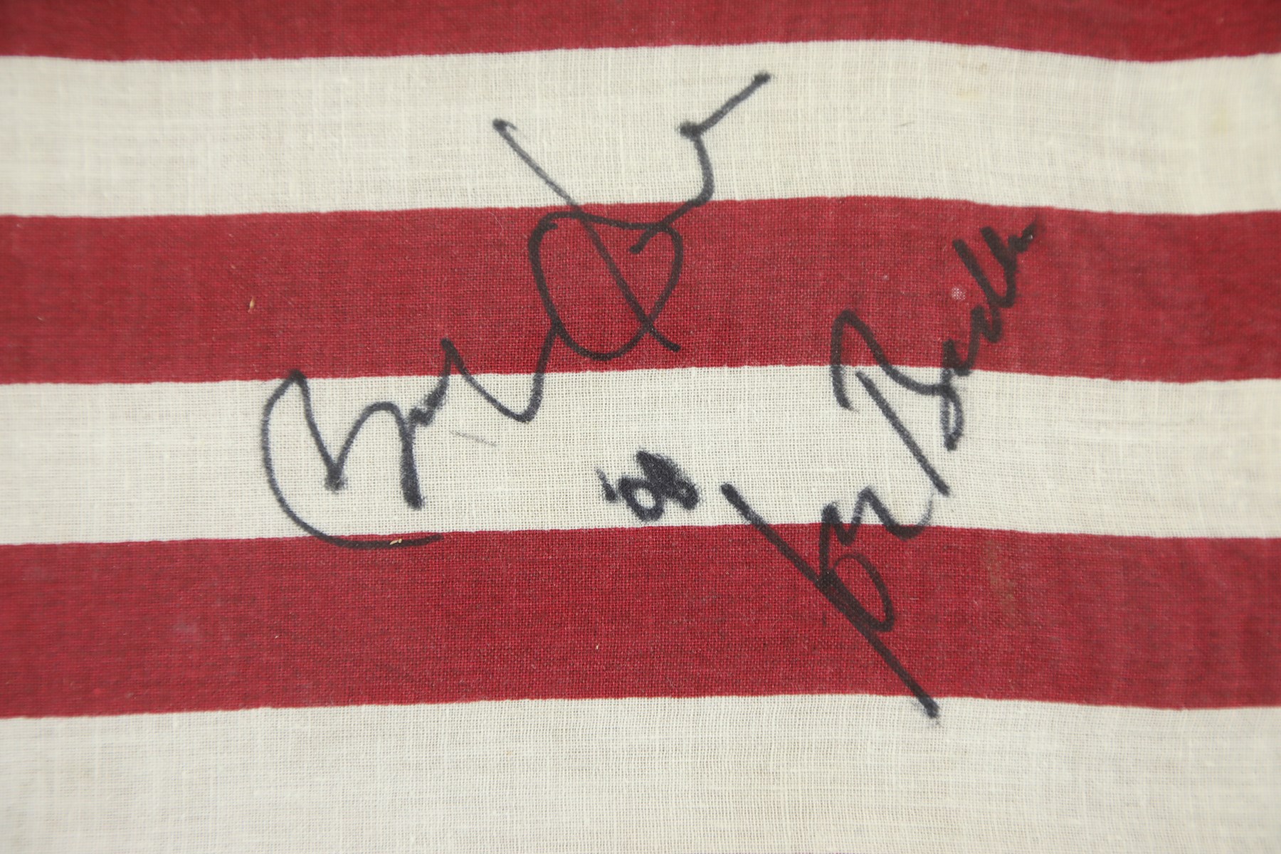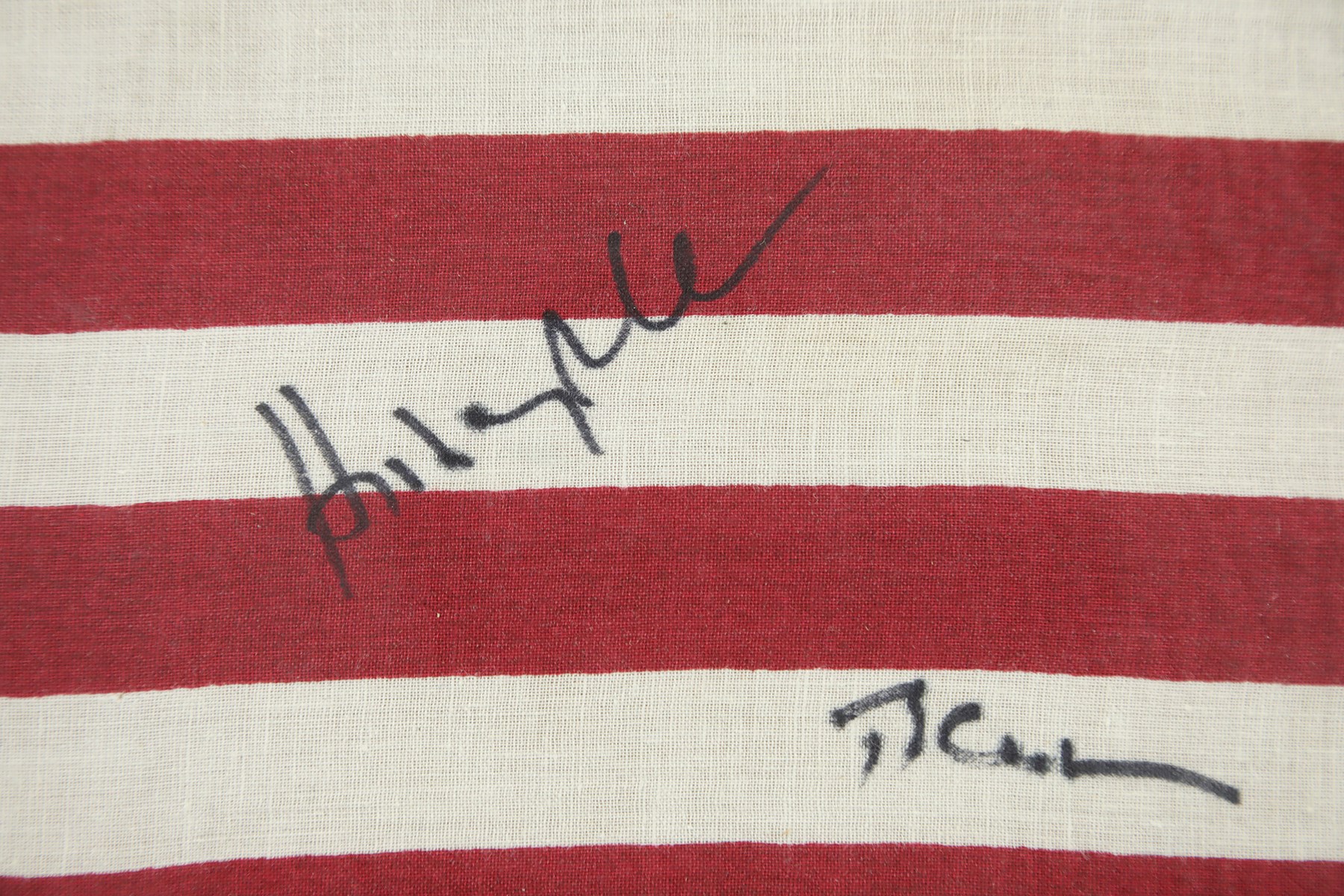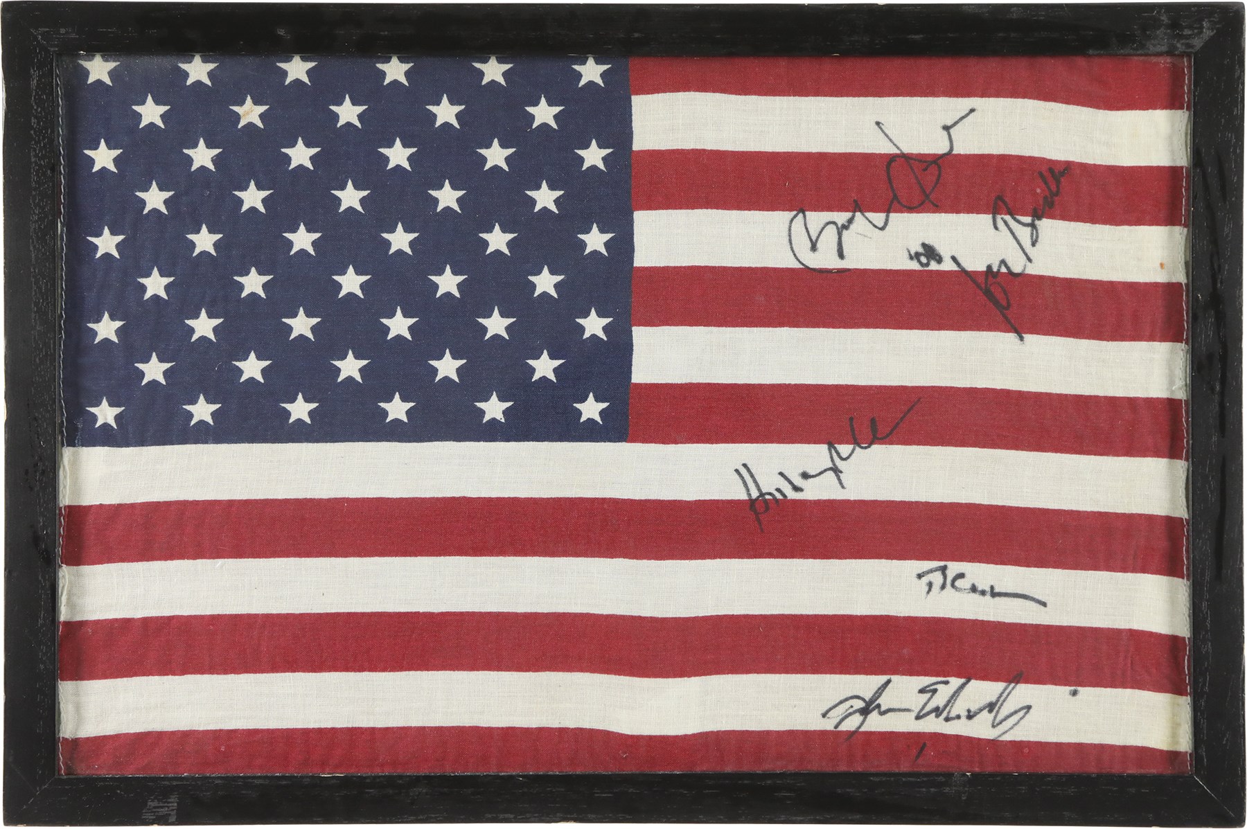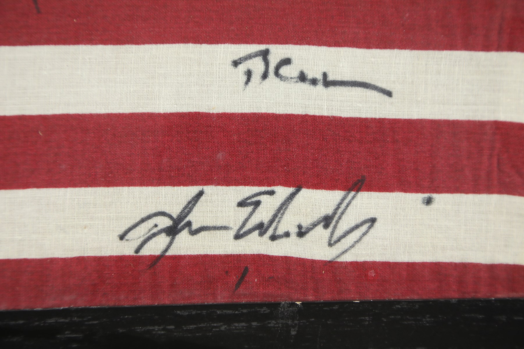 American flag signed by Barack Obama, Joe Biden, Bill Clinton, Hillary Clinton, and John Edwards. Signed by three former United States Presidents (Obama, Biden, and B. Clinton), a former First Lady, (H. Clinton) and former U.S. Senator (Edwards), this flag measures 16.25x10.5" and is housed in a black wooden frame. Each person signed the cloth flag with a black Sharpie maker. The flag is in excellent condition. Full LOA from PSA.