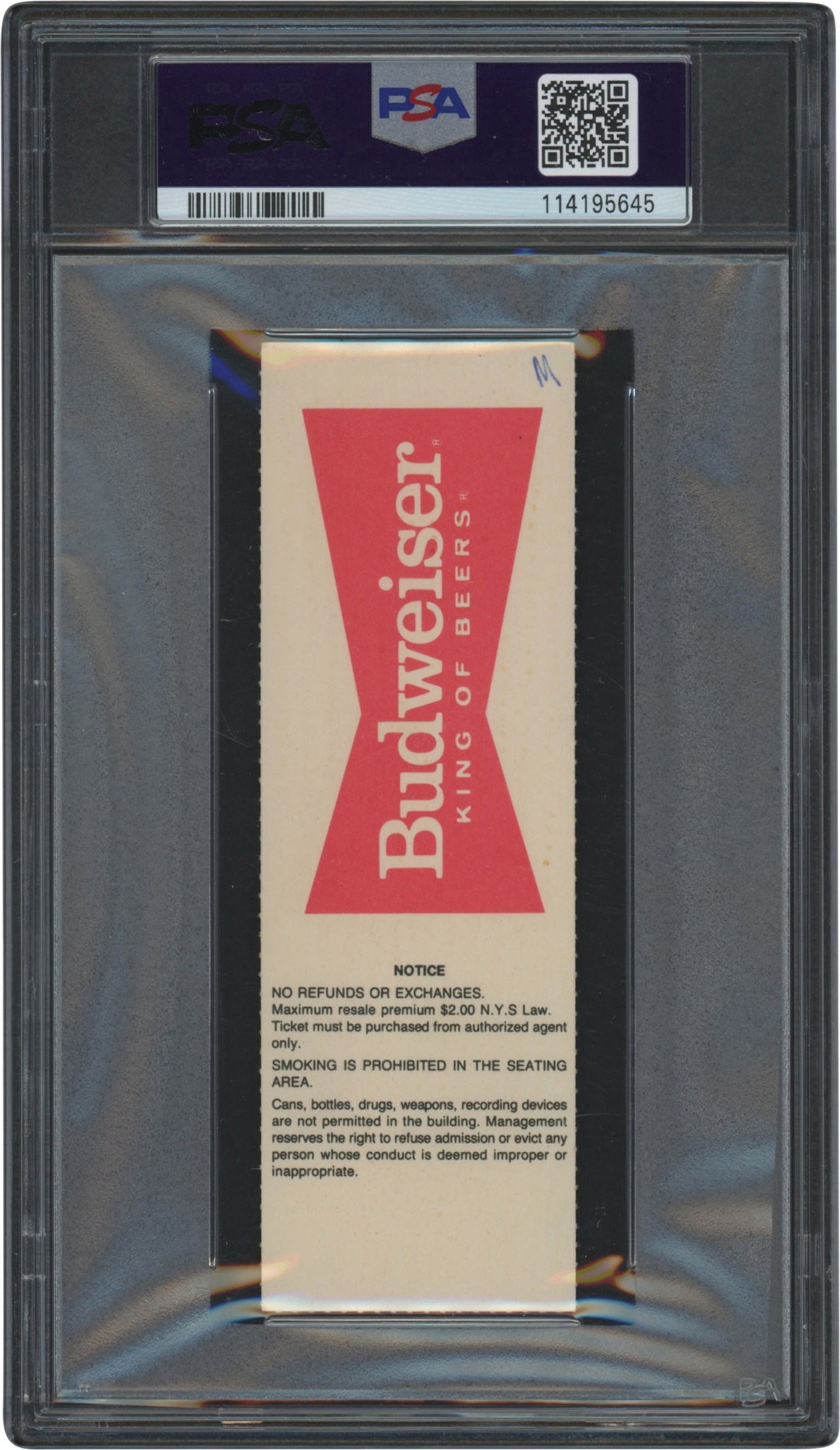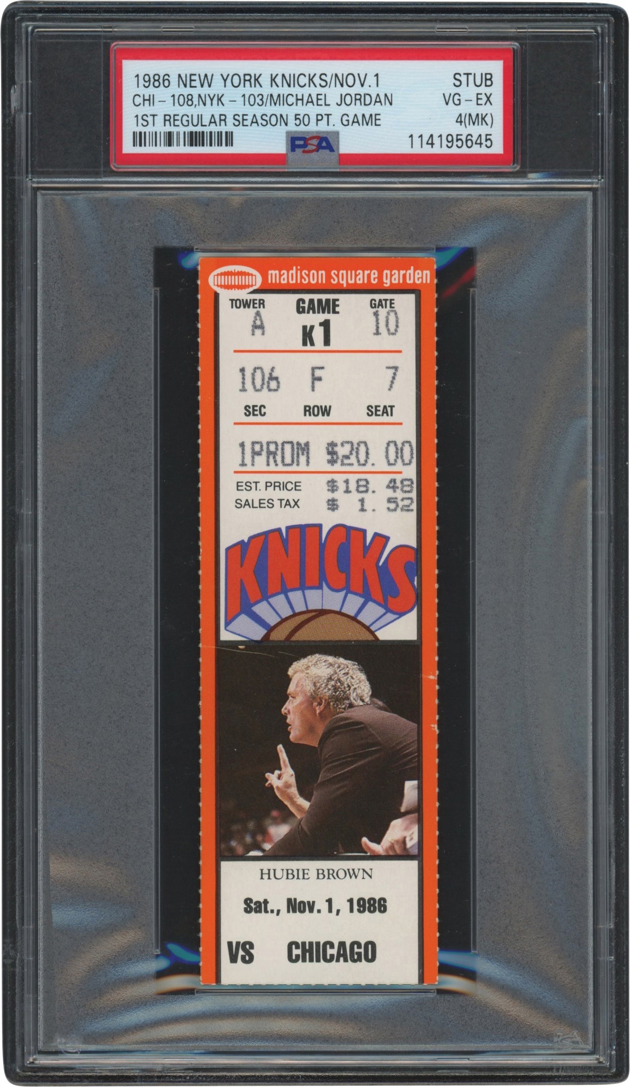 The ticket stub measures 1.5x4.75". It reads, in part, "Madison Square Garden/GAME k1/1PROM $20.00/KNICKS/Hubie Brown/Sat., Nov. 1, 1986." The stub has been encapsulated and PSA graded "VG-EX 504(MK)." The offering makes a fine remembrance of when Jordan, in the minds of many the pro basketball G.O.A.T., first dropped 50 at least points in the regular season.