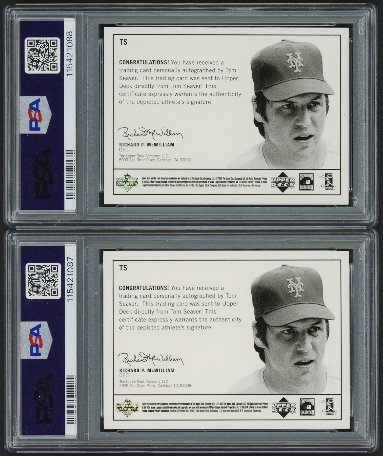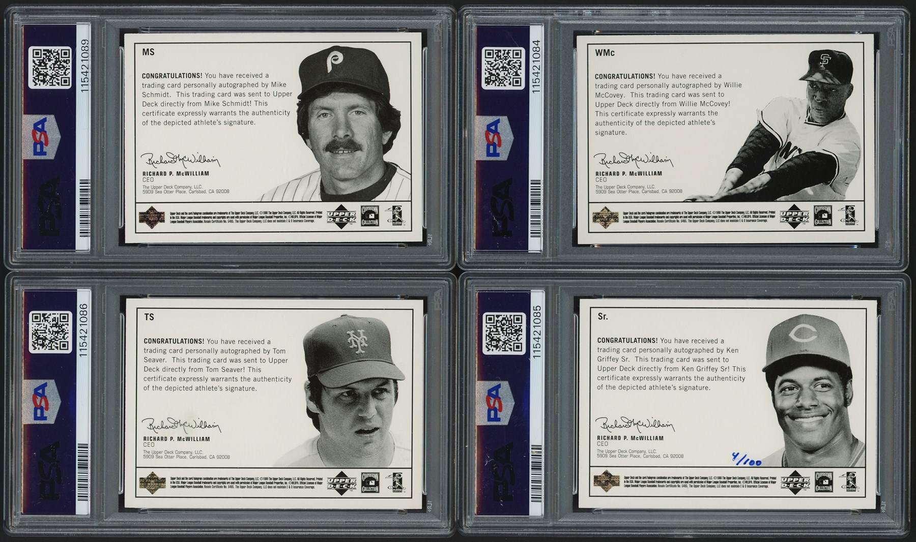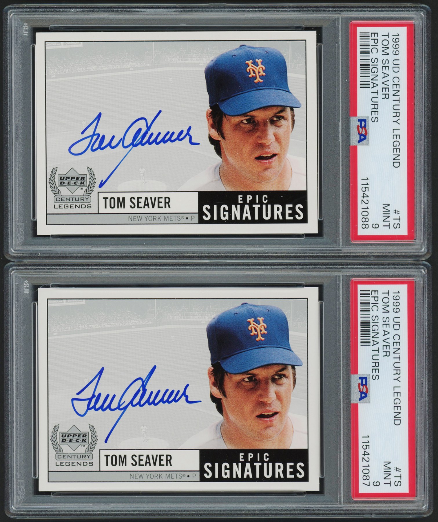 This lot features a collection of (32) 1999 Upper Deck Century Legends Century & Epic Signature cards. (6) cards have been graded and encapsulated by PSA including: #MS Mike Schmidt Epic Signatures PSA NM-MT 8; #Sr Ken Griffey Sr. Epic Signature - Century Collection #4/199 PSA NM-MT 8; (3) #TS Tom Seaver Epic Signatures PSA MINT 9; and #WMc Willie McCovey Epic Signatures - Century Collection #24/100 PSA NM-MT 8.
