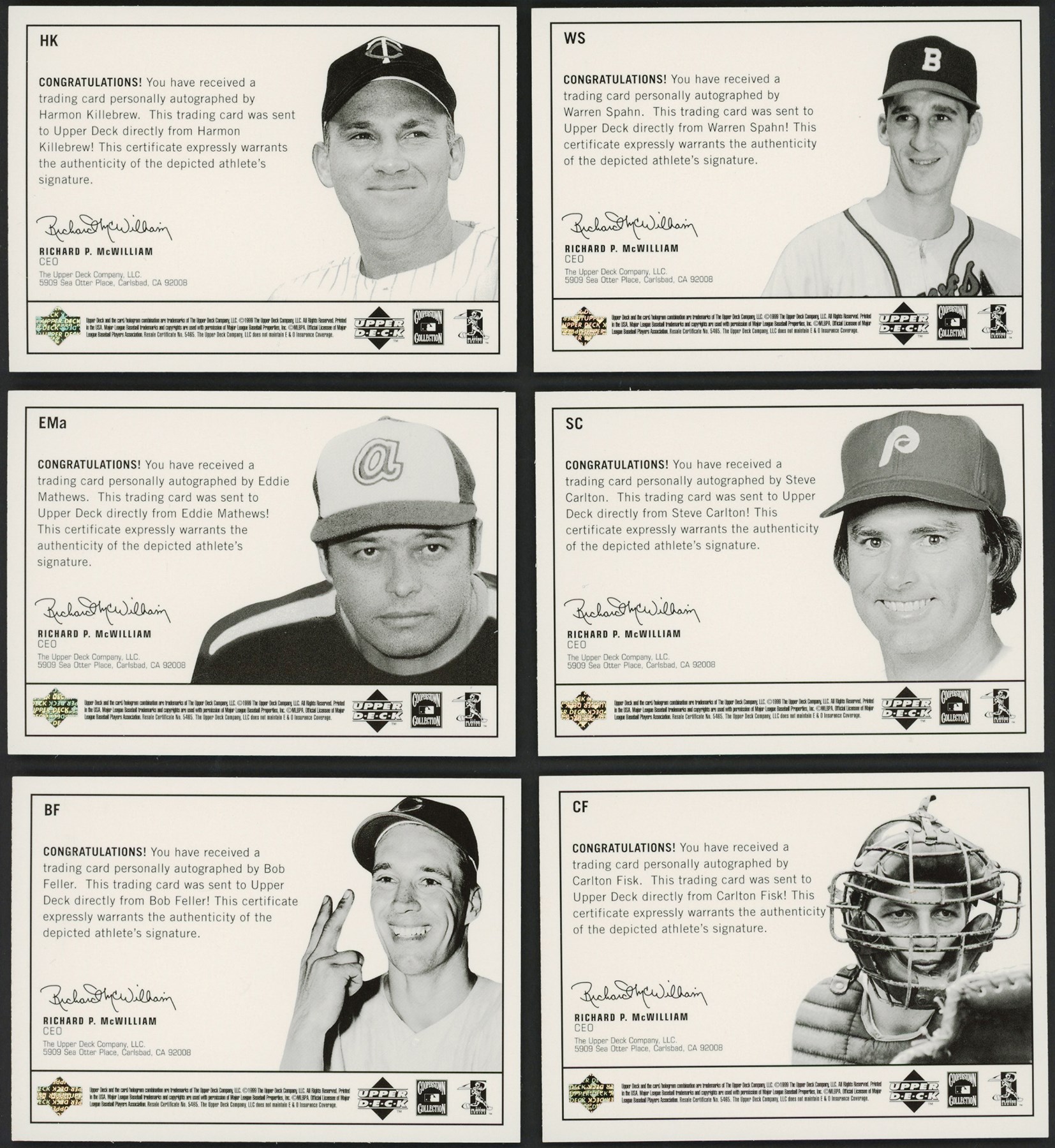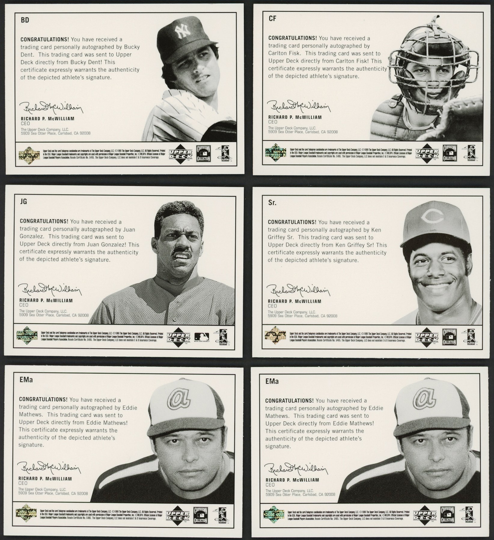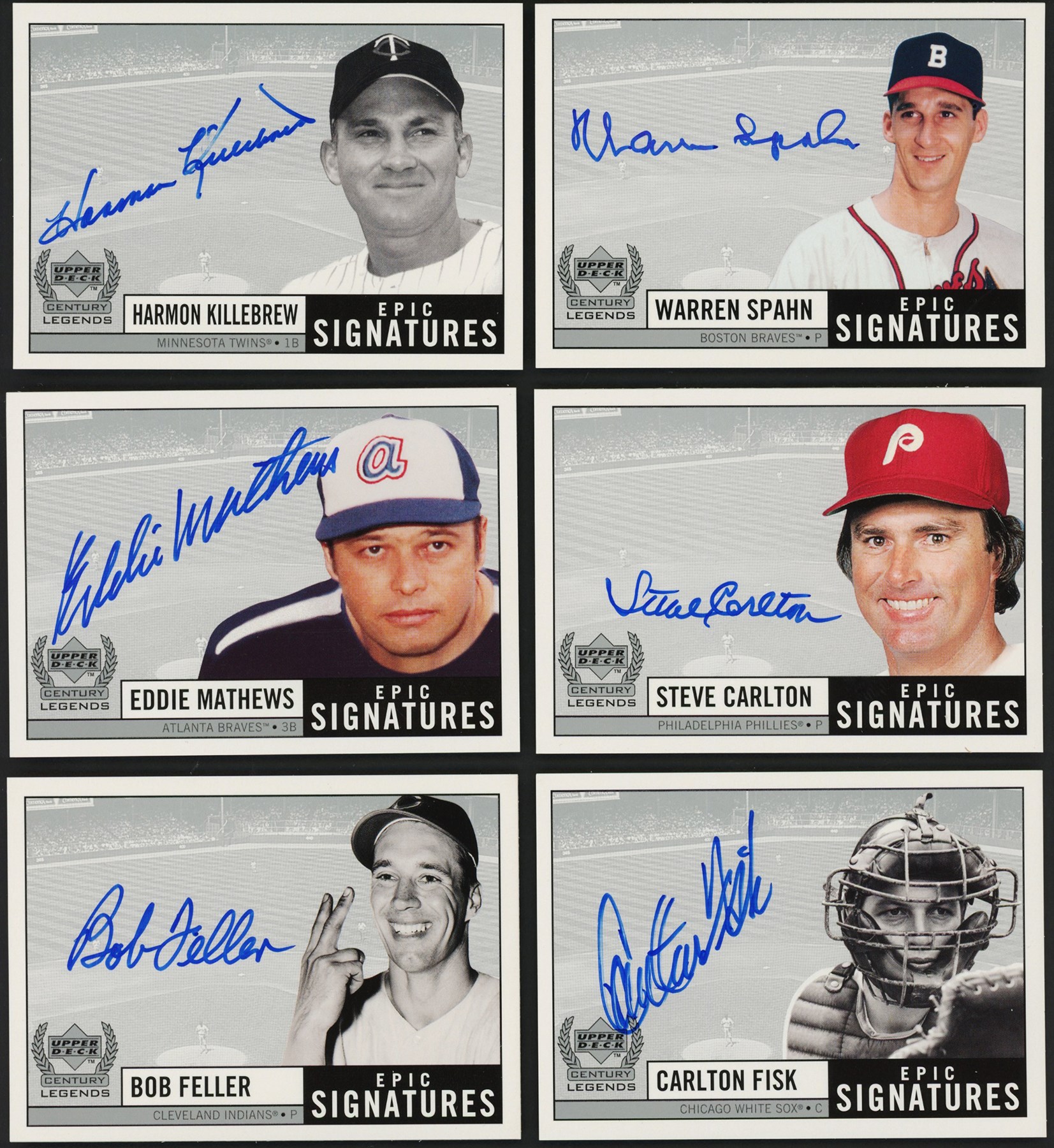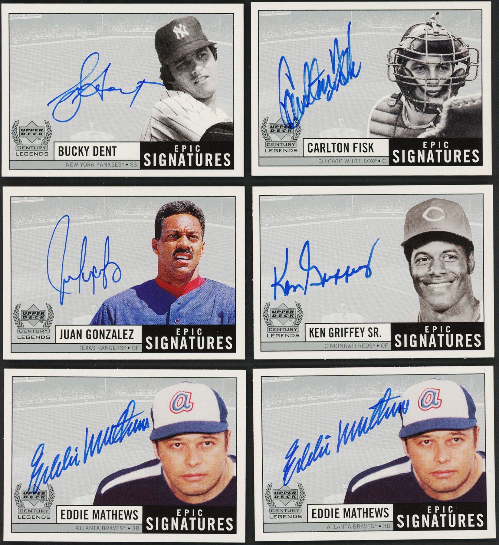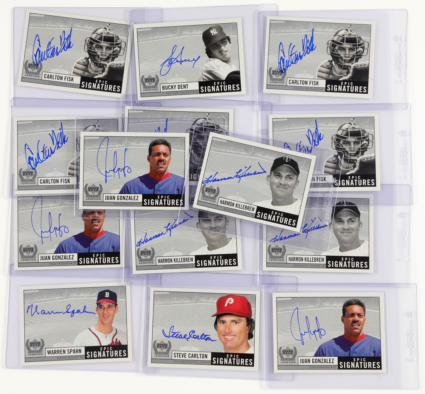 Raw highlights include: (2) #BD Bucky Dent Epic Signatures; #BF Bob Feller Epic Signatures; (7) #CF Carlton Fisk Epic Signatures; (3) #EMa Eddie Mathews Epic Signatures; (4) #HK Harmon Killebrew Epic Signatures; (4) #JG Juan Gonzalez Epic Signatures; (2) #SC Steve Carlton Epic Signatures; #Sr Ken Griffey Sr. Epic Signatures; and (2) #WS Warren Spahn Epic Signatures.