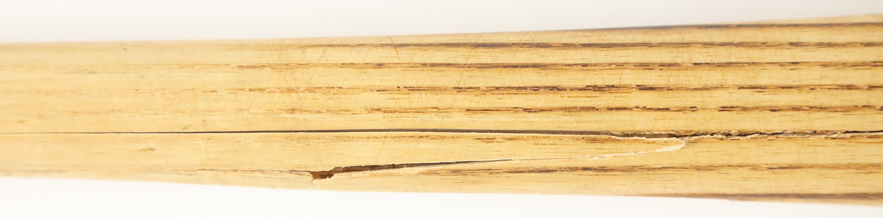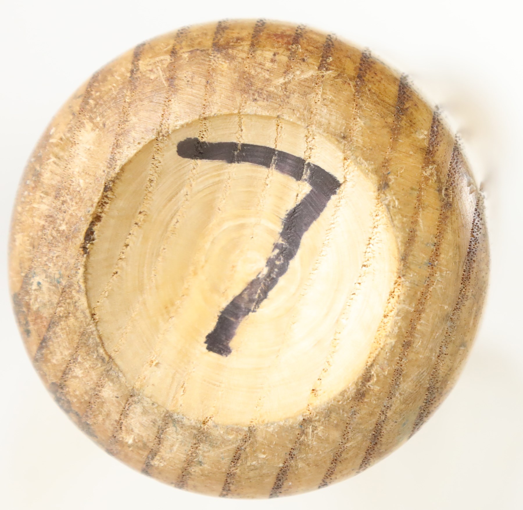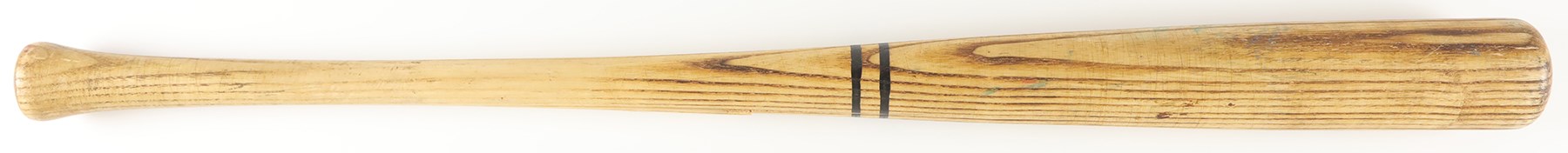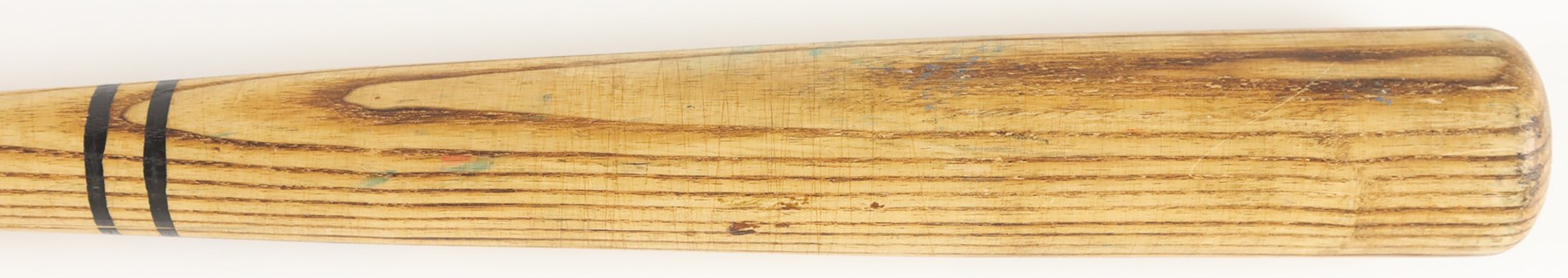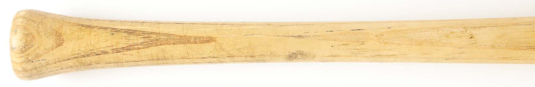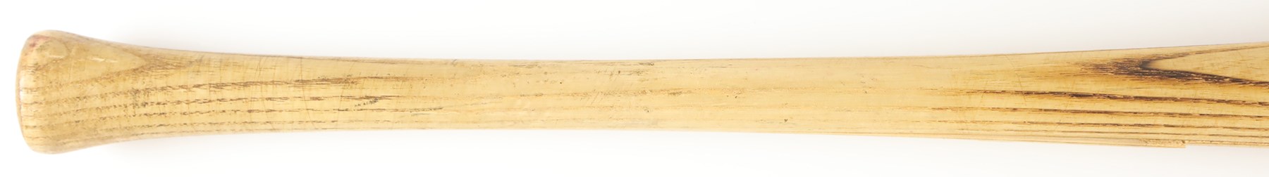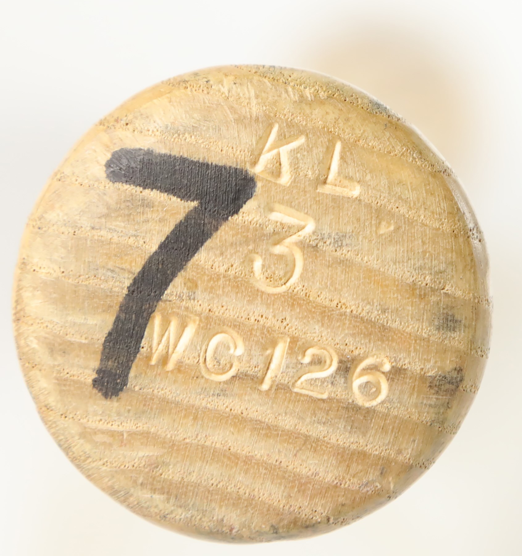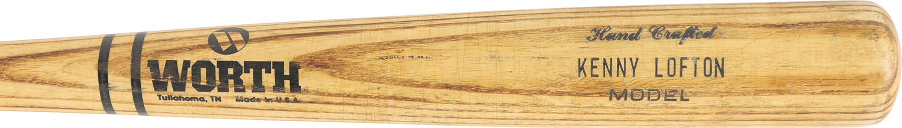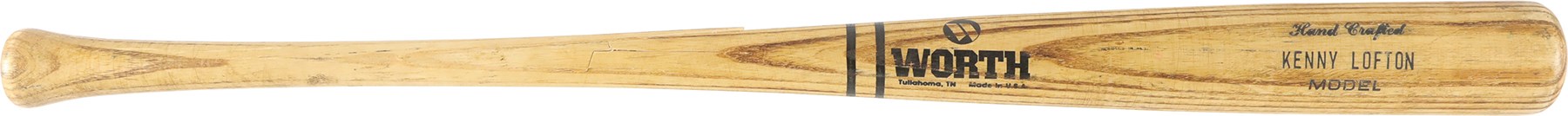 The offered game used bat is a Worth bat, made in Tullahoma, Tennessee. Etched onto the barrel is "Hand Crafted/KENNY LOFTON Model." The bat has a hollowed-out barrel end, with "7" in the barrel end, printed in black marker by an unknown hand. Etched on the handle tip is "K L 3 WO126." Also on the handle tip is "7" printed in black marker by an unknown hand. The bat has a length of 33" and a weight of 30 ounces. The bat has a number of unrepaired cracks on the high handle. The offering also shows good use, with scrapes, a few tiny stains, ball marks, and paint transfers.
