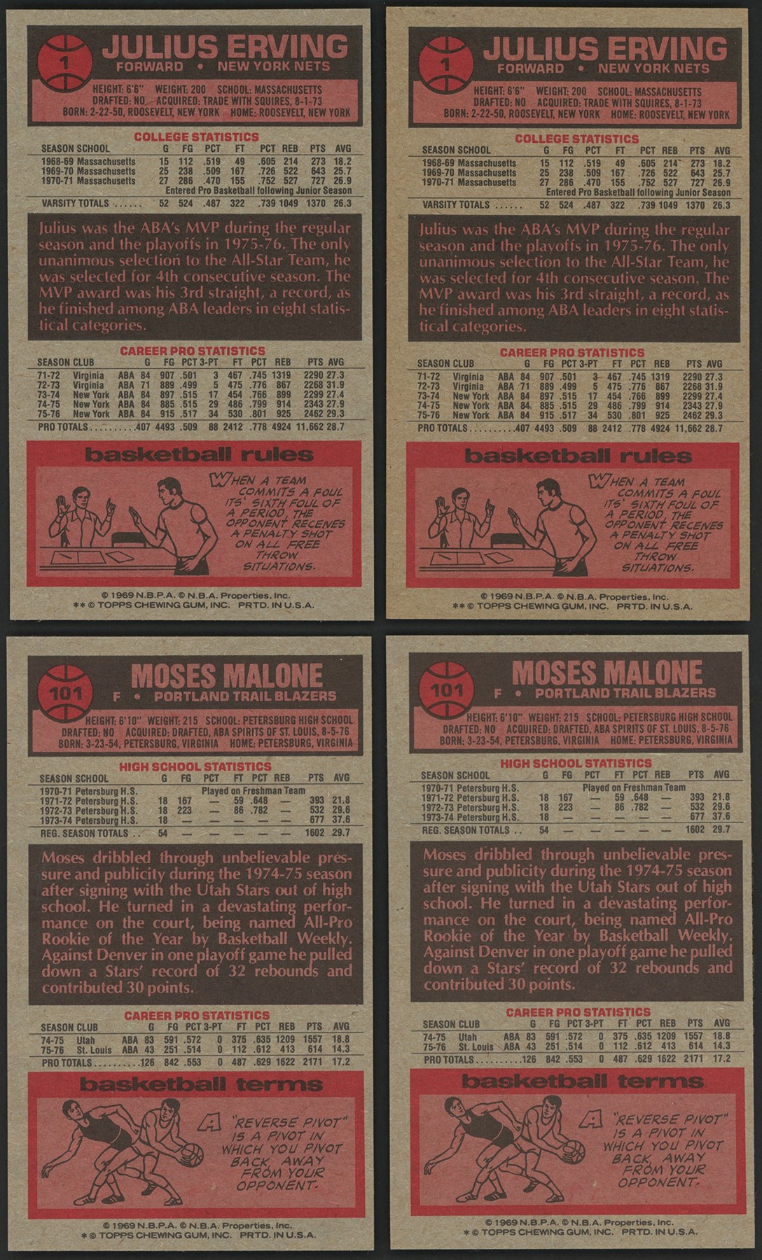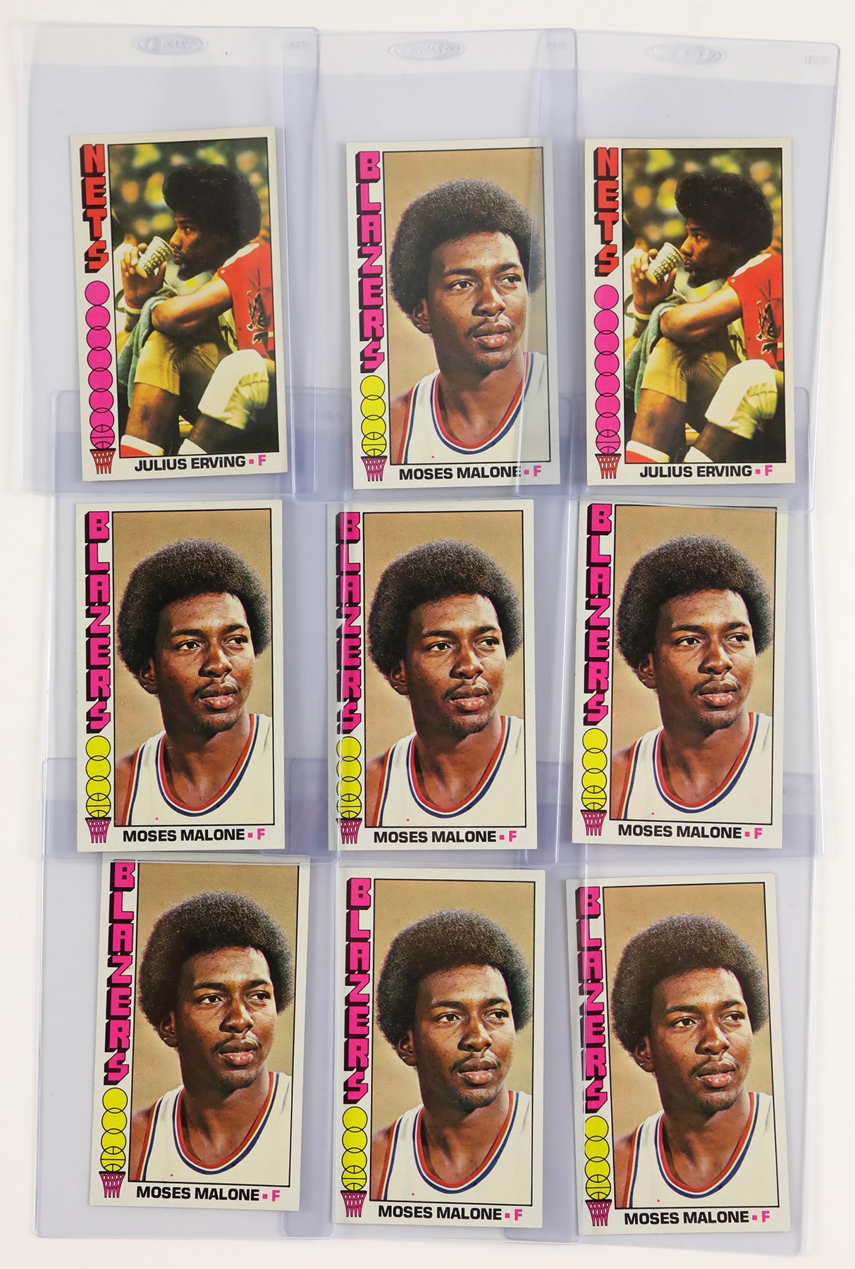 1976-77 Topps Basketball collection of (13) cards. The collection includes (4) #1 Julius Erving (1) EX-MT (3) NM and (9) 101 Moses Malone (3) EX-MT (6) NM.
