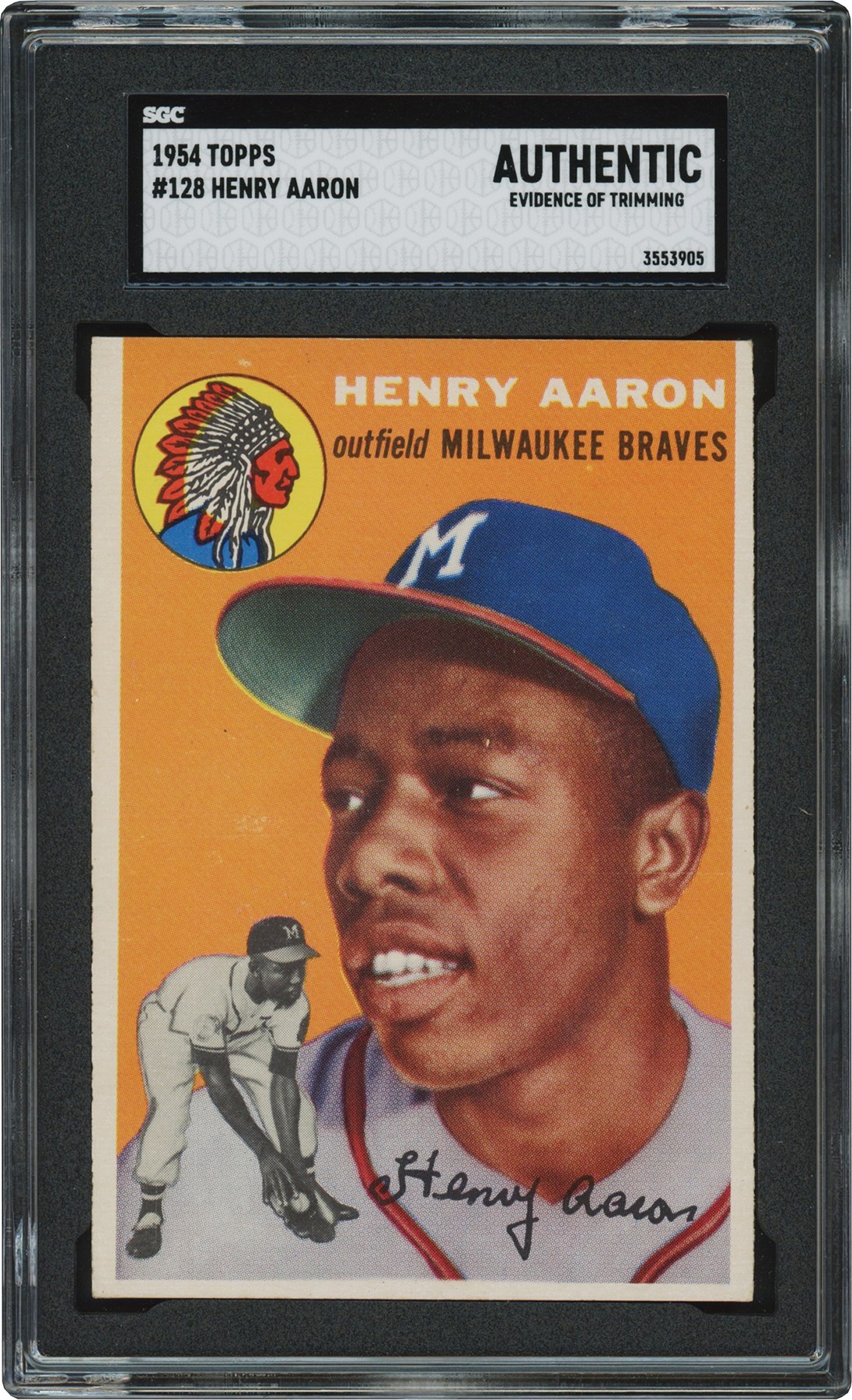 1954 Topps Baseball 128 Hank Aaron (R) card. The card has been graded and encapsulated by SGC as Authentic-Evidence of Trimming. It has a colorful dual image of Aaron set against an orange background. The borders remain white while the edges have light chipping. Centering is slightly off left to right. All four corners exhibit light wear. The reverse is clean with light chipping evident in the green areas.