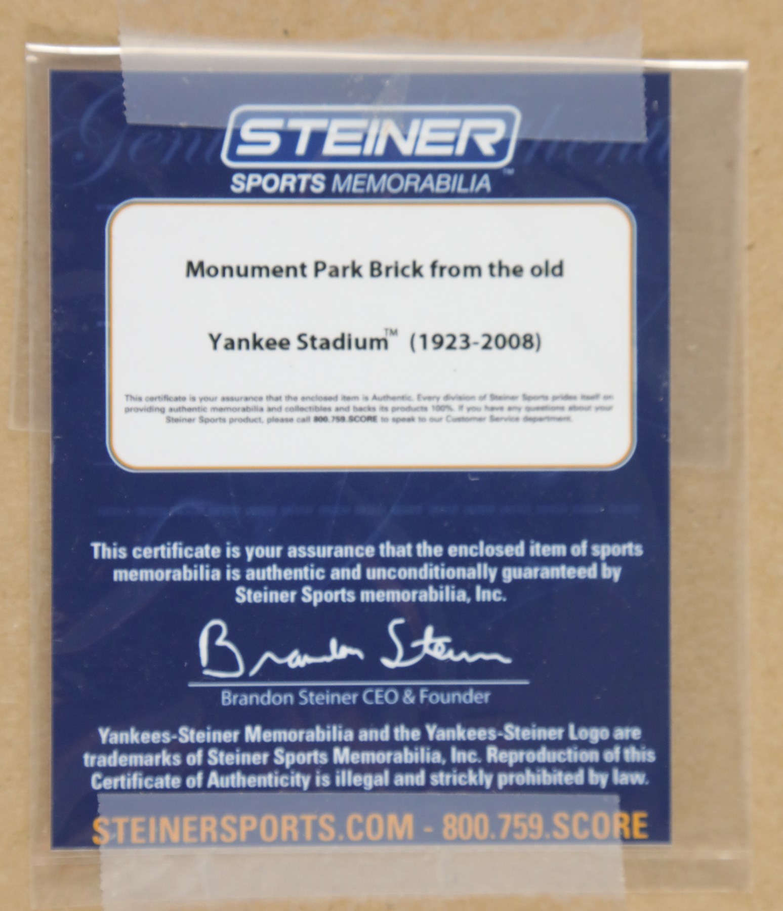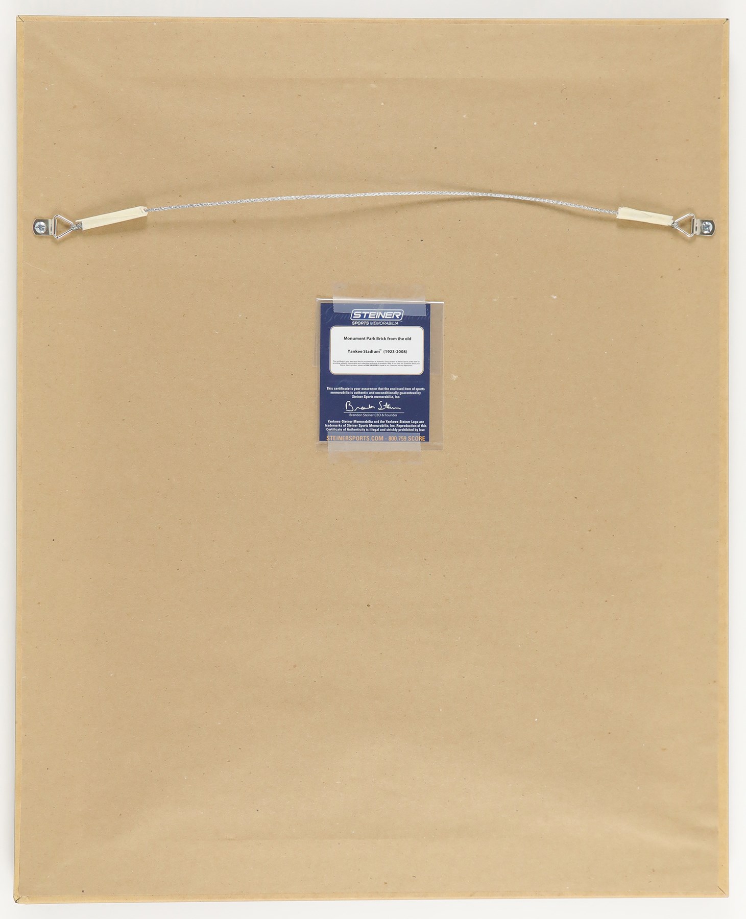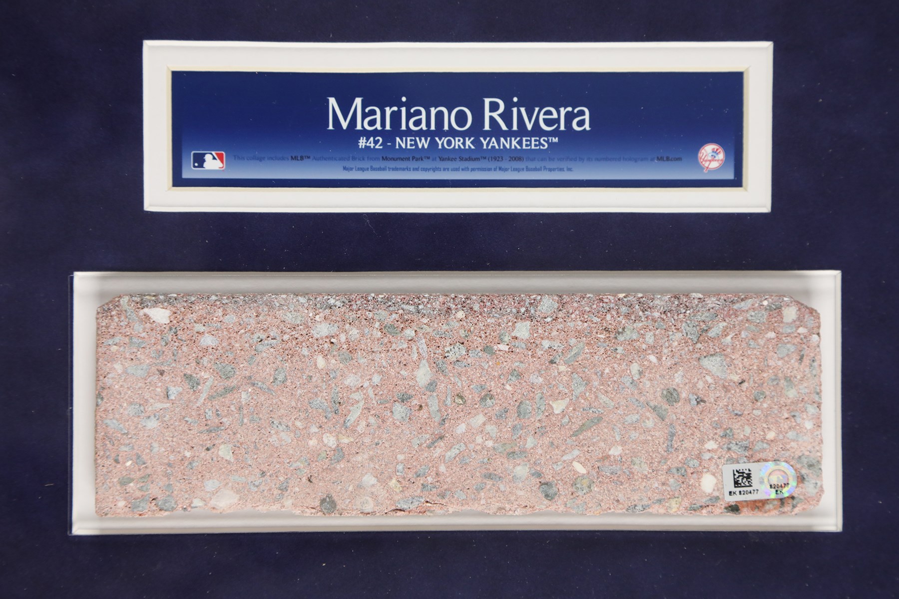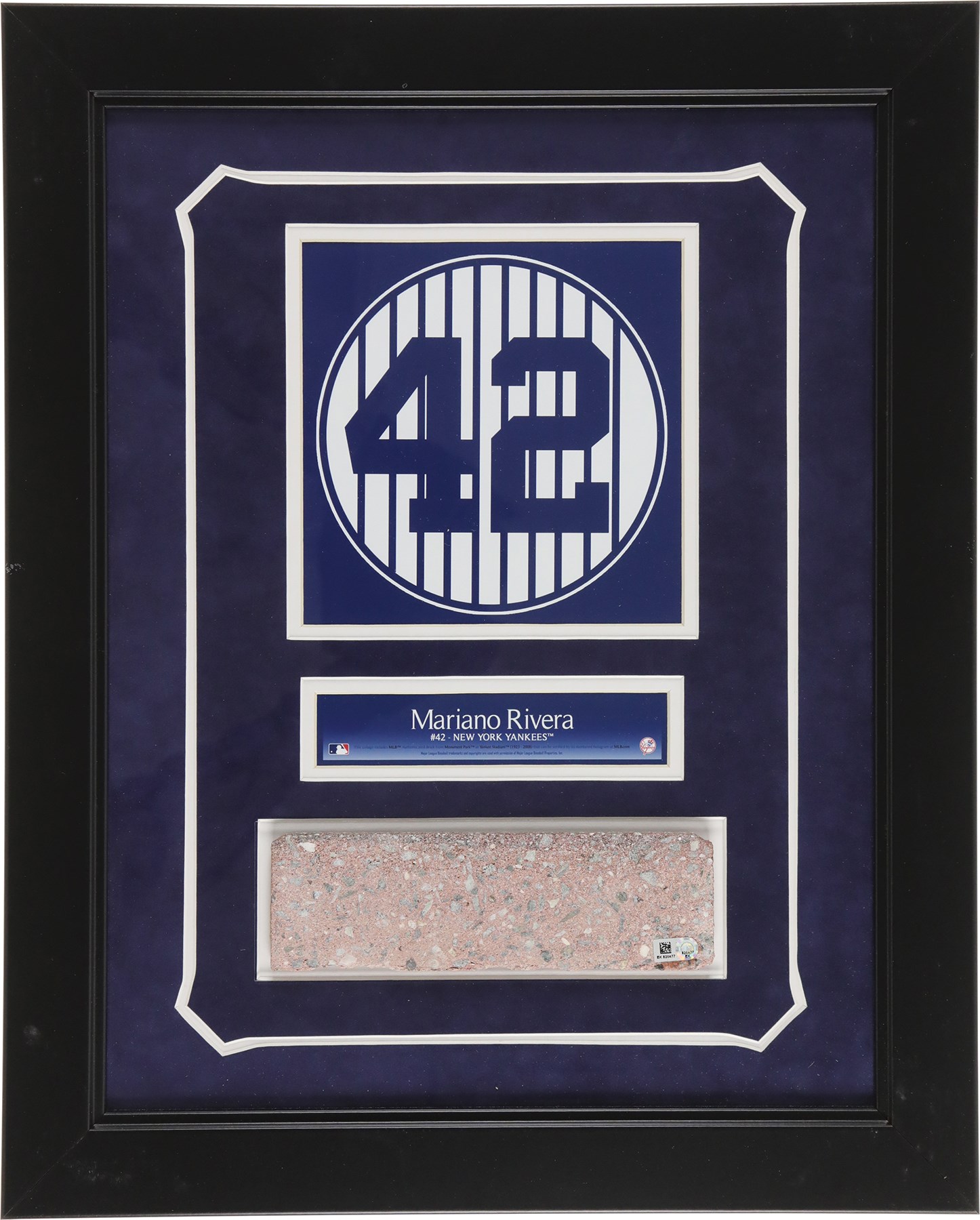A framed piece of brick from Yankee Stadium's old monument park. The small cut of brick has been framed and matted alongside Mariano Rivera's Monument Park retired number. The frame measures out at 17x21". The item includes authentication from both Steiner Sports and Major League Baseball. Old Yankee Stadium, also known as "The House That Ruth Built" was in operation from 1923-2008. This is a great item from that stadium that also celebrates one of the Yankees' all-time greatest players.