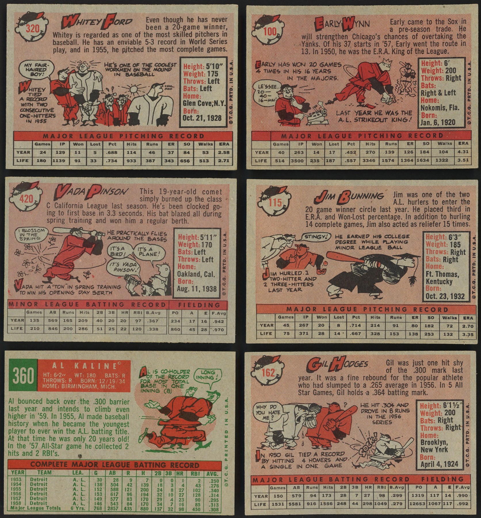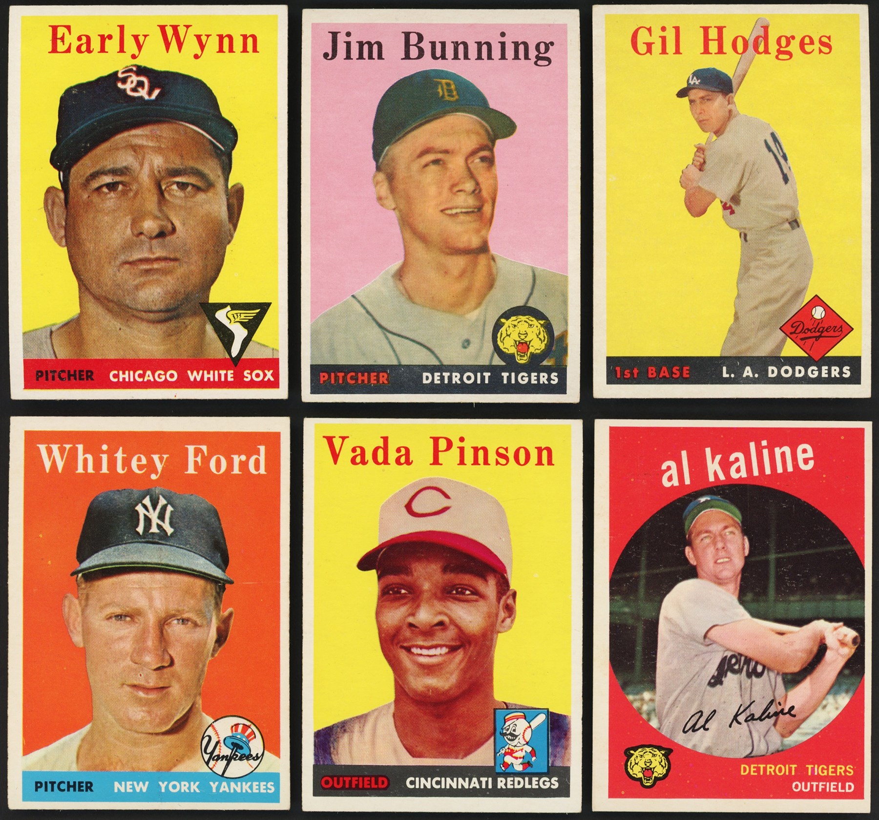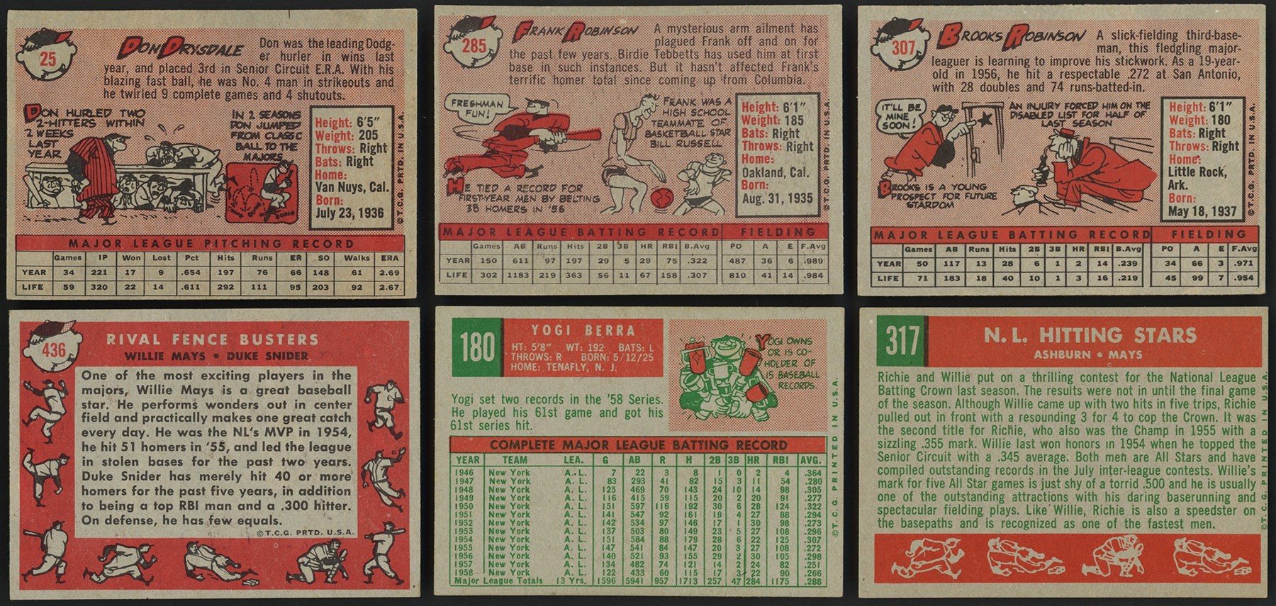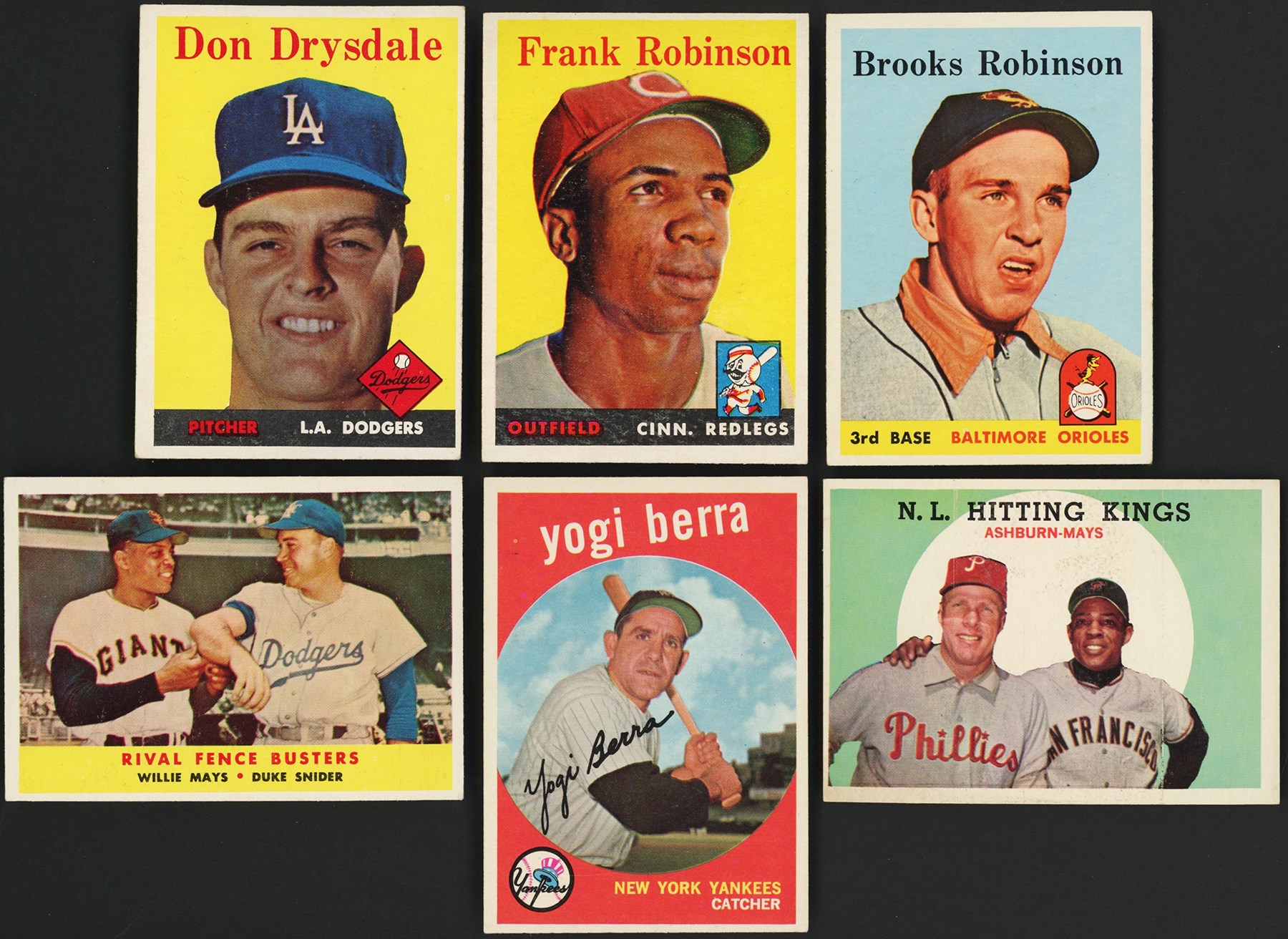 (157) 1958 Topps - 3; 13; 17; 19; 25 Drysdale VG; 26; 27; 32; 34; 35; 37; 42; 43; 49; 51; 54; 55; 56; 62; 63; 66; 68; 72; 75; 81; 83; 86; 88; 90 Roberts VG-EX; 95; 99; 100 Wynn EX; 101; 106; 112; 114; 115 Bunning VG-EX; 122; 127; 128; 130; 132; 136; 143; 146; 148; 152; 155; 158; 162 Hodges EX; 163; 166; 176; 177; 178; (2) 179; 183; 184; 193; 194; (2) 198; (2) 201; 203; 204; 206; 207; 209; 212; 214; 218; 219; 222; 223; 228; 229; (2) 232; 234; 235; 247; 253; (2) 256; 262; 264; 265; (2) 268; 271; 275; (2) 277; 278; 279; 281; 284; (2) 285 F Robinson (1) VG (1) VG-EX; 287; 289; 292; (2) 301; 302; 306; 307 B Robinson VG-EX; 309; 313; 316; 319; 320 Ford VG-EX; 332; 334; 335; 337; 346; 348; 354; 355; 357; (2) 358; 363; 367; 369; 372; 377;378; 379; 380; 381; 385; 386; 388; 389; 394; 398; 401; 402; 407; 408; 411; 413; 414; 415; 420 Pinson (R) VG-EX; 422; 428; 429; 430; 432; 436 Fence Busters EX; 439; 440 Mathews VG.