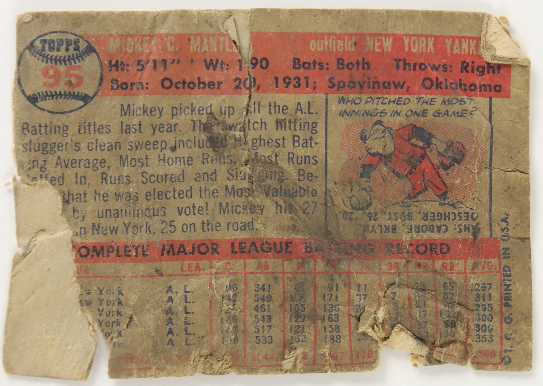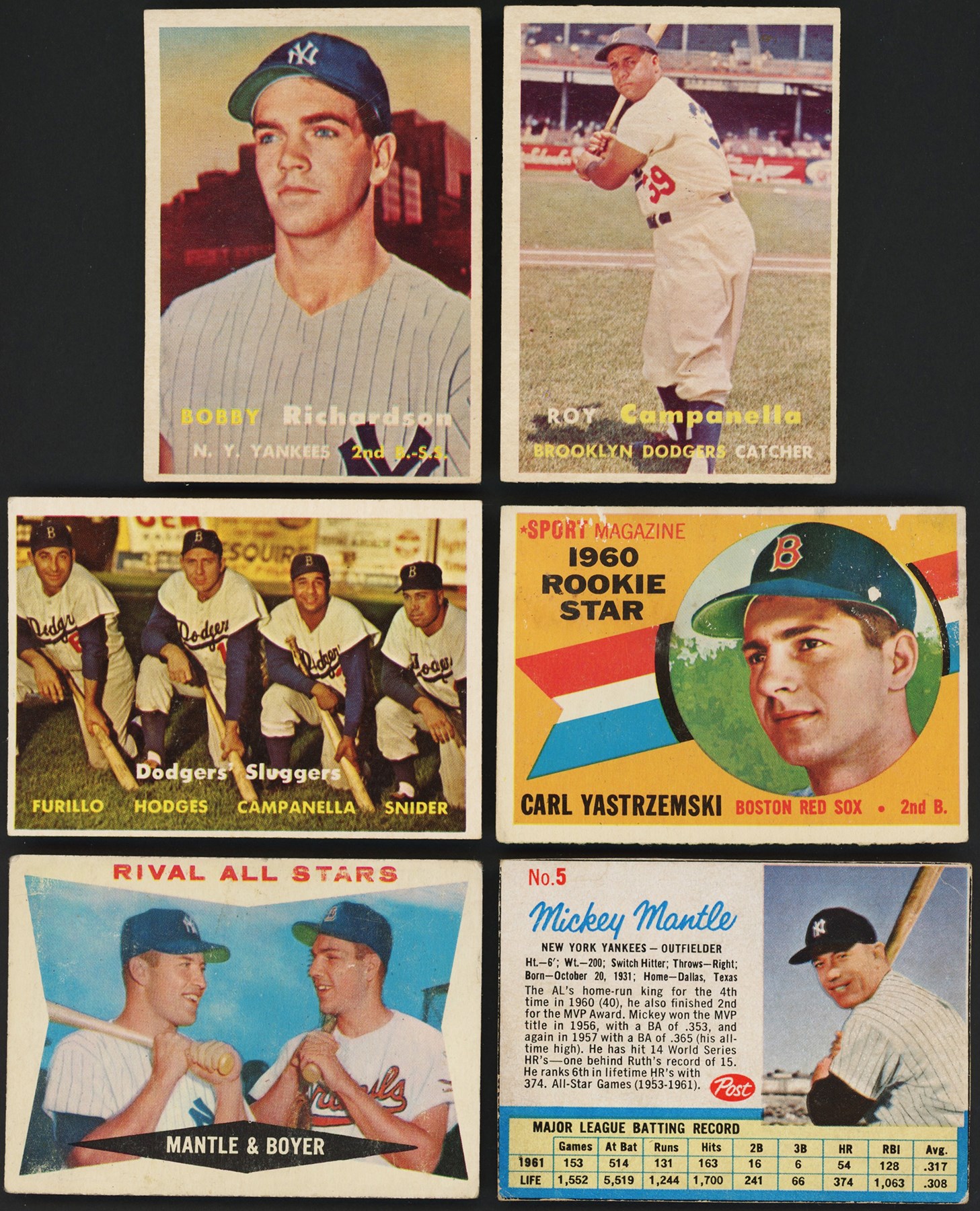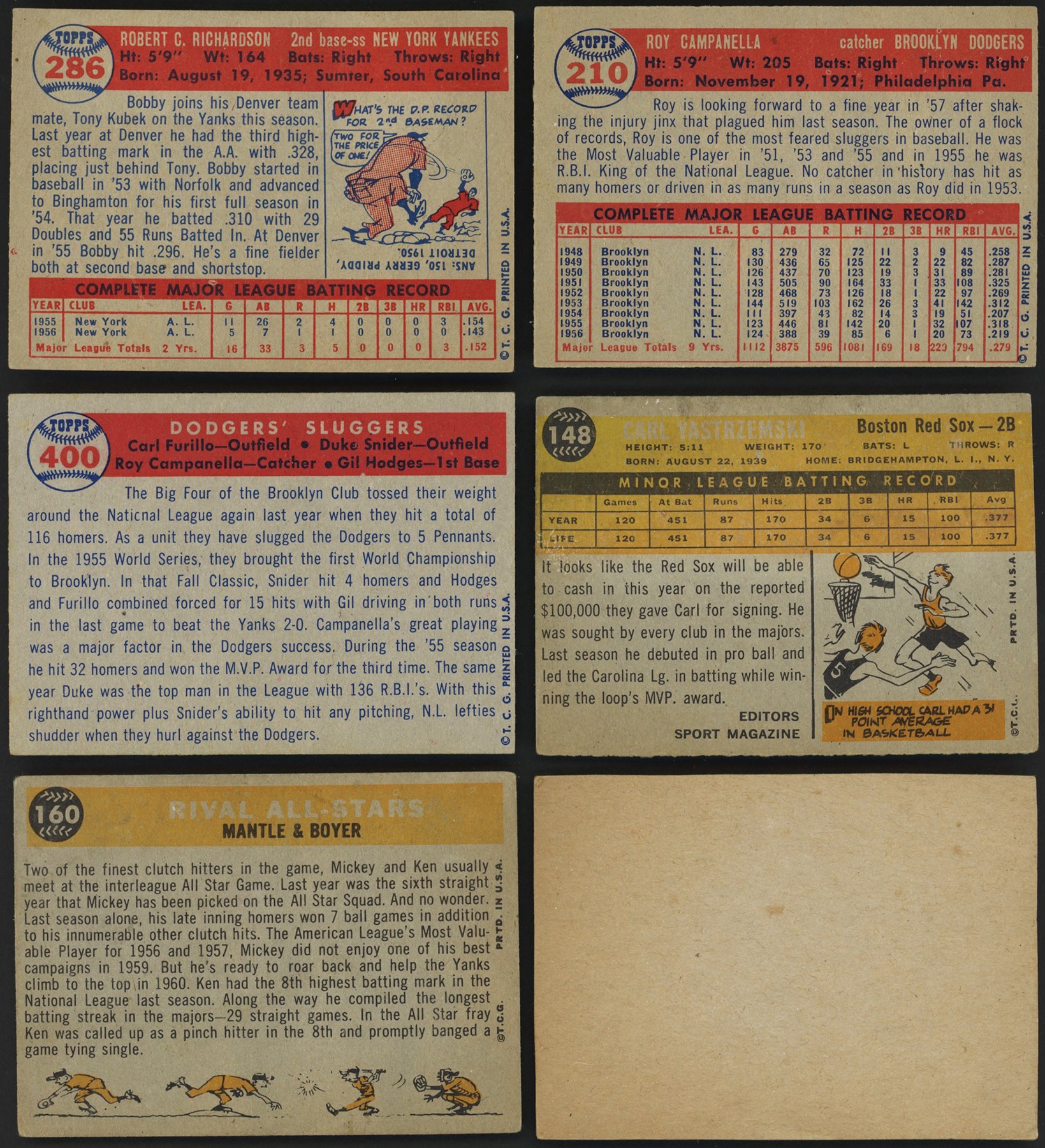 (55) 1957 Topps - 95 Mantle-PR/Authentic; 97 Yankees TC VG-EX; 165 Kluszewski VG; 192; 198; 199; 207; 210 Campanella VG-EX; 222; 225; 242; 244; 272; 277; 279; (2) 284; (2) 286 Richardson (R) (2) VG-EX; 291; 293; 298; 300; 310; 312 Kubek (R) PR; 355; 357; 360; 363; 367; 369; 370; 371; 372; 374; 376; 378; 379; 384; 385; 386; 388; 389; 390; 391; 392; 394; 395; 396; 399; 400 Dodger Sluggers VG-EX; 401; 402; 403; 405.