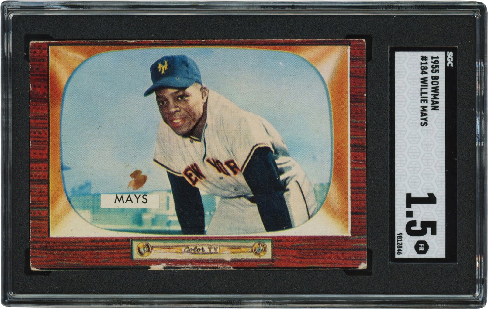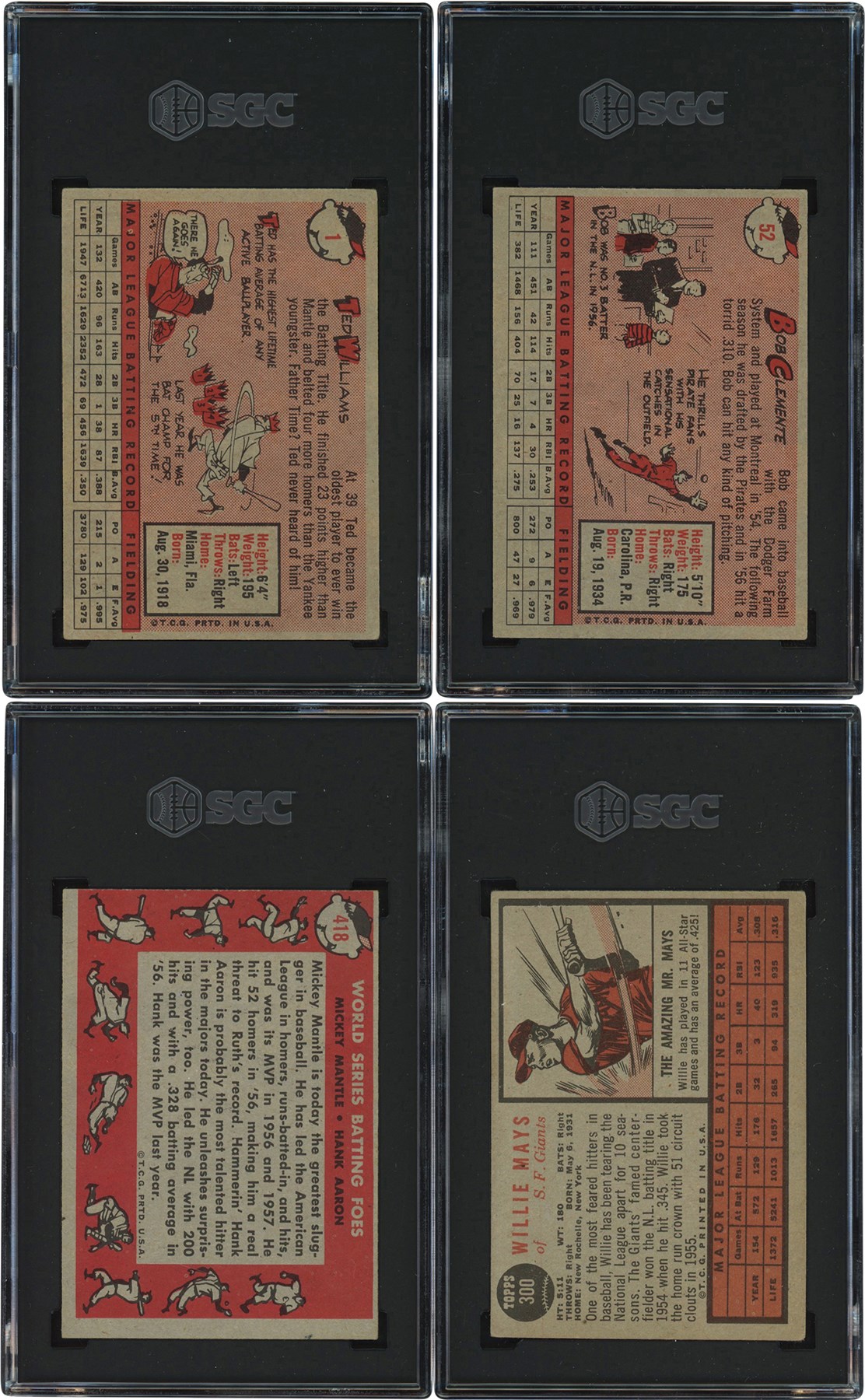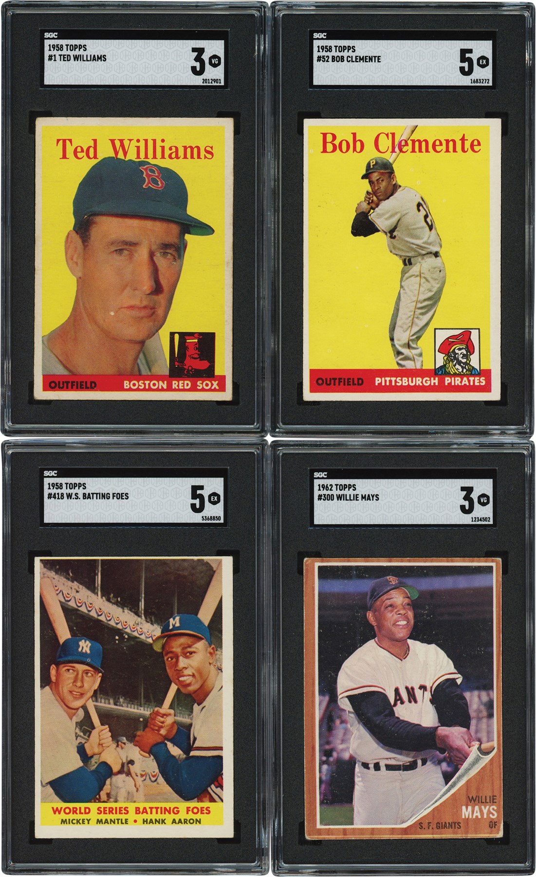 1952-62 Topps and Bowman Baseball collection of (650+) cards. (5) cards have been graded and encapsulated by SGC with: 1955 Bowman 184 Mays FR 1.5; 1958 Topps 1 Ted Williams VG 3; 1958 Topps 52 Clemente EX 5; 1958 Topps 418 WS Batting Foes EX 5; and 1962 Topps 300 Mays VG 3. Ungraded examples include: