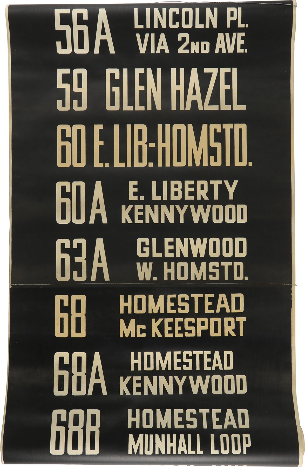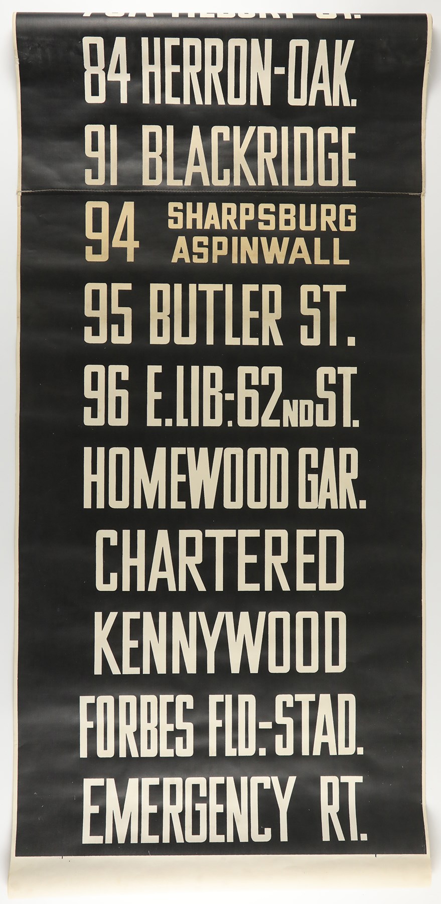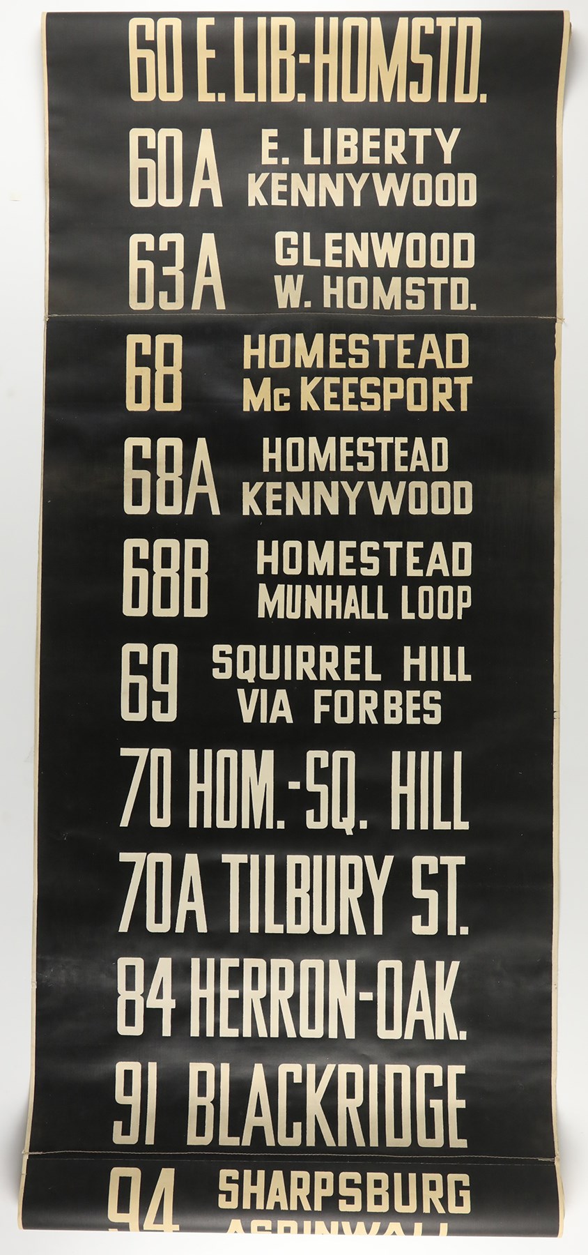 The canvas trolley sign is more than 15 feet long, and it has a width of 29". It is black, with each stop displayed in white. It was rolled up and displayed on the top section of the front of a trolley. The sign could be manually changed to show each forthcoming stop. More than twenty stops are indicated, and the last stop on the sign read, "FORBES FLD. - STAD." In one or more places it appears that the long sign was repaired, possibly from a tear, and tape appears on back. Some of the trolley stops appear darker than others, possibly from accrued sunlight or other causes. The trolley sign roll is in overall nice condition.