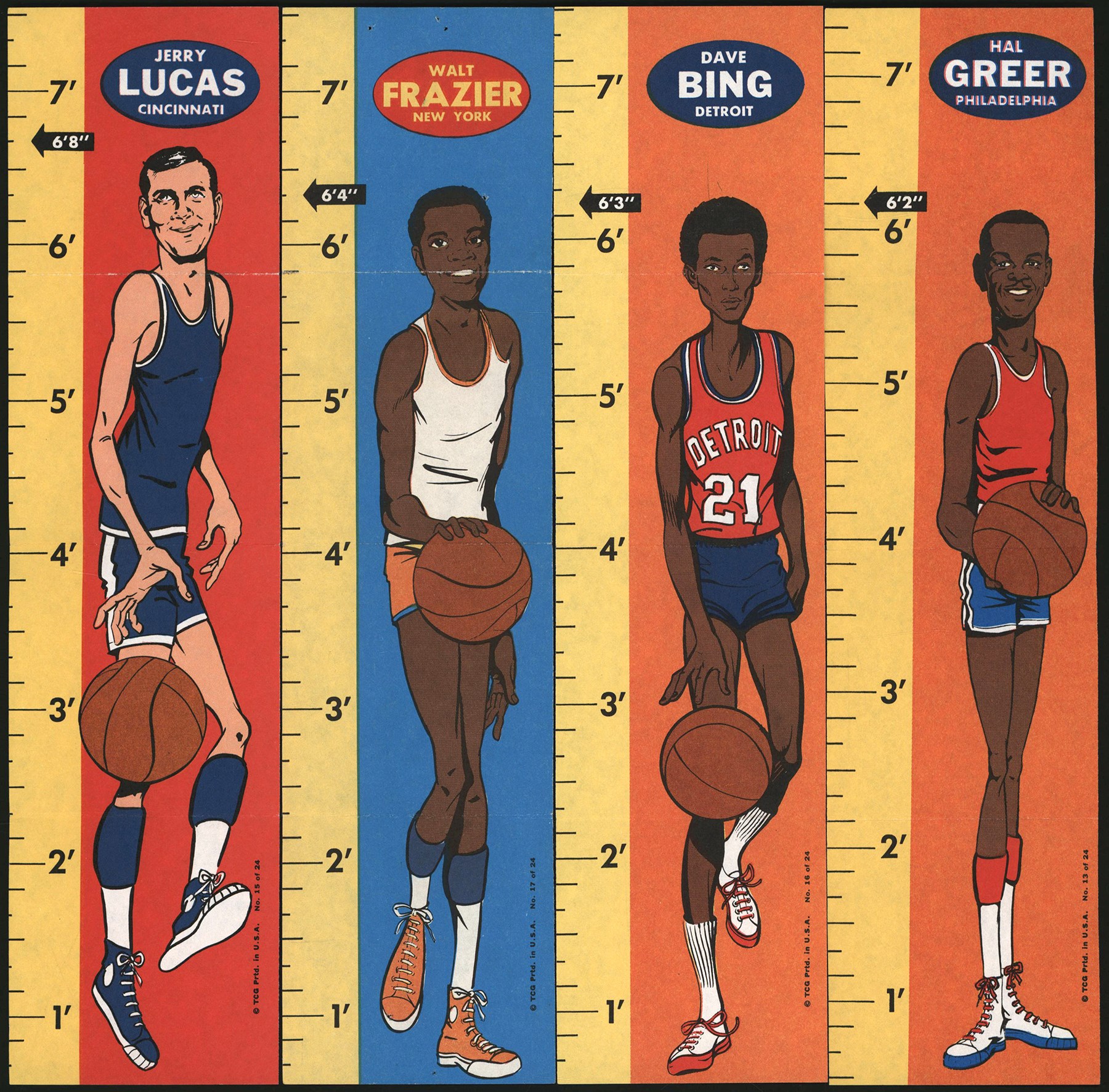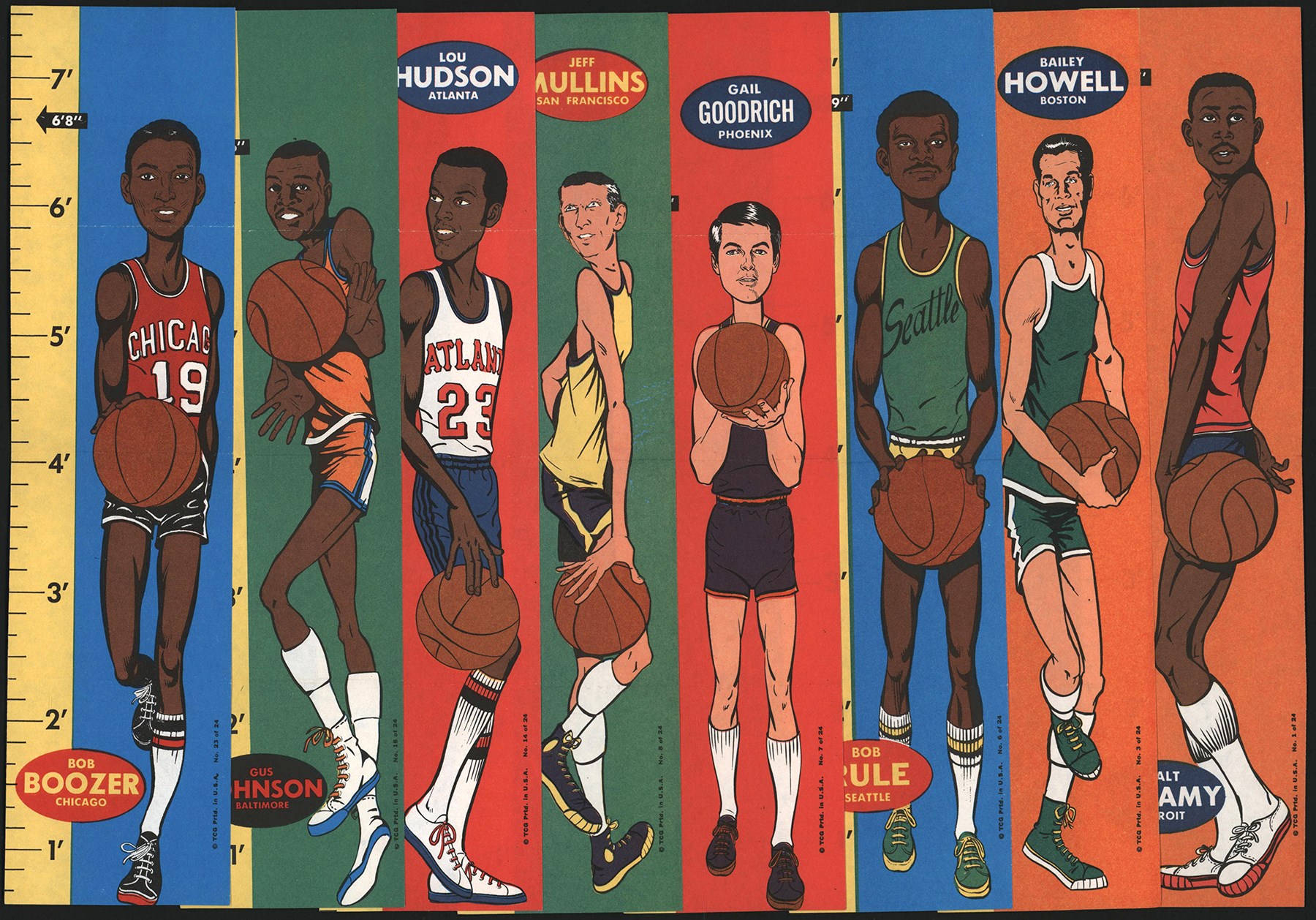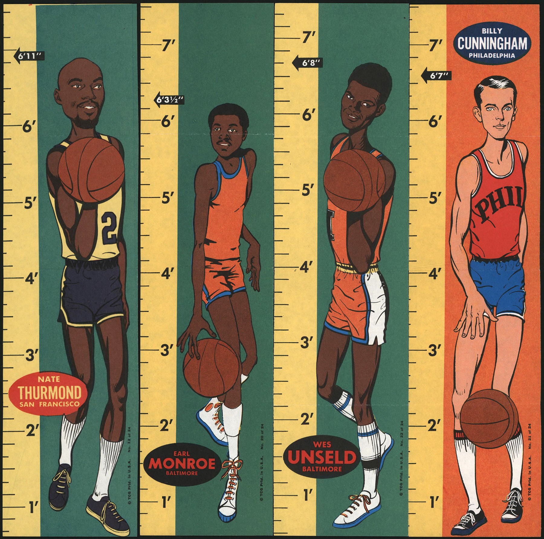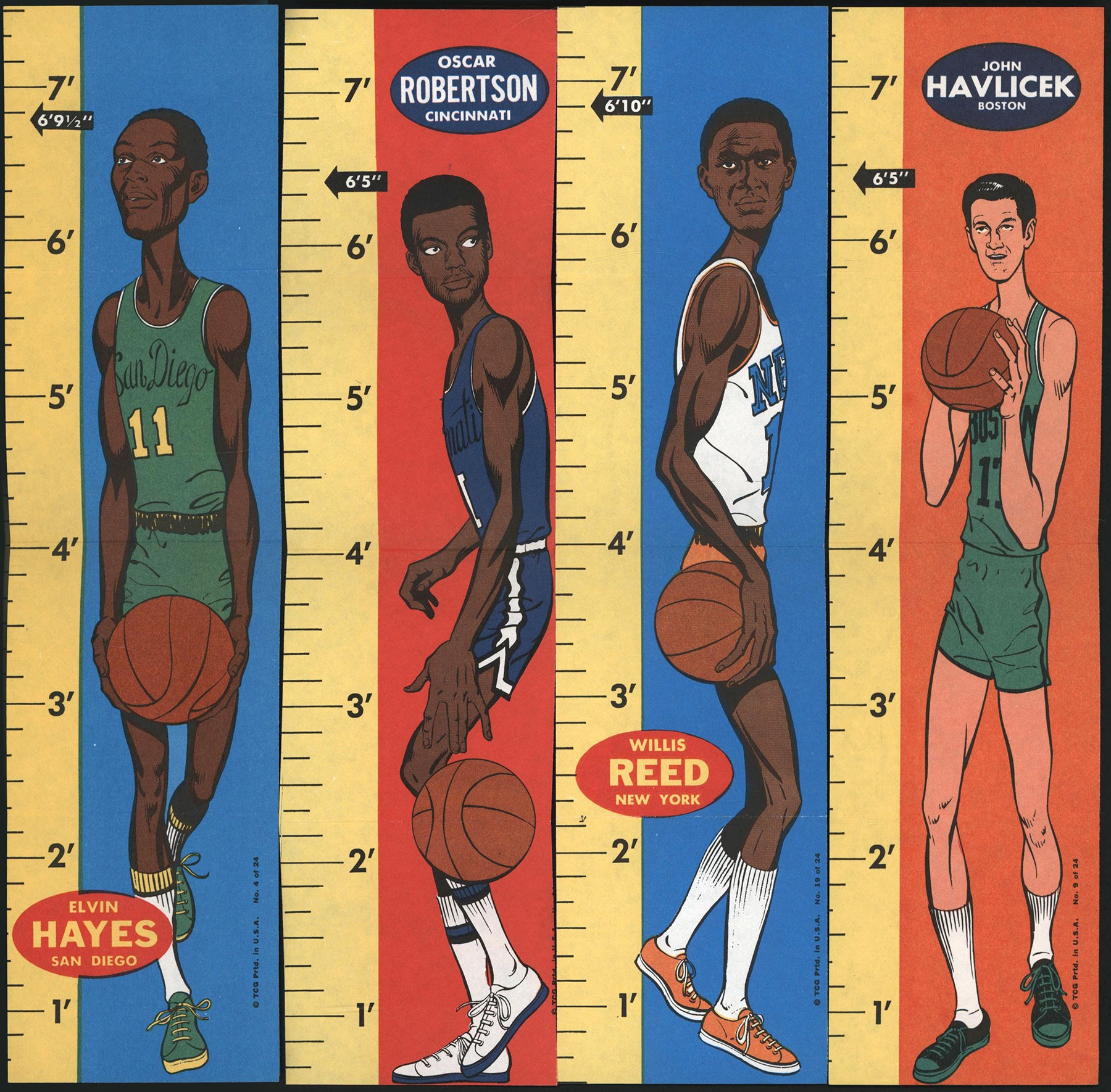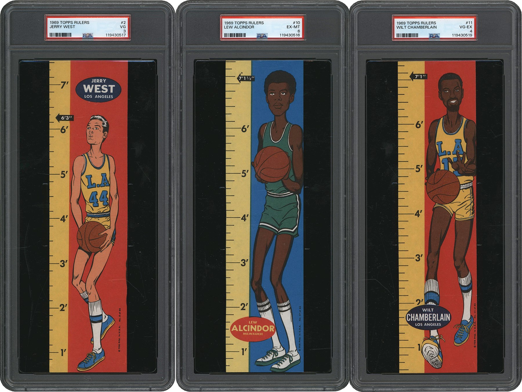 1969 Topps Basketball Rulers near-complete set of (23/24) cards. (3) cards have been graded and encapsulated by PSA with 2 West VG 3; 10 Alcindor EX-MT 6; 11 Chamberlain VG-EX 4. Ungraded examples include: 1 Bellamy VG-EX; 3 Howell EX; 4 Hayes EX-MT; 6 Rule EX-MT; 7 Goodrich VG-EX; 8 Mullins EX; 9 Havlicek EX; 12 Thurmond VG-EX; 13 Greer VG; 14 Hudson VG-EX; 15 Lucas VG; 16 Bing VG-EX; 17 Frazier PR; 18 Johnson EX; 19 Reed EX; 20 Monroe VG-EX; 21 Cunningham EX-MT; 22 Unseld EX; 23 Boozer EX; and 24 Robertson EX.