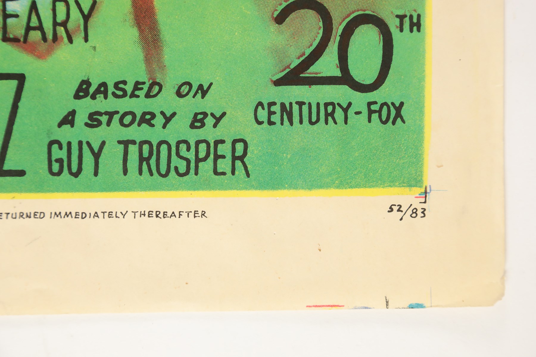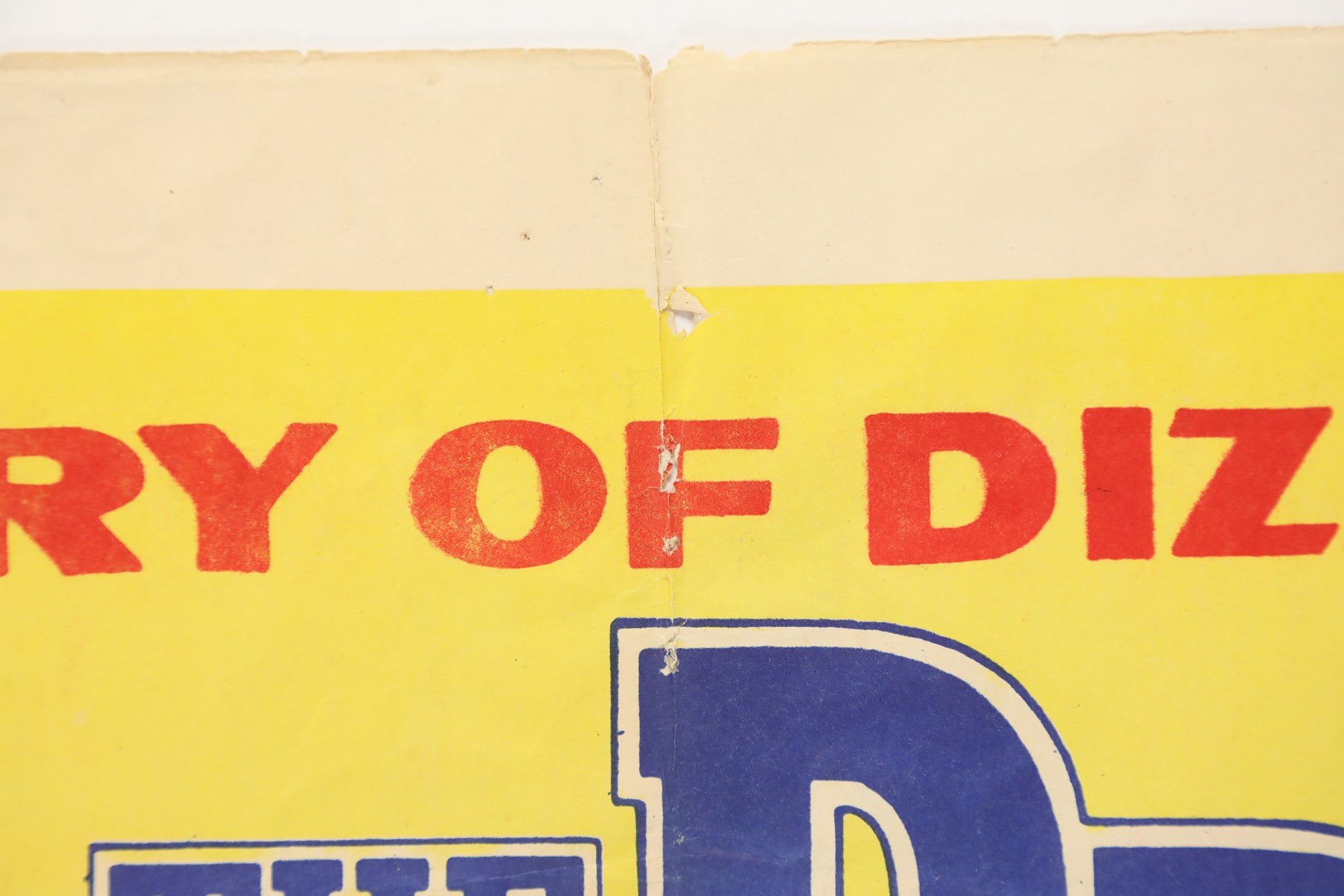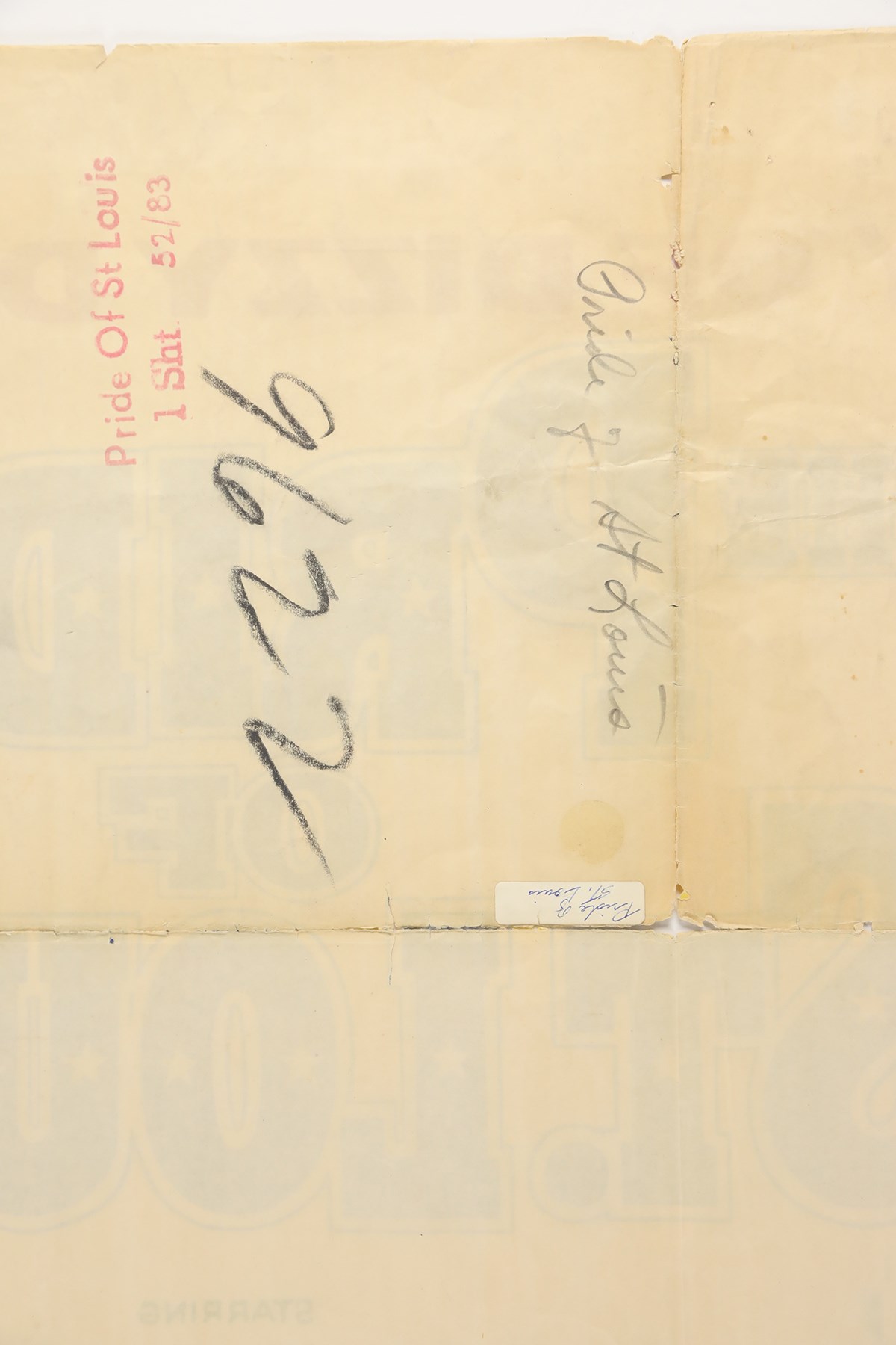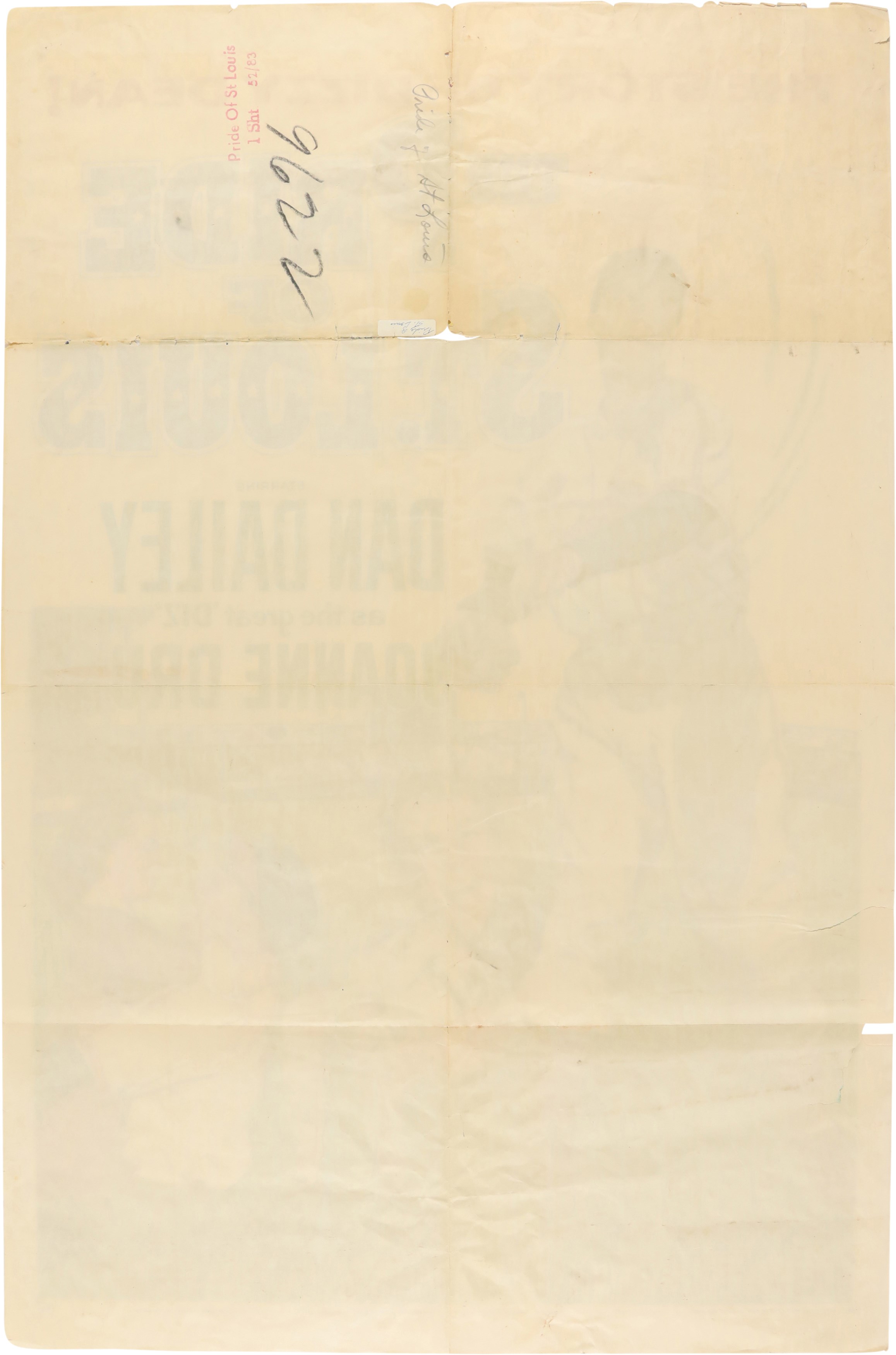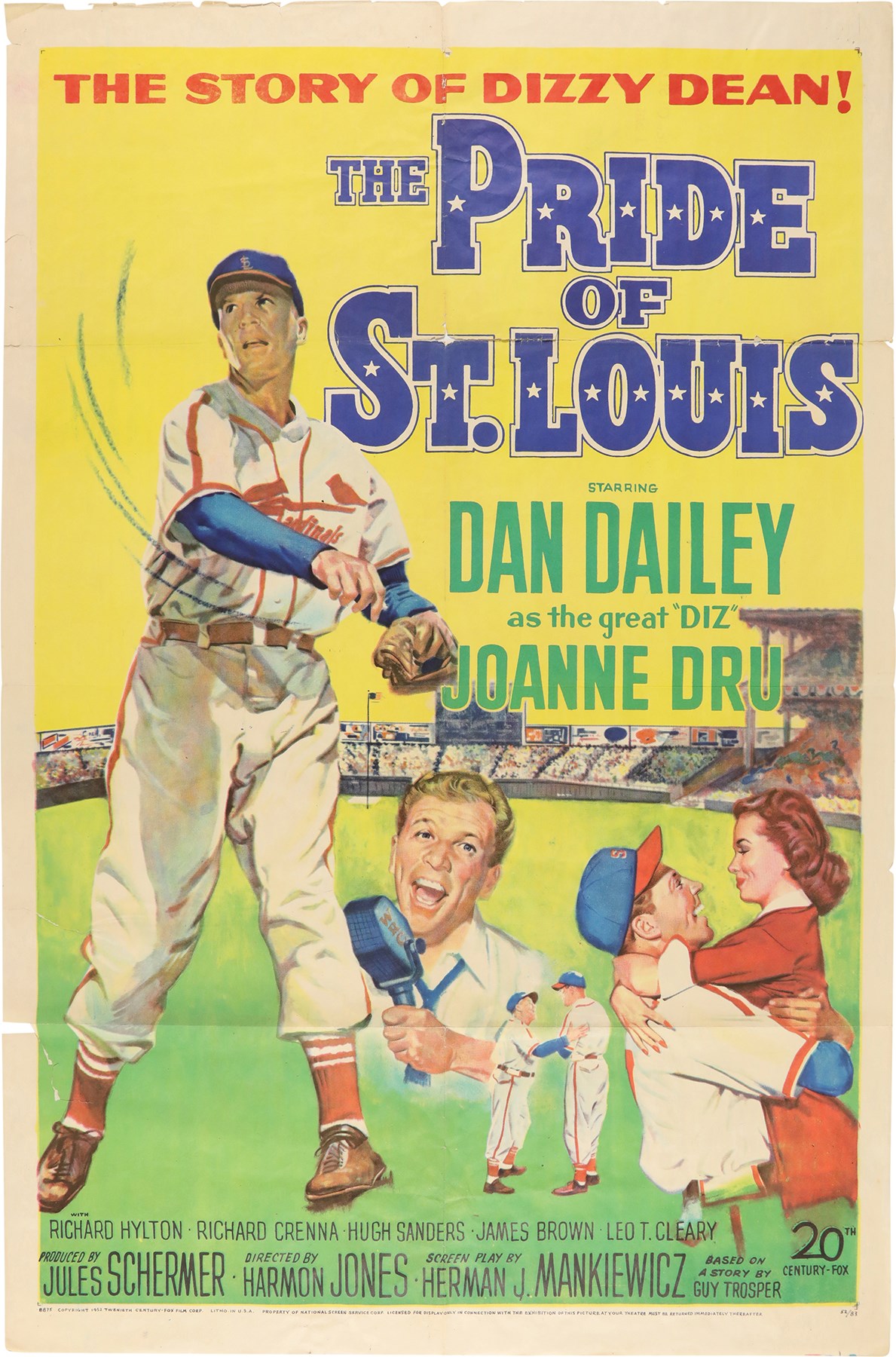 2)"THE PRIDE OF ST. LOUIS/THE STORY OF DIZZY DEAN" is what the big print proclaims on the other movie poster, also measuring 27x40.75". Star Dan Dailey, as Dean, is depicted on the poster, pitching and with actress Joanne Dru, as Dean's wife. Also starring in the movie is Richard Crenna, as Dizzy's brother, Daffy Dean. The film was directed by Harmon Jones and produced by Jules Schermer. The film was distributed by 20th Century Fox. The screenwriter was the famed Herman Mankiewicz who also wrote The Pride of the Yankees, about Lou Gehrig. The film shows Dean's early years in Arkansas, and his terrific but very short success as a star pitcher for the St. Louis Cardinals. Then, the movie follows Dean suffering a broken toe, trying to come back too soon after the injury, and then injuring his throwing arm, which never really recovered. Then the film details Dean's descent into gambling and drinking, followed by his redemption as a baseball broadcaster. The movie gathered generally positive reviews. Both posters have typical horizontal folds and some chipping and tears at the edges. These posters would look great if they were linen backed.