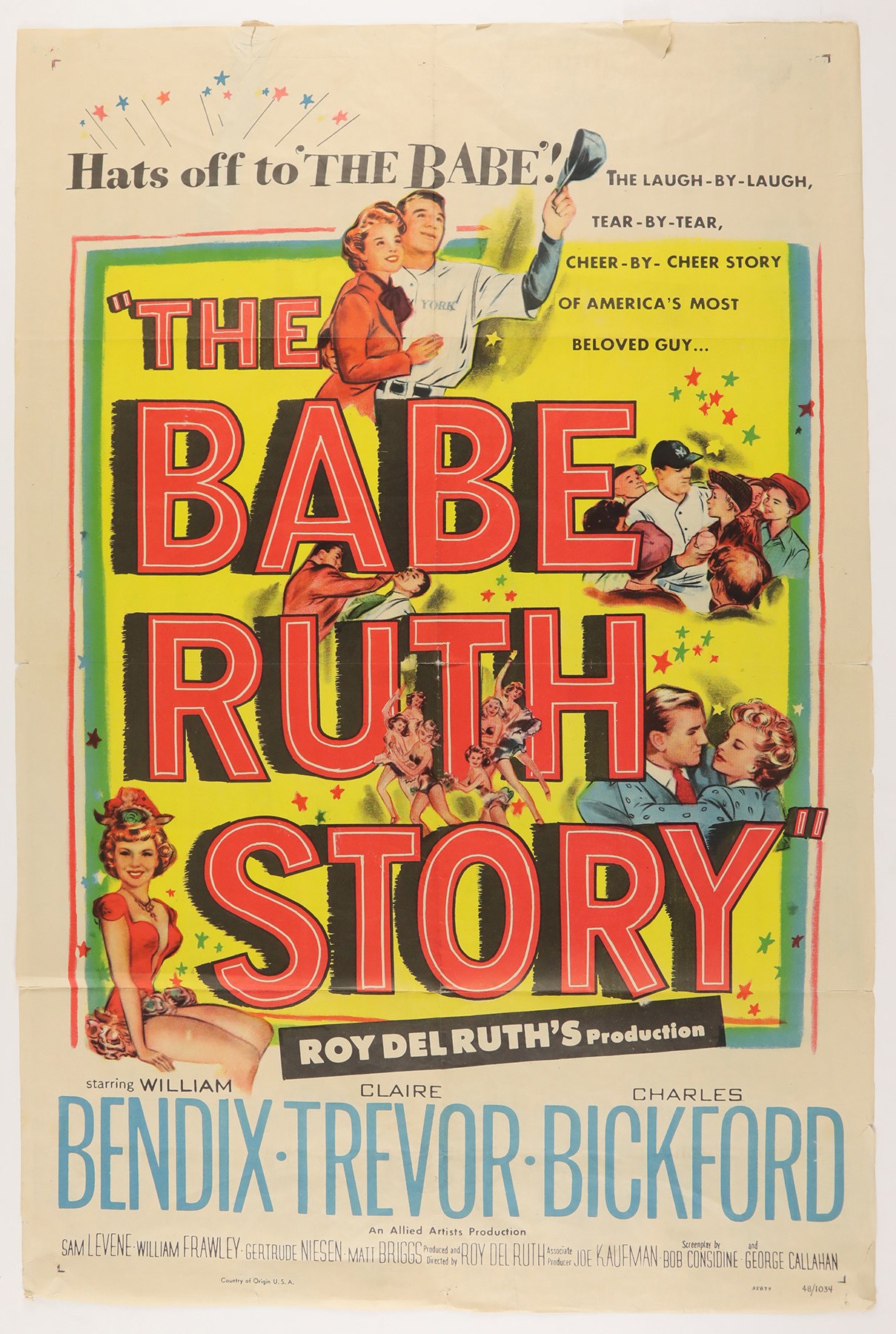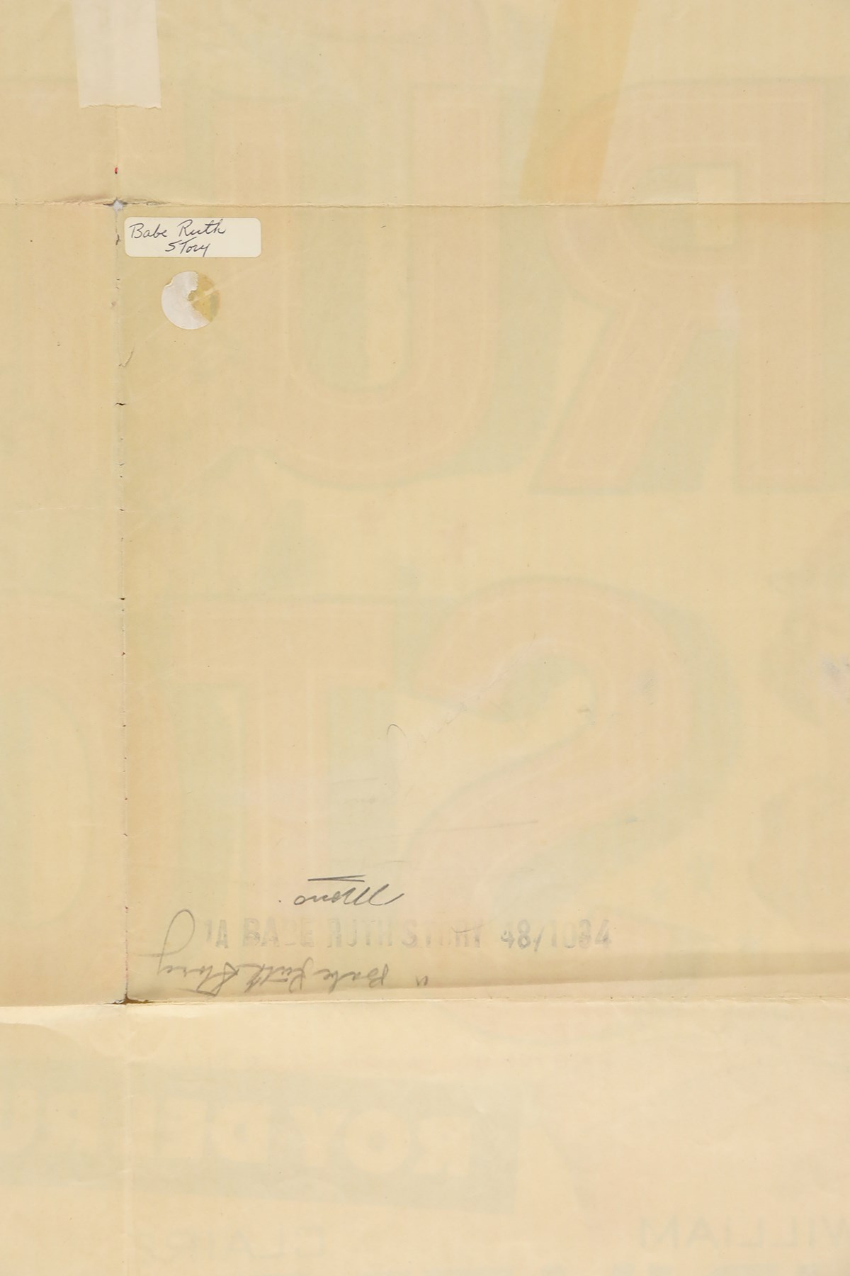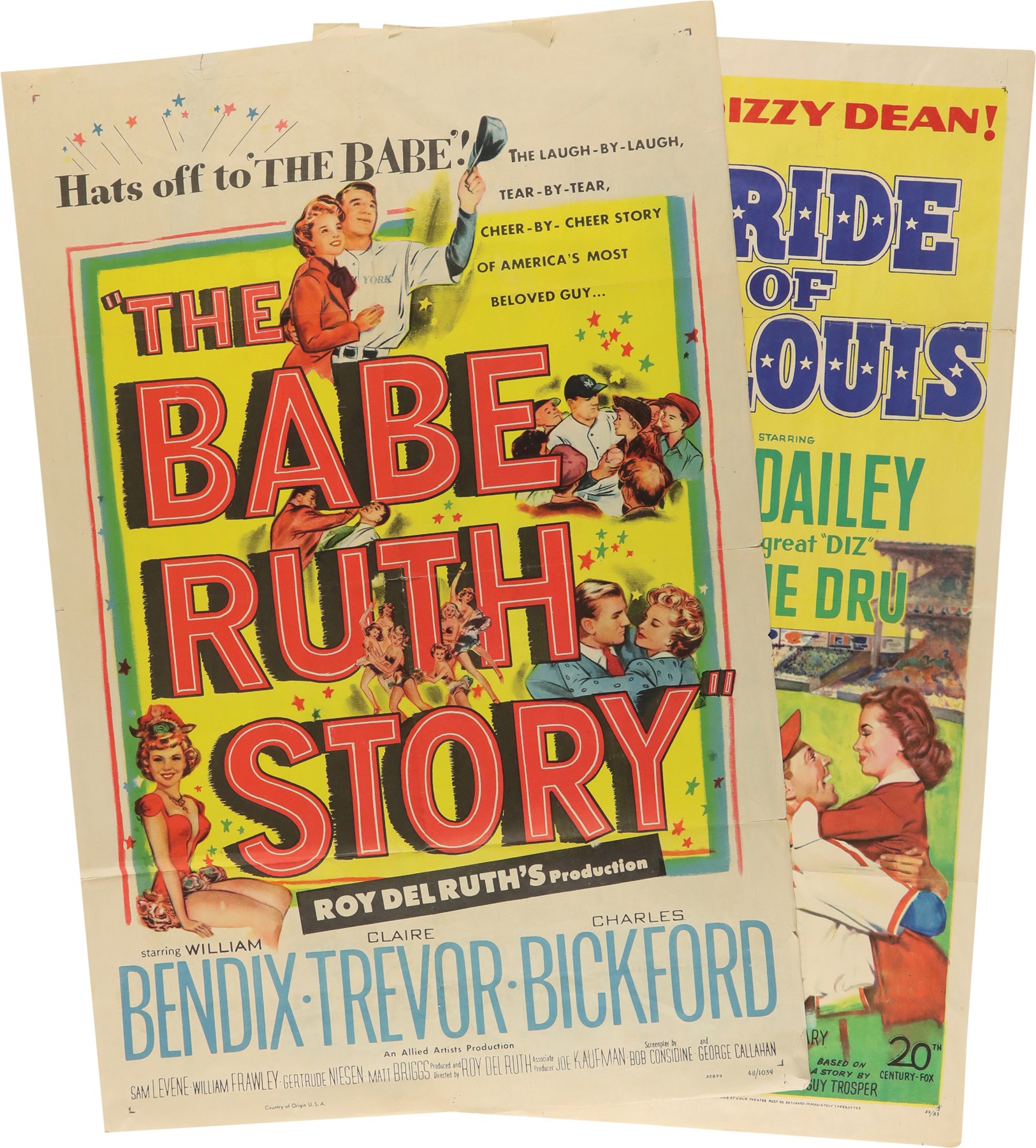 Displayed is a pair of baseball-themed, one sheet movie posters (from the original releases) concerning biopics of Babe Ruth and Dizzy Dean. 1) The 1948 movie poster for The Babe Ruth Story measures 27x40.75". The film was directed and produced by Roy Del Ruth and distributed by Allied Artists, with Allied Artists sometimes also listed as a producer. The film starred William Bendix as Babe Ruth, Claire Trevor as Claire Merritt Hodgson, Ruth's wife, and Charles Bickford as Brother Matthias, the Babe's mentor at the St. Mary's Industrial School for Boys, in Baltimore. The poster has images of Ruth (Bendix) and Claire Merritt Hodgson (Claire Trevor), and reads, in part, "THE BABE RUTH STORY/Hats off to THE BABE! The laugh-by-laugh, tear-by-tear, cheer-by-cheer story of America's Most beloved Guy." The picture follows Ruth from his youth at St. Mary's Industrial School for Boys through his entry into pro baseball, and his time with the Boston Red Sox and the New York Yankees, and for a half season at the end of his career, his time with the Boston Braves. The movie received mostly good reviews upon its release, but in recent years modern reviewers have been critical of the film, contending that it was unrealistic and too sentimental. Ruth was ill when the film was being shot, and the great Bambino passed away only weeks after the movie's release in '48.