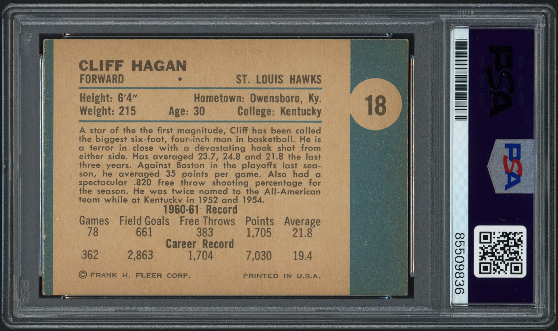 1961 Fleer Basketball #18 Cliff Hagan has been signed and inscribed "HOF '78" by Cliff Hagen in blue. Card has been graded and encapsulated GEM MT 10 by PSA for signature only. Card appears EX overall.