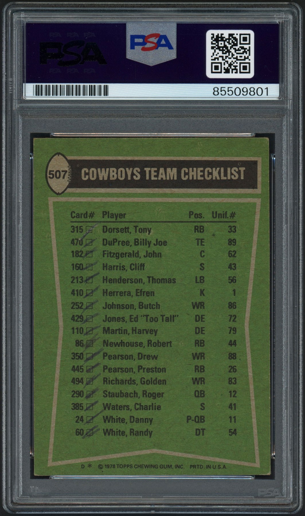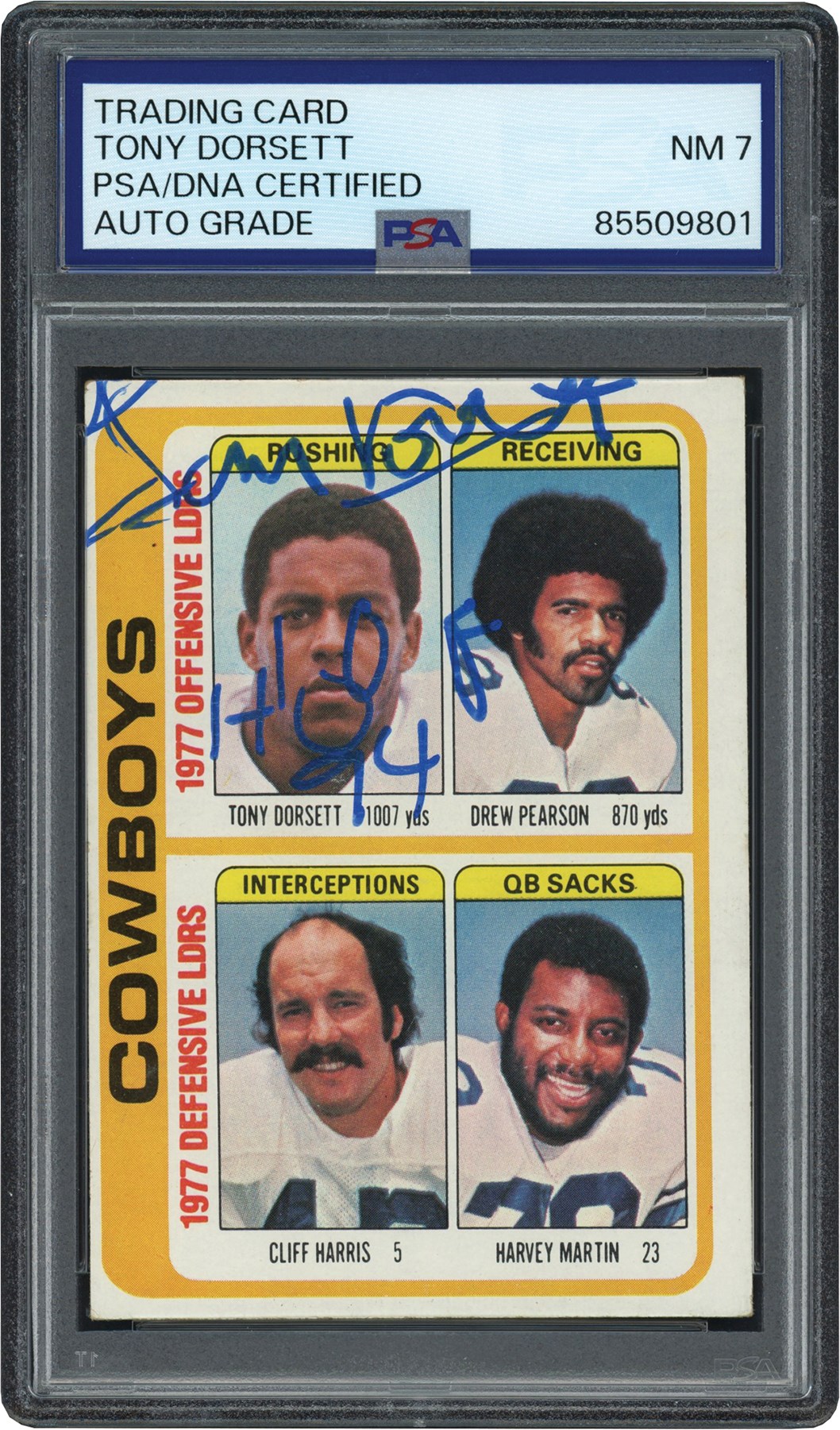 1978 Topps Football #507 Tony Dorsett Rushing Leaders card has been signed and inscribed, "HOF 94" by Tony Dorsett in blue. Card has been graded and encapsulated NM 7 by PSA for signature only. Card appears EX overall.