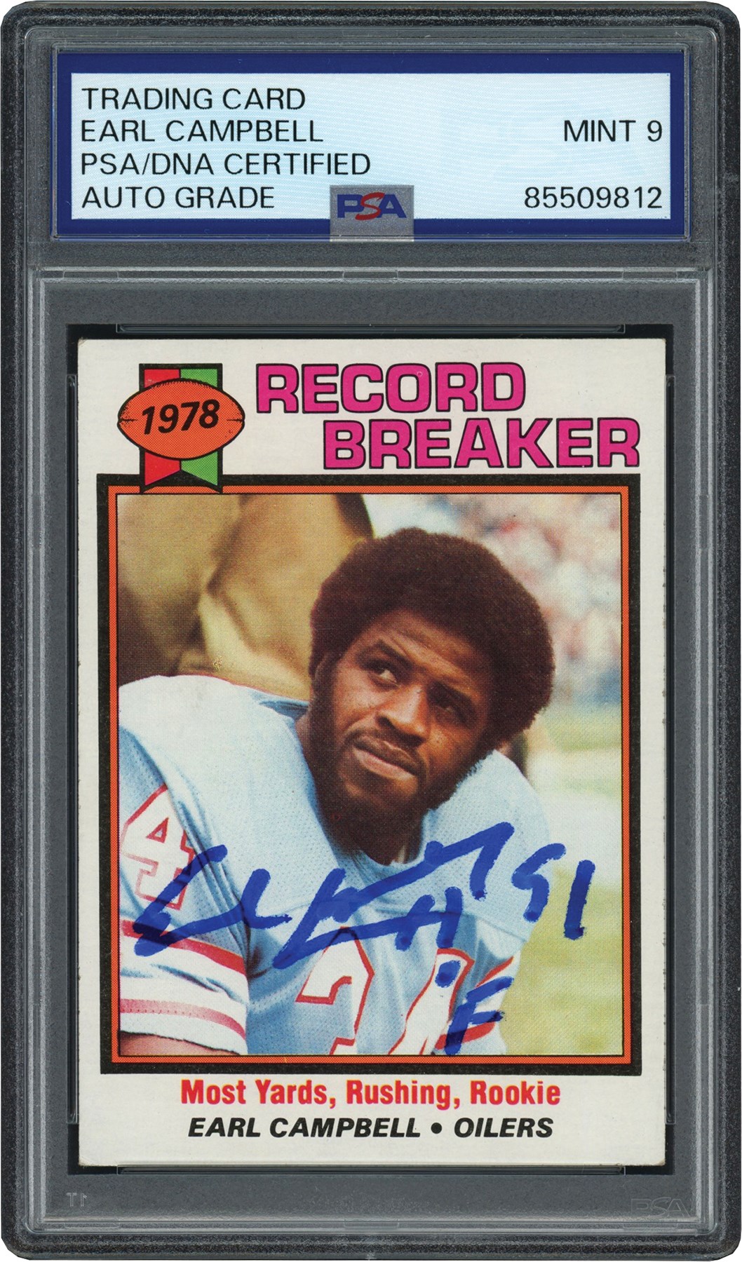 1979 Topps Football #331 Earl Campbell Record Breaker has been signed and inscribed, "HOF 91" by Earl Campbell in blue. Card has been graded and encapsulated MINT 9 for signature only. Card appears EX overall.