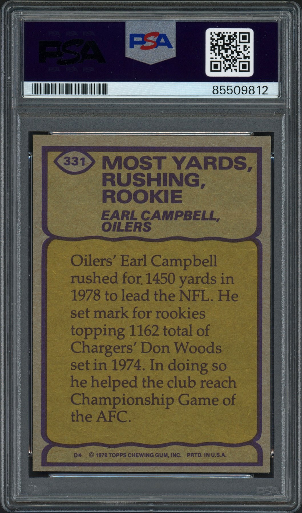 Lot # 115: 1979 Topps Football Record Breaker #331 Earl Campbell Signed "HOF 91" Inscribed Rookie (PSA 9 Auto)