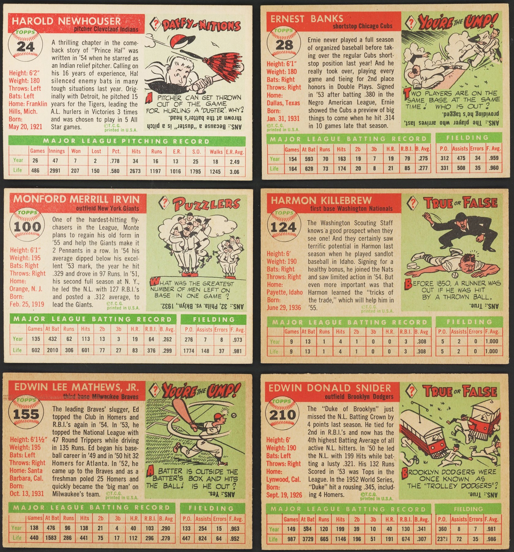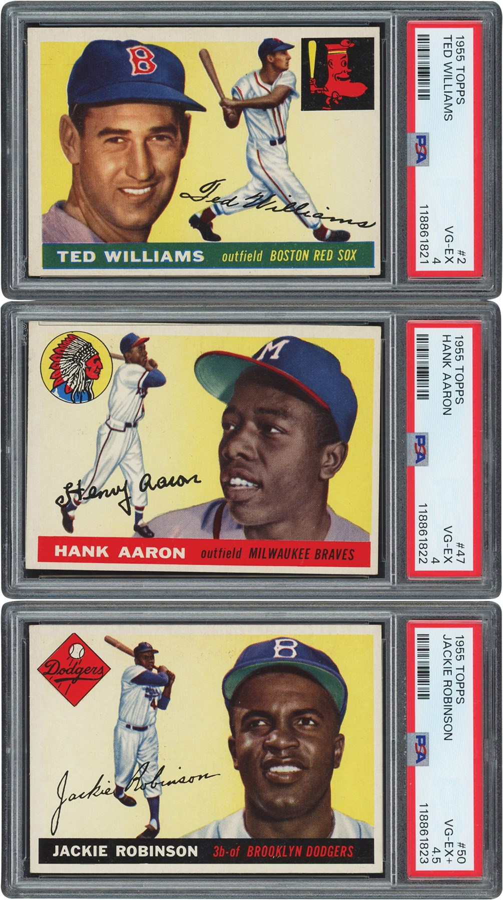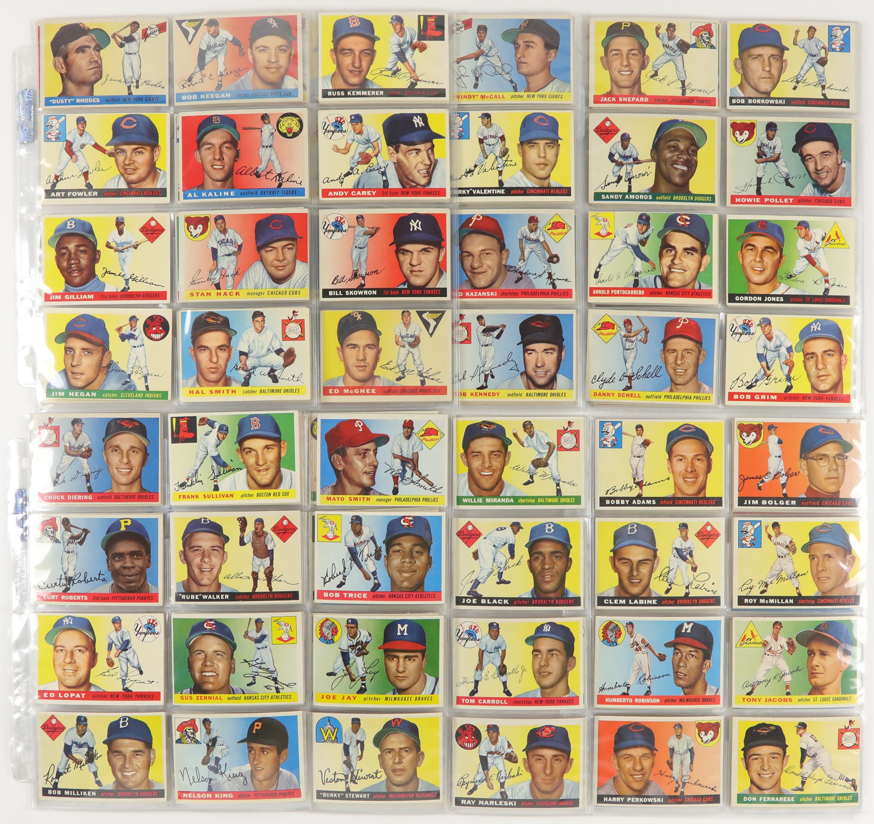 1955 Topps Baseball near-complete set consisting of 203 cards. Missing only #123 Koufax, #164 Clemente, and #194 Mays for completion (those three cards from this set are being offered individually in this auction). The following three cards have been graded by PSA: #2 Williams VG-EX 4, #47 Aaron VG-EX 4, and #50 Robinson VG-EX+ 4.5. Ungraded examples include: 1 Rhodes GD; 19 Herman VG; 24 Newhouser EX; 28 Banks VG-EX; 31 Spahn VG; 75 Amoros (R) VG; 92 Zimmer (R) VG-EX; 100 Irvin VG-EX; 120 Kluszewski EX; 124 Killebrew (R) VG-EX; 125 K Boyer (R) VG; 152 Agganis (R) VG-EX; 155 Mathews VG-EX; 187 Hodges VG-EX; 189 Rizzuto VG; 198 Berra EX (MC); 210 Snider VG-EX. Overall condition range is GD to EX with the majority of examples falling into the VG to VG-EX range.