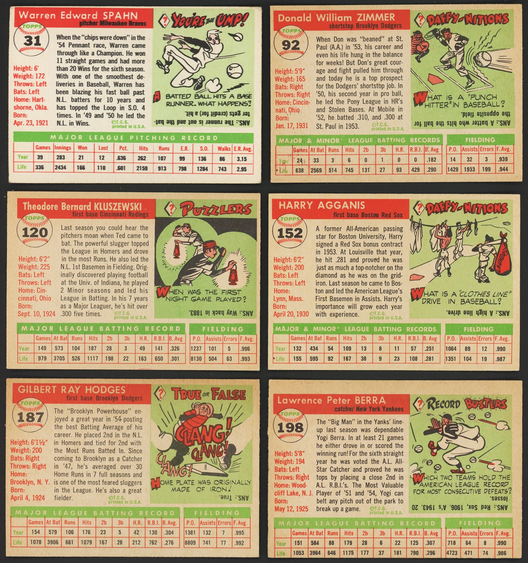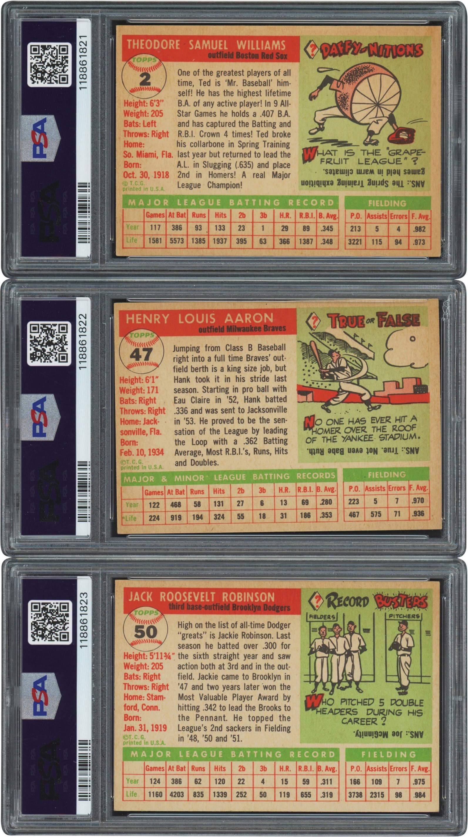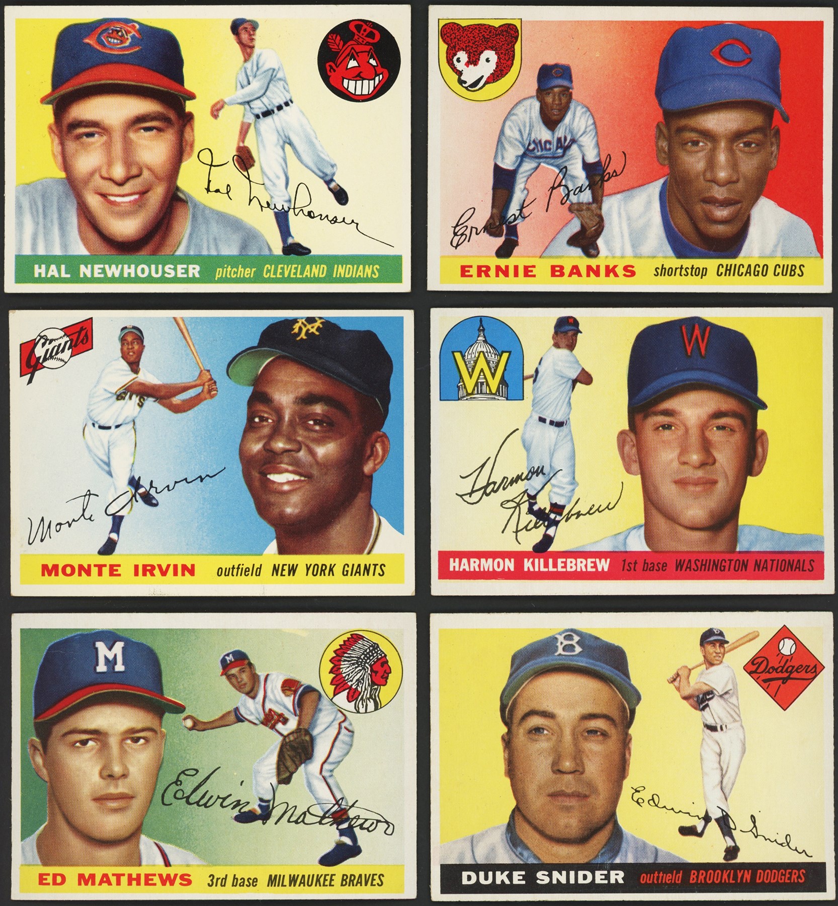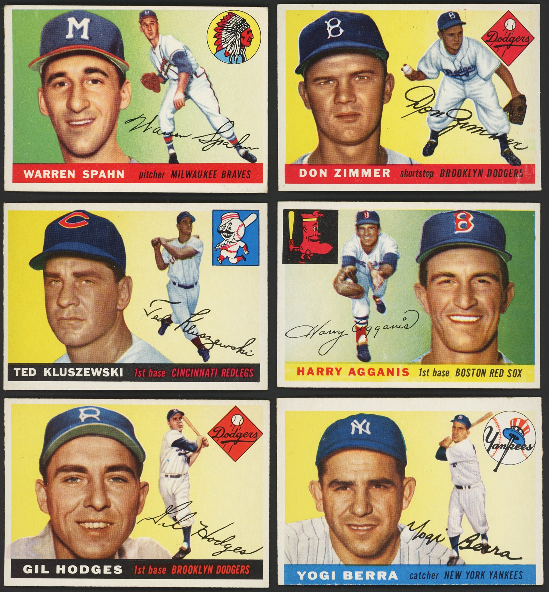 1955 Topps Baseball near-complete set consisting of 203 cards. Missing only #123 Koufax, #164 Clemente, and #194 Mays for completion (those three cards from this set are being offered individually in this auction). The following three cards have been graded by PSA: #2 Williams VG-EX 4, #47 Aaron VG-EX 4, and #50 Robinson VG-EX+ 4.5. Ungraded examples include: 1 Rhodes GD; 19 Herman VG; 24 Newhouser EX; 28 Banks VG-EX; 31 Spahn VG; 75 Amoros (R) VG; 92 Zimmer (R) VG-EX; 100 Irvin VG-EX; 120 Kluszewski EX; 124 Killebrew (R) VG-EX; 125 K Boyer (R) VG; 152 Agganis (R) VG-EX; 155 Mathews VG-EX; 187 Hodges VG-EX; 189 Rizzuto VG; 198 Berra EX (MC); 210 Snider VG-EX. Overall condition range is GD to EX with the majority of examples falling into the VG to VG-EX range.