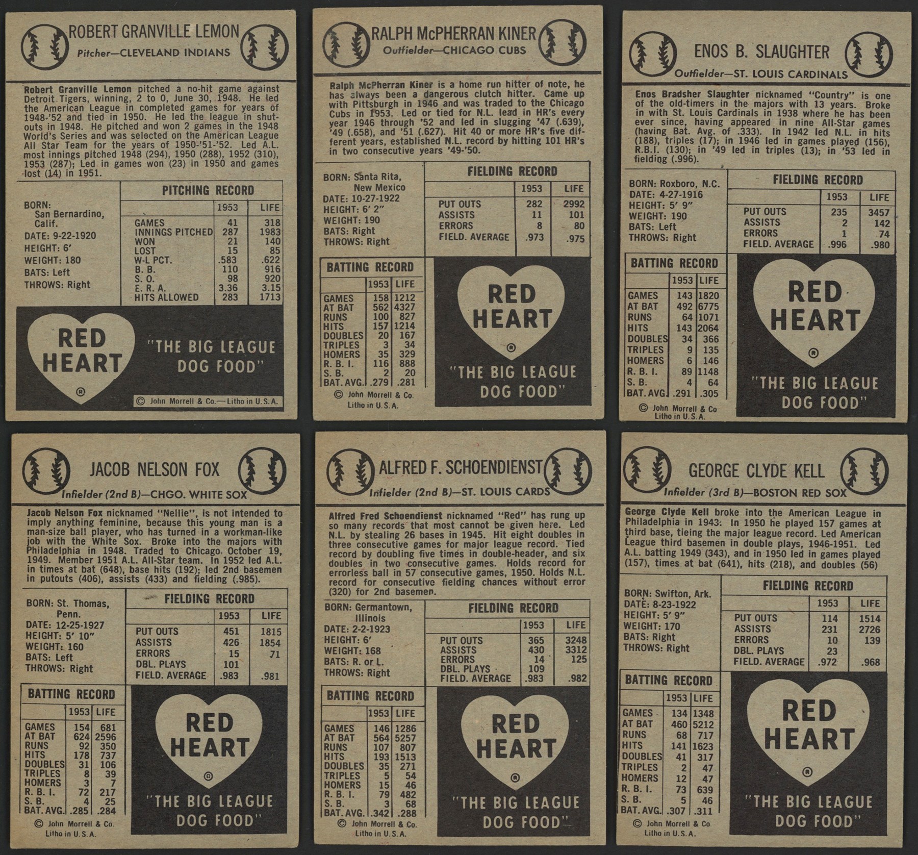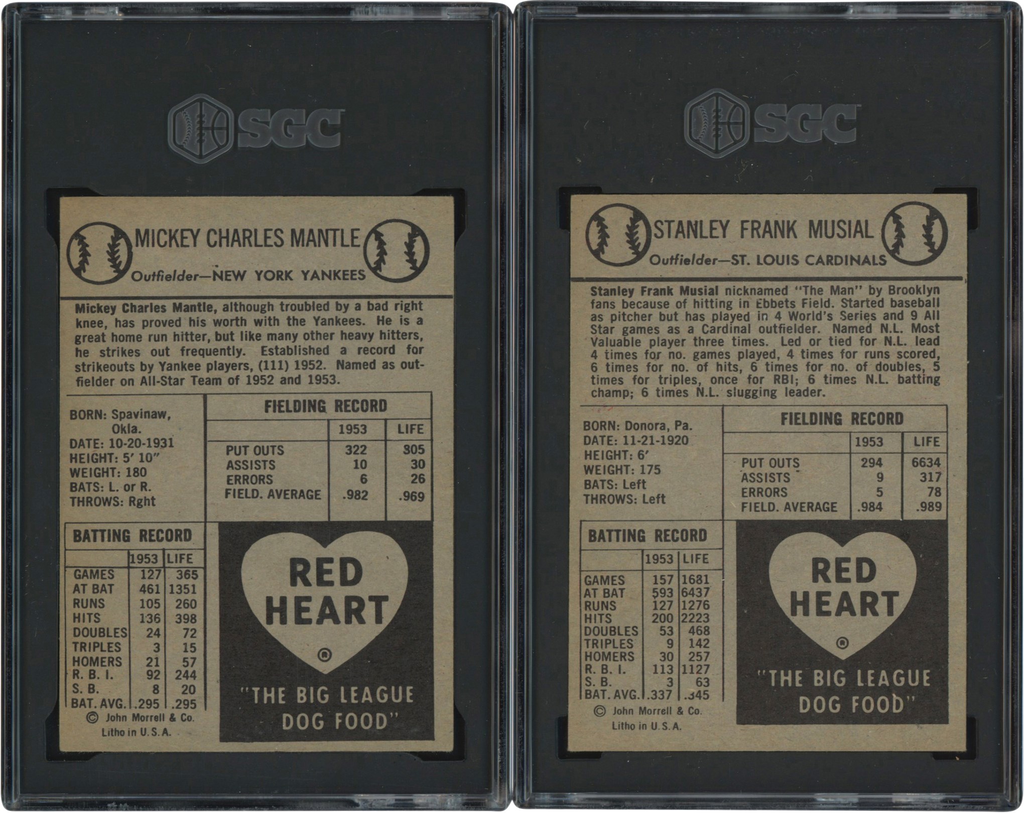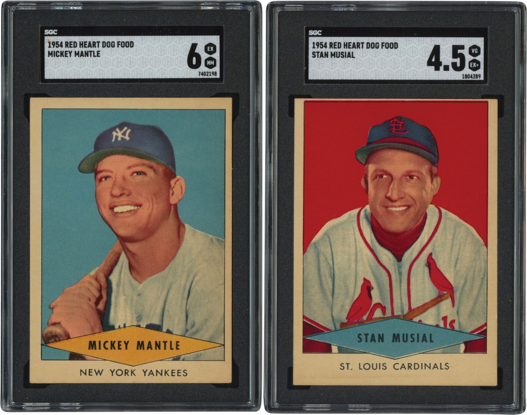 1954 Red Heart Dog Food complete set of (33) cards. (2) cards have been graded and encapsulated by SGC with Mickey Mantle EX-MT 6 and Stan Musial VG-EX+ 4.5. Ungraded highlights include: Ashburn FR; Baumholtz VG; Bell VG-EX; Cox VG; Dark VG-EX; Erskine VG; Fain VG-EX; Fondy GD; Fox EX; Gilliam VG-EX; Hegan EX-MT; Kell VG-EX; Kluszewski EX-MT; Kiner VG-EX; Kuenn EX; Lemon EX; Lollar VG-EX; Martin GD; McDougald EX; McMillan VG-EX; Minoso VG; Pierce EX; Rosen EX; Sauer VG-EX; Schoendienst EX; Slaughter EX; Snider VG; Spahn VG; White VG-EX; Yost EX; Zernial EX.