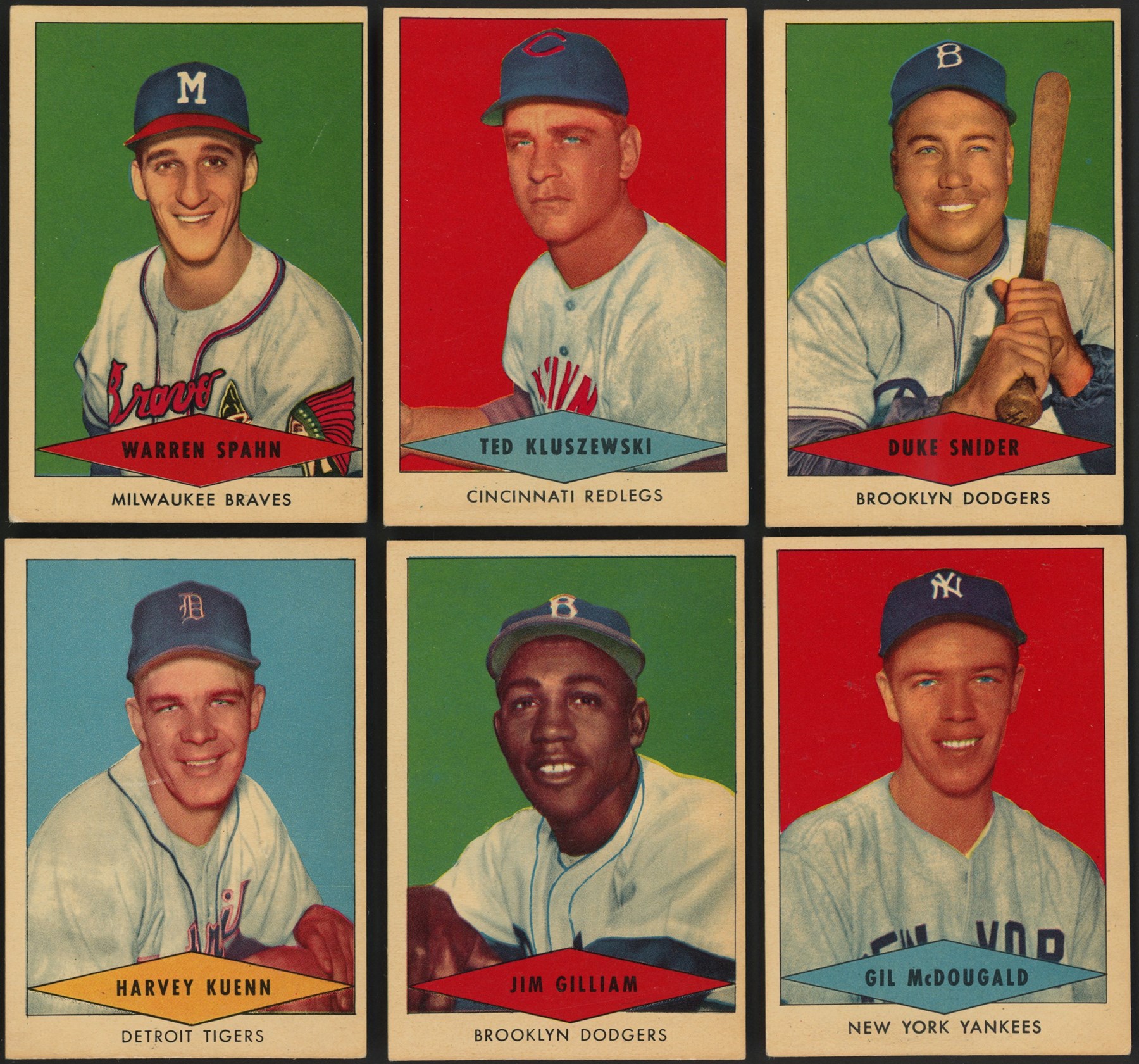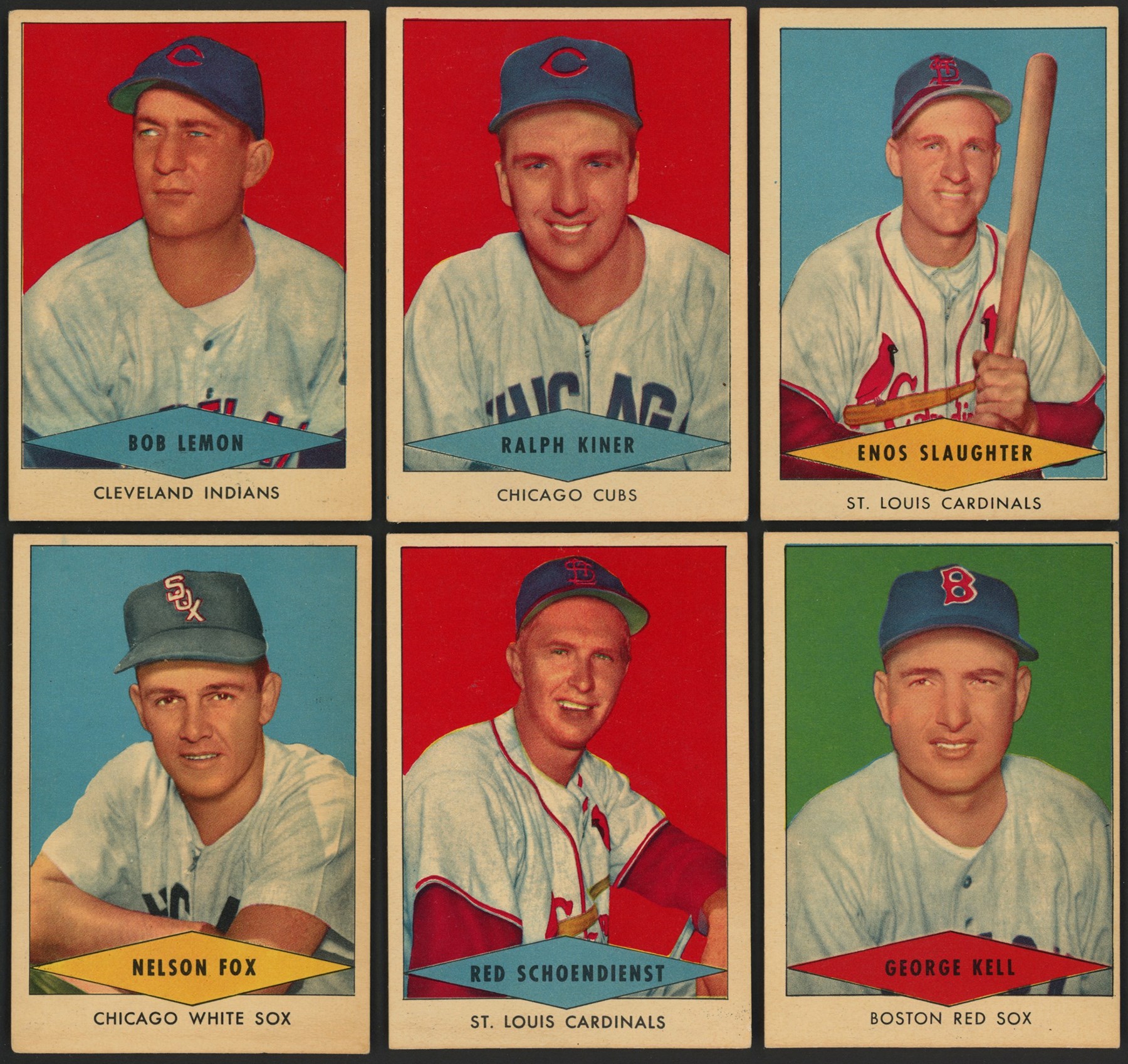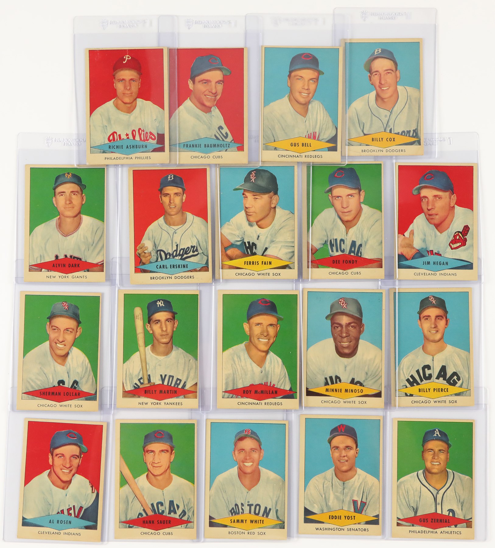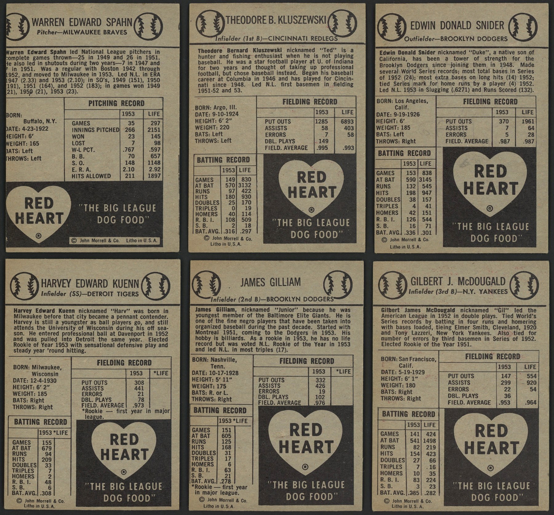 1954 Red Heart Dog Food complete set of (33) cards. (2) cards have been graded and encapsulated by SGC with Mickey Mantle EX-MT 6 and Stan Musial VG-EX+ 4.5. Ungraded highlights include: Ashburn FR; Baumholtz VG; Bell VG-EX; Cox VG; Dark VG-EX; Erskine VG; Fain VG-EX; Fondy GD; Fox EX; Gilliam VG-EX; Hegan EX-MT; Kell VG-EX; Kluszewski EX-MT; Kiner VG-EX; Kuenn EX; Lemon EX; Lollar VG-EX; Martin GD; McDougald EX; McMillan VG-EX; Minoso VG; Pierce EX; Rosen EX; Sauer VG-EX; Schoendienst EX; Slaughter EX; Snider VG; Spahn VG; White VG-EX; Yost EX; Zernial EX.