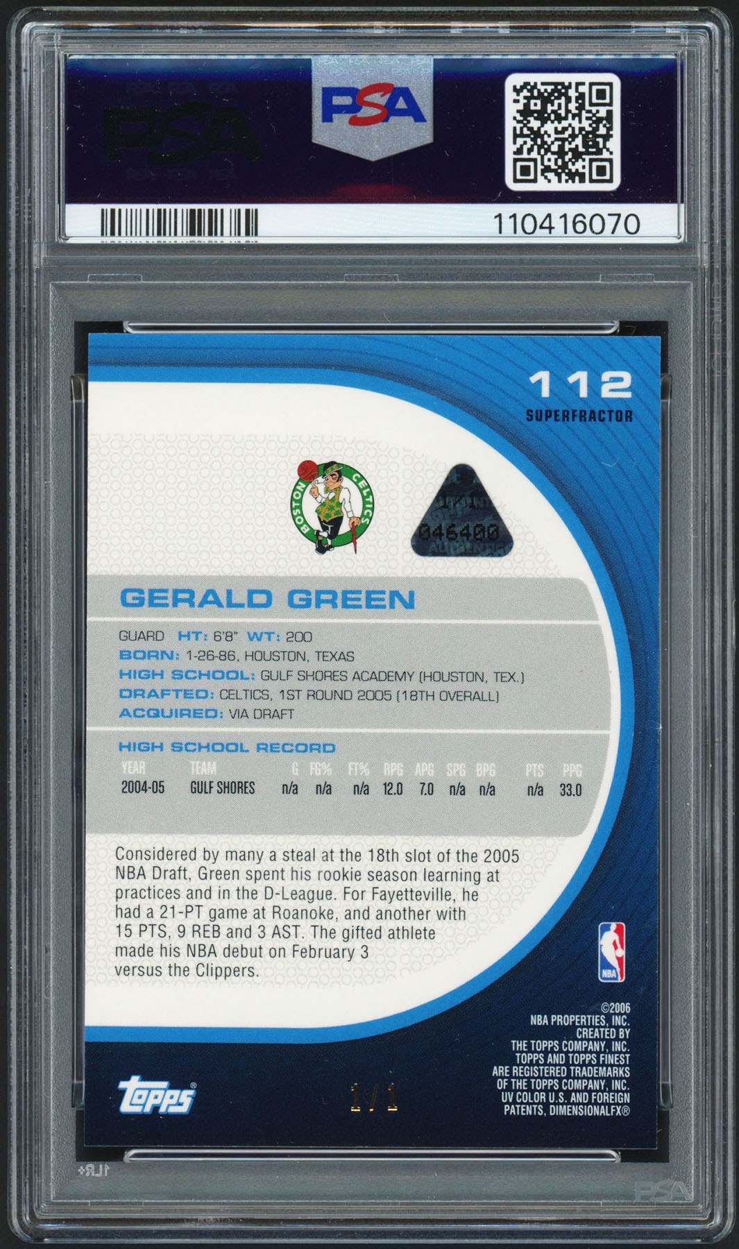 Lot # 74: 2005 Finest Basketball Superfractor #112 Gerald Green Rookie #1/1 PSA GEM MINT 10