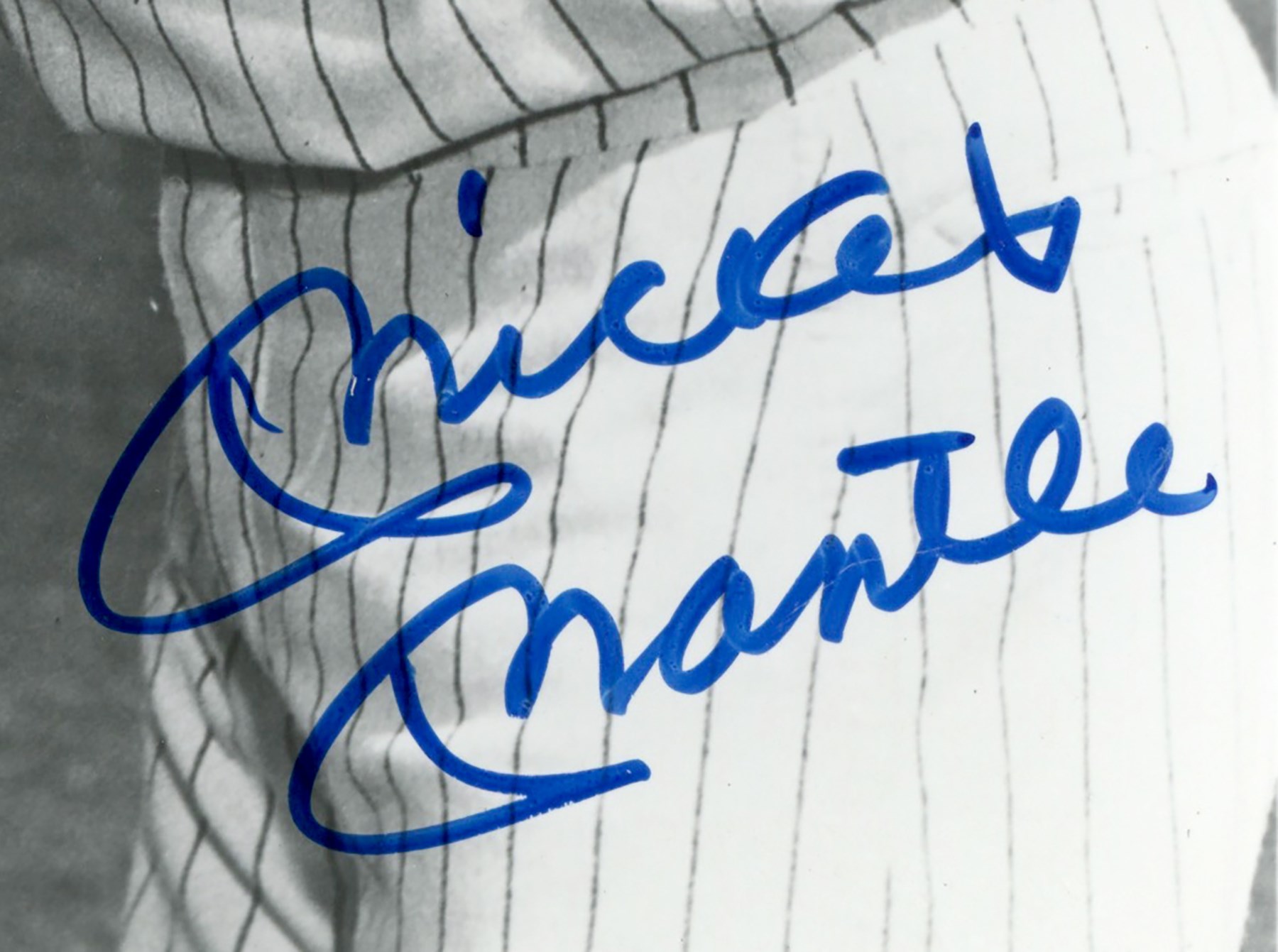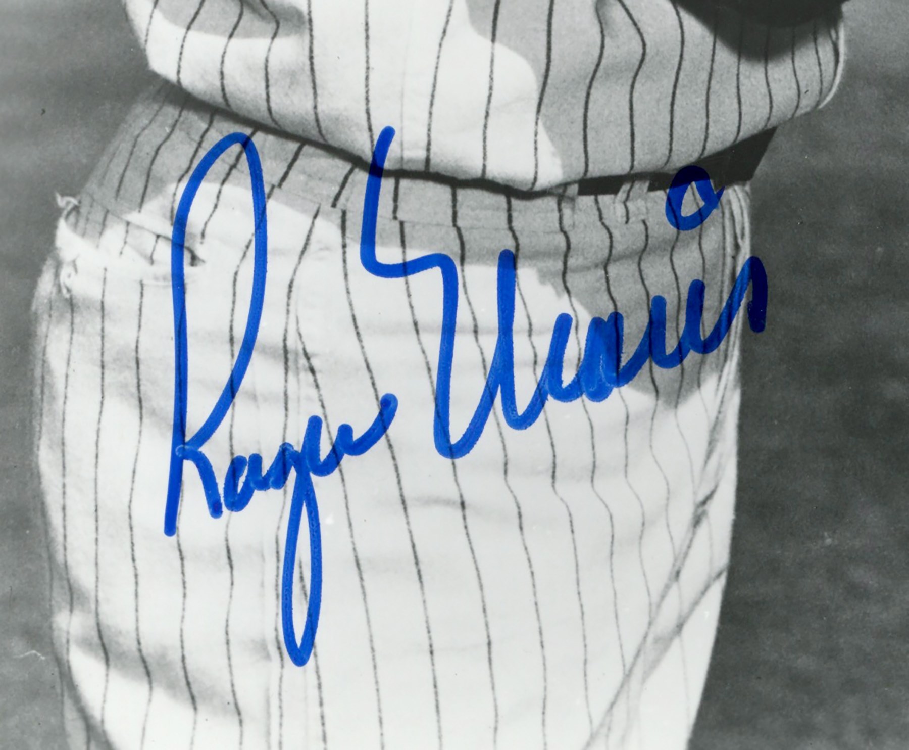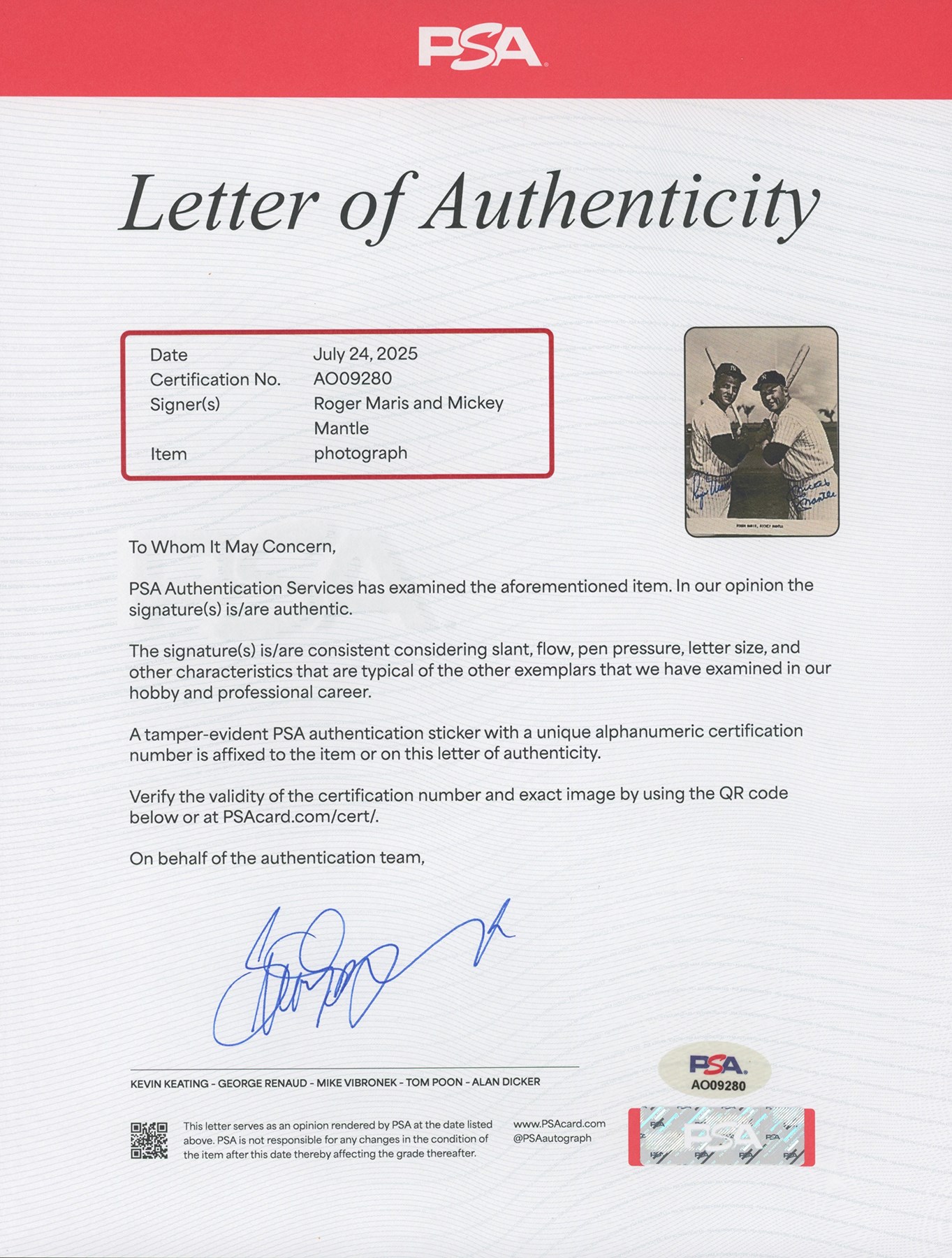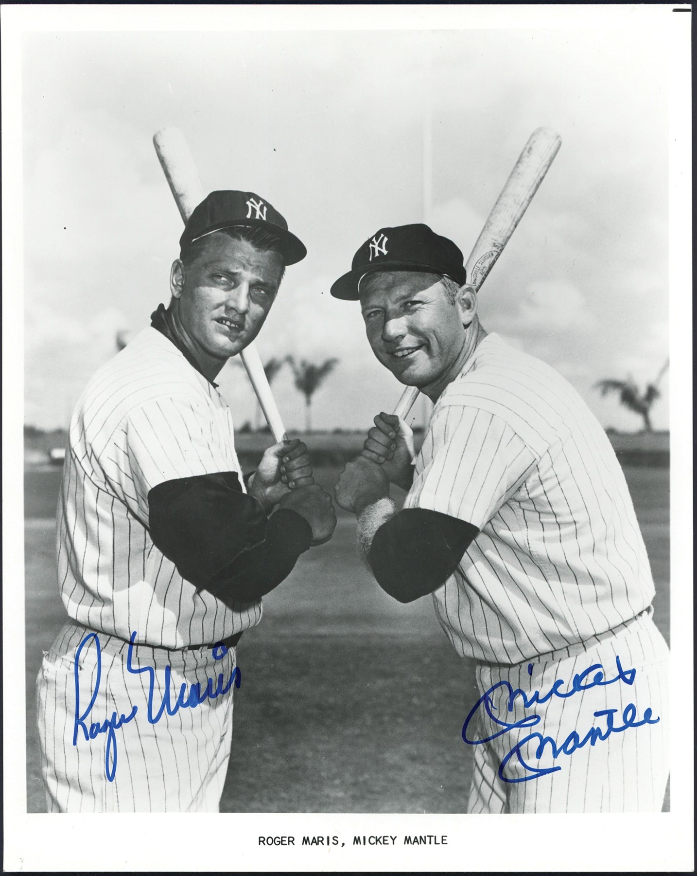 Black-and-white photo of Mickey Mantle and Roger Maris posing together at spring training, signed by each player in blue Sharpie upon his respective image. Each signature has been flawlessly executed and grades 10/10. The photo (8x10") displays a few light surface wrinkles/creases and is Excellent in its overall appearance. Full LOA from PSA.