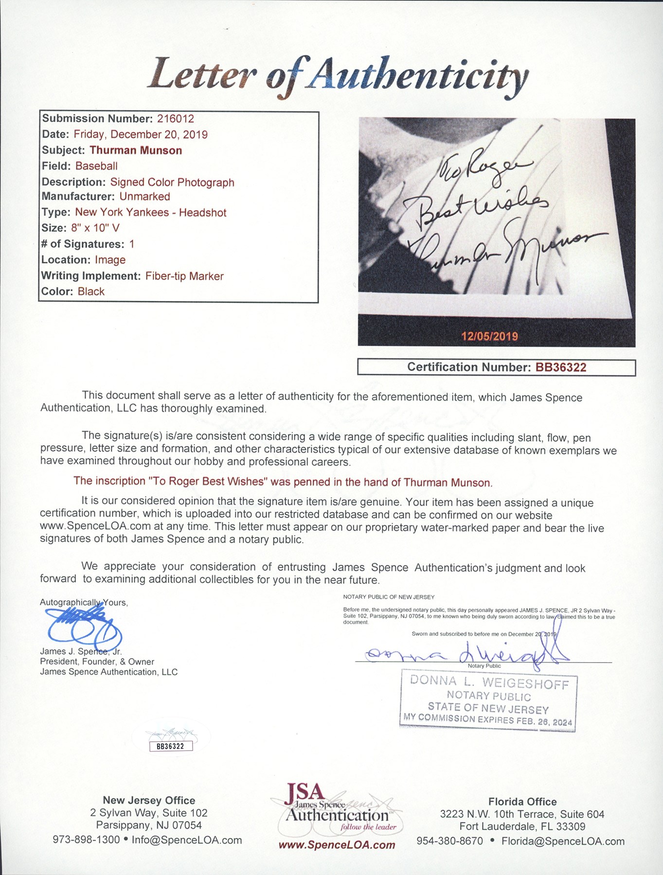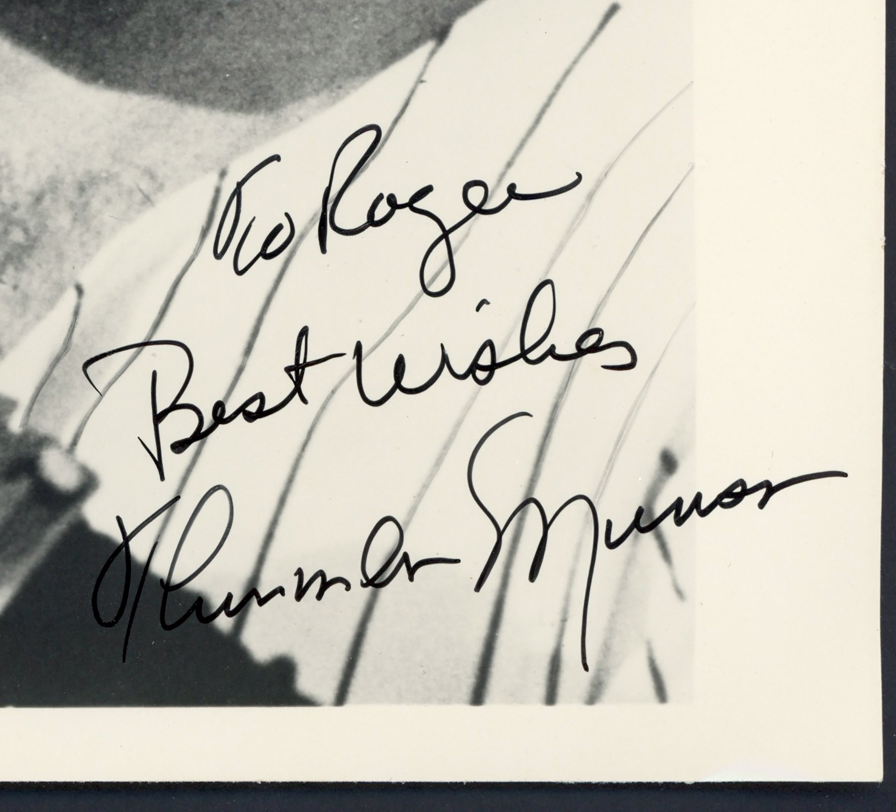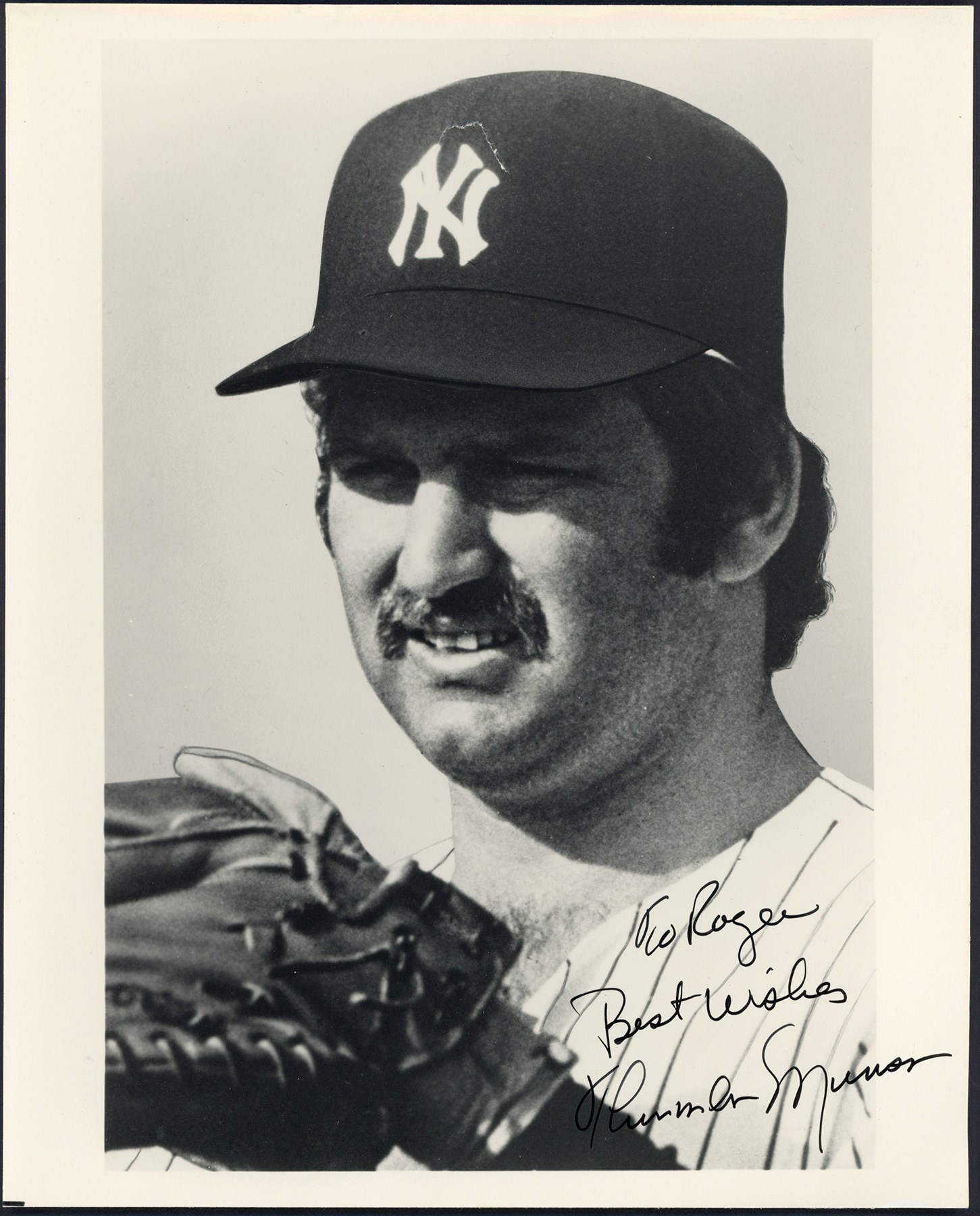 Photograph of Thurman Munson, beautifully signed by Munson in the lower right corner. Munson has inscribed the photo in black marker "To Roger/Best Wishes/Thurman Munson," with both the inscription and signature grading 10/10. Munson was not very accommodating to autograph collectors during his career and that fact, along with his tragic death in 1979, has resulted in the scarcity of his signature today. The photo (8x10") displays a small approximate half-inch tear (no paper loss) in the area of Munson's cap and is otherwise in Excellent condition. Full LOA from JSA.