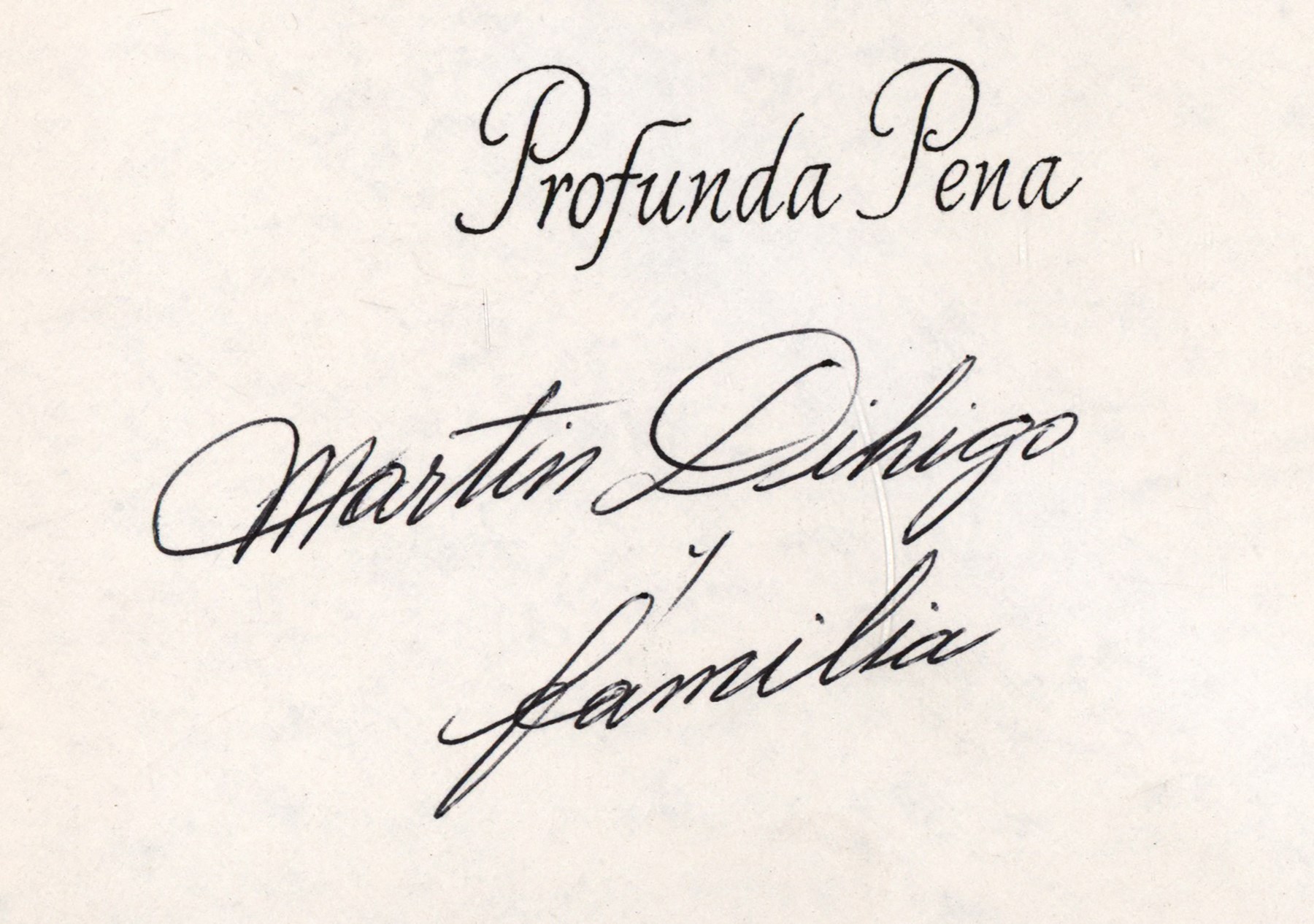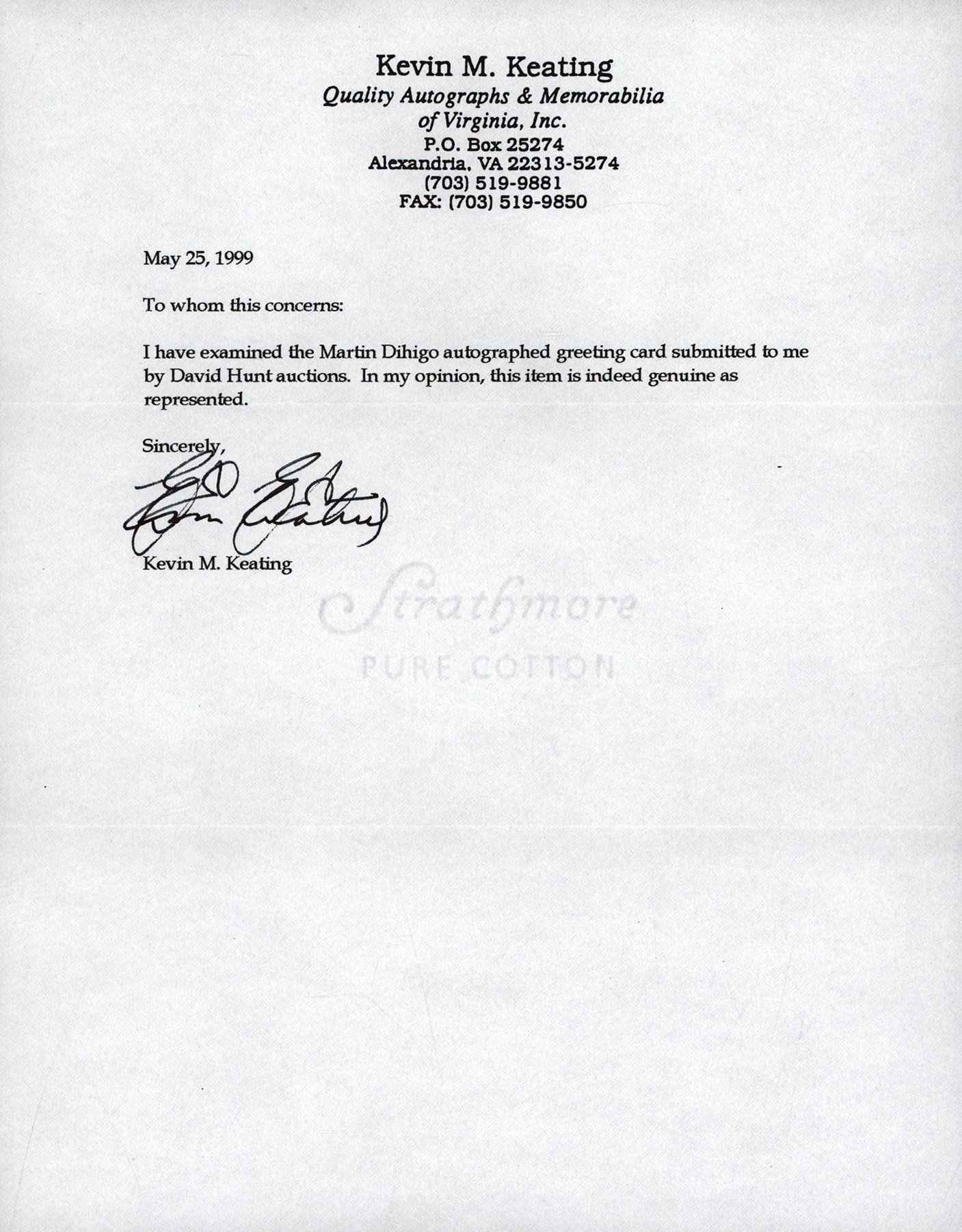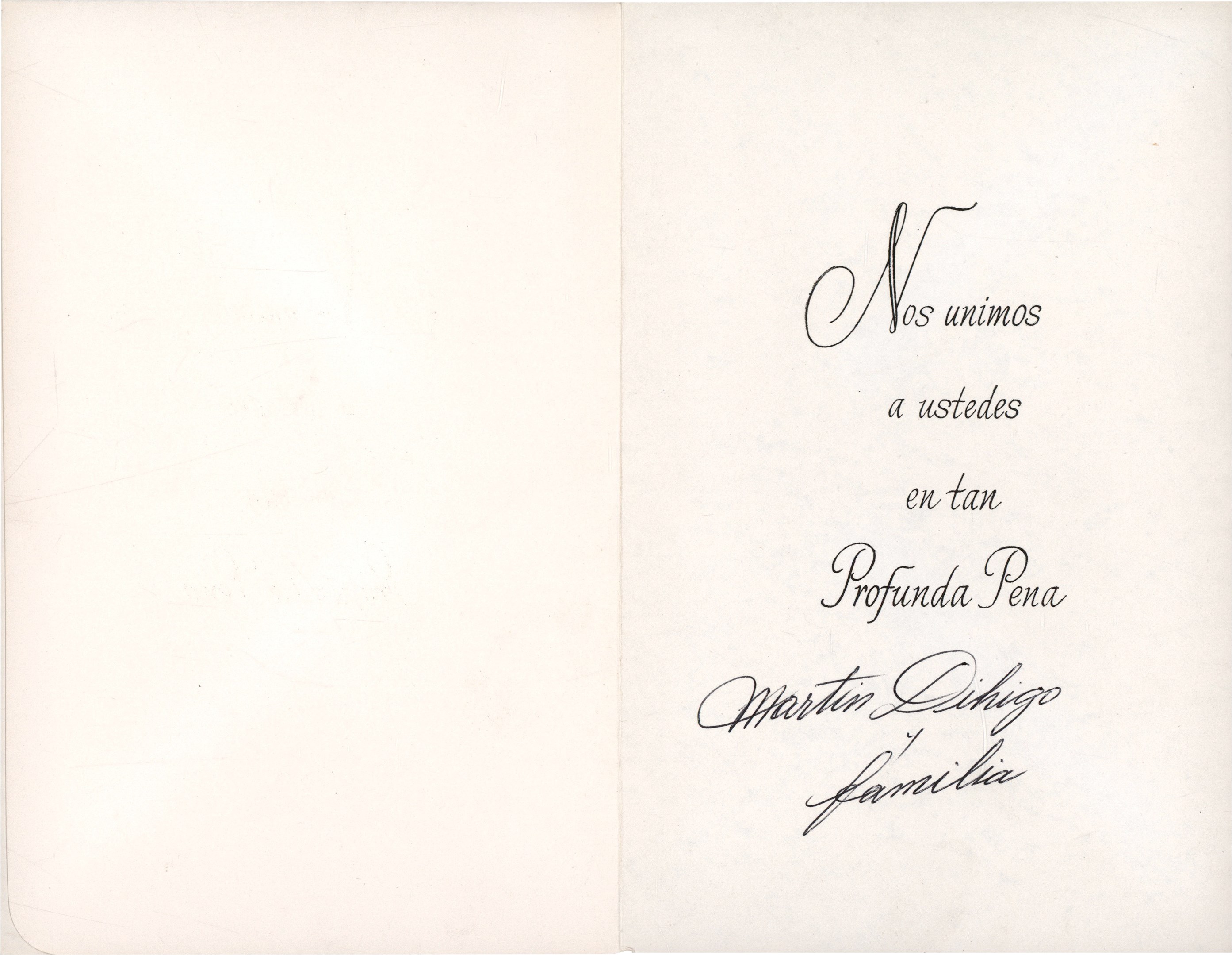 Sympathy card (all text in Spanish) signed on the interior by Negro League Hall of Fame pitcher/infielder Martin Dihigo. Dihigo has inscribed the card "Martin Dihigo + familia" in black ink, with the signature grading 9/10. Martin Dihigo's signature is rare today. A native of Cuba, he returned to his homeland after his playing career (late 1940s) and was therefore not readily accessible to autograph collectors. Also, Dihigo died in 1971, but wasn't elected to the Hall of Fame until 1977, so his signature was not highly sought after by collectors while he was active. The fold-over card (4.75x7.25"; folded) remains in Excellent to Mint condition. Full LOA from PSA.