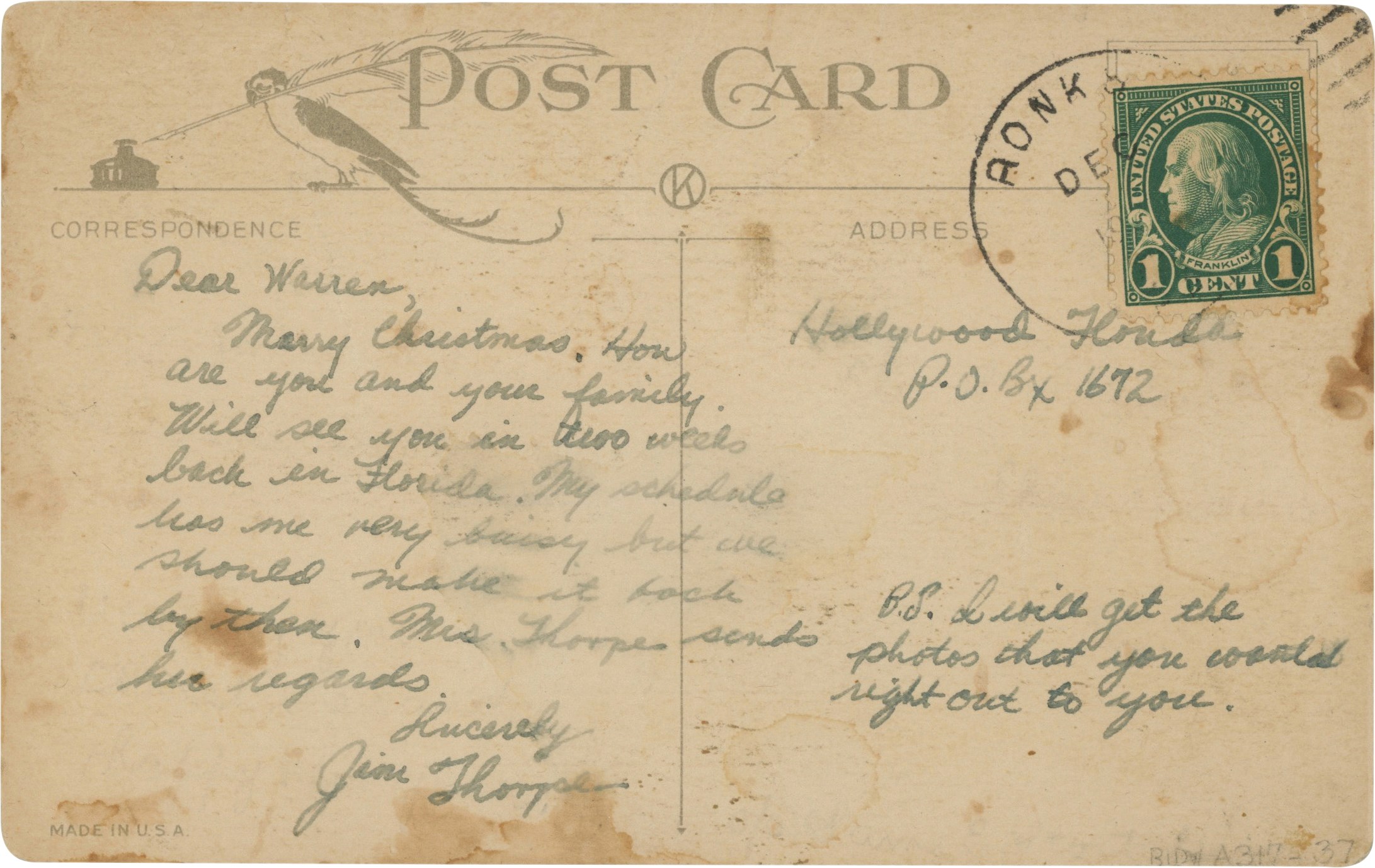 Christmas postcard signed by legendary Olympic athlete Jim Thorpe. In his note, Thorpe writes to a friend and lets him know that he will see him soon. In full:
