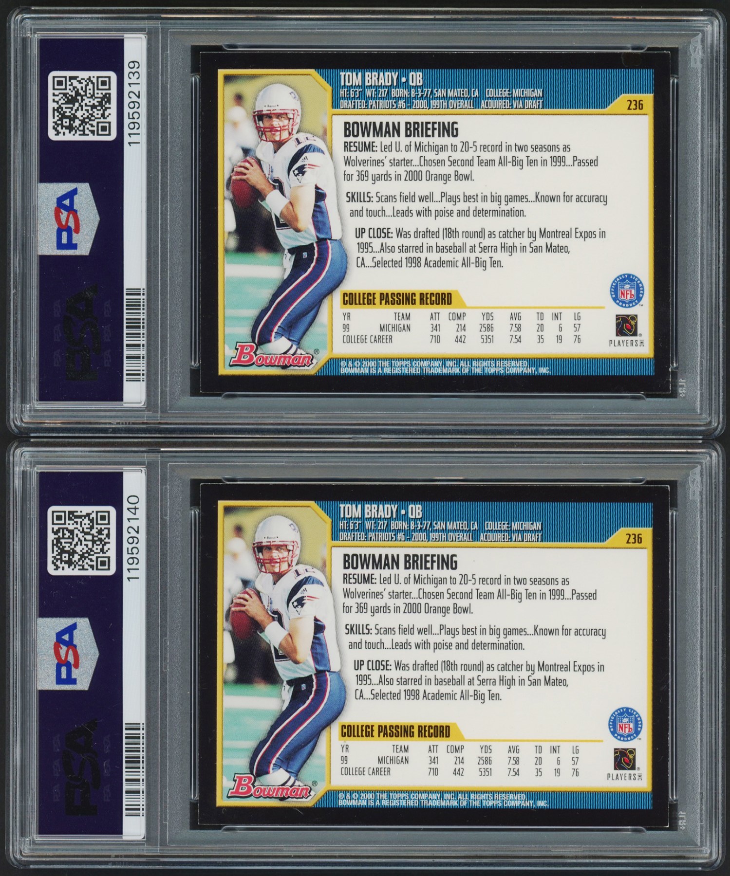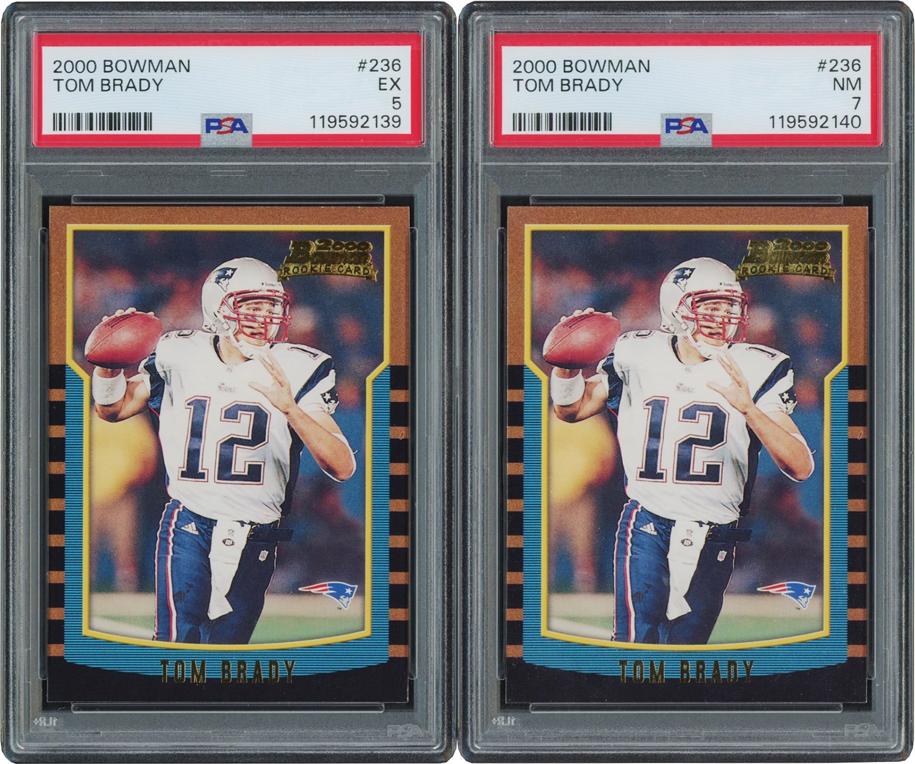 Lot # 117: 2000 Bowman Football #236 Tom Brady Rookies (PSA 7 & PSA 5)