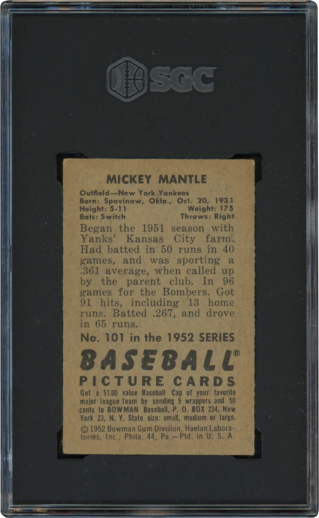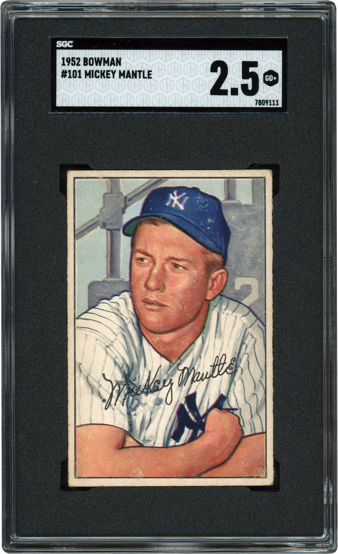 1952 Bowman Baseball 101 Mickey Mantle card. The card has been graded and encapsulated by SGC GD+ 2.5. It has a colorful image of Mantle with arms crossed set against a stadium railing background. The borders are white while the edges have scattered roughness most prevalent on the right edge. Centering is slightly off top to bottom. All four corners have light to moderate rounding. There is scattered color rubbing throughout but most apparent on Mantle's hat and arms. The reverse appears clean.