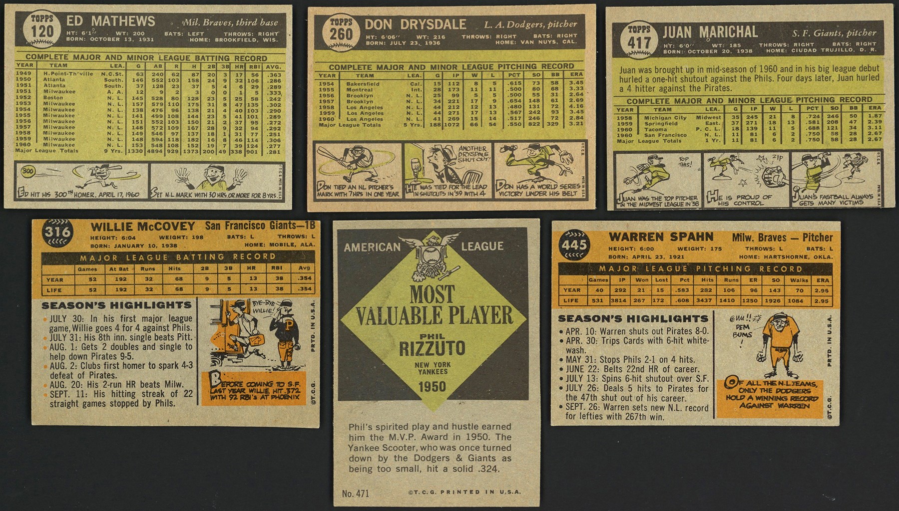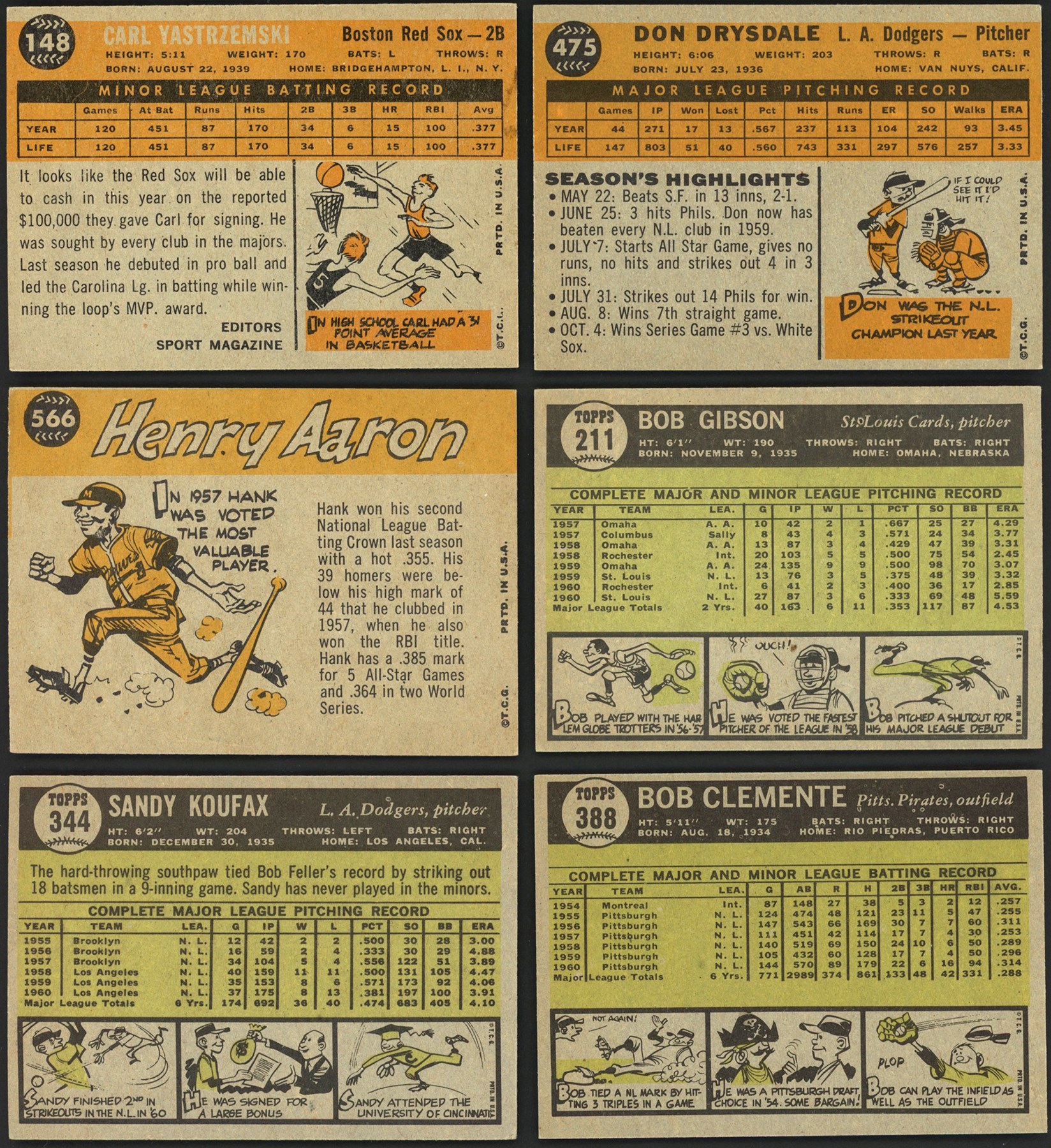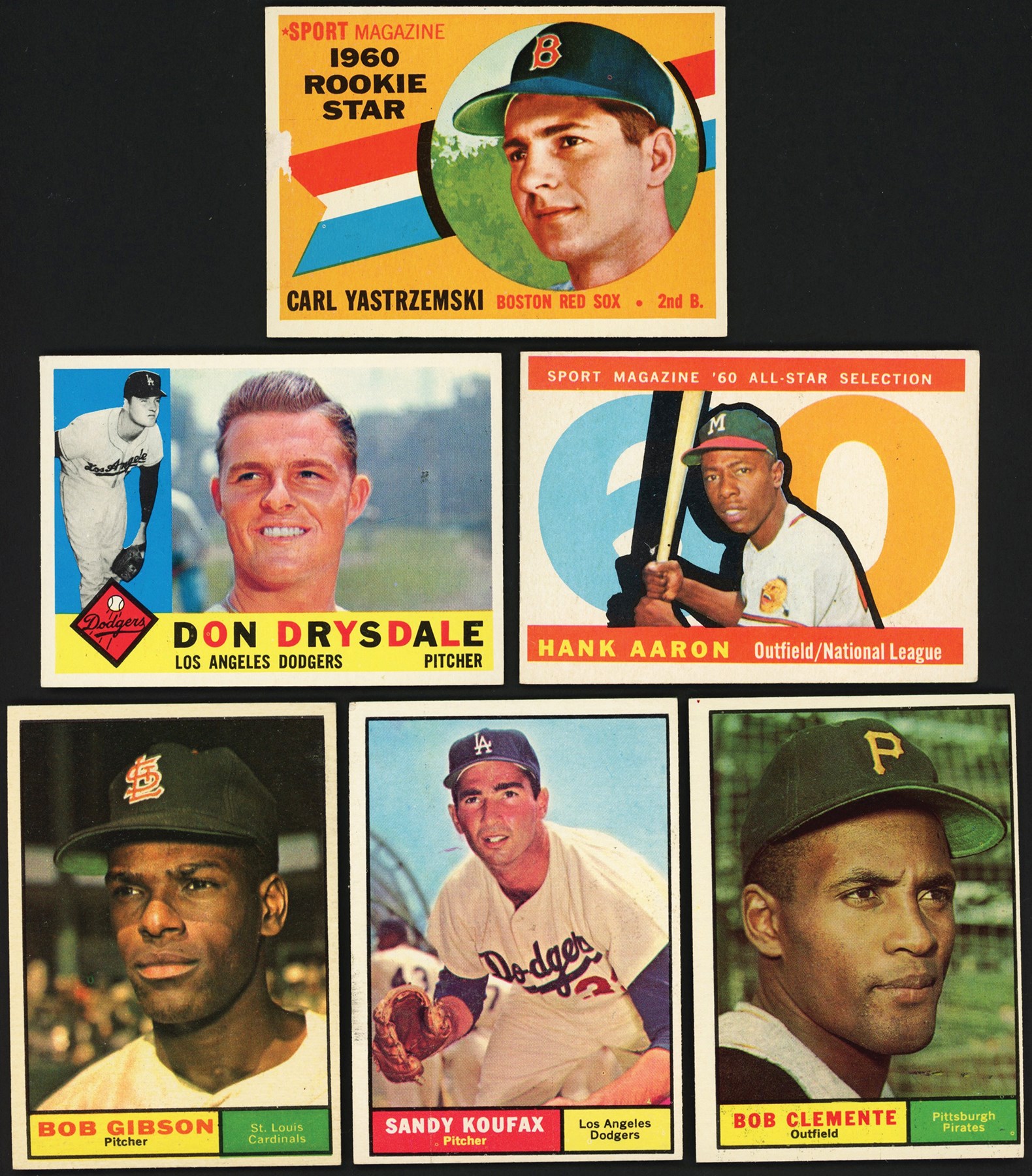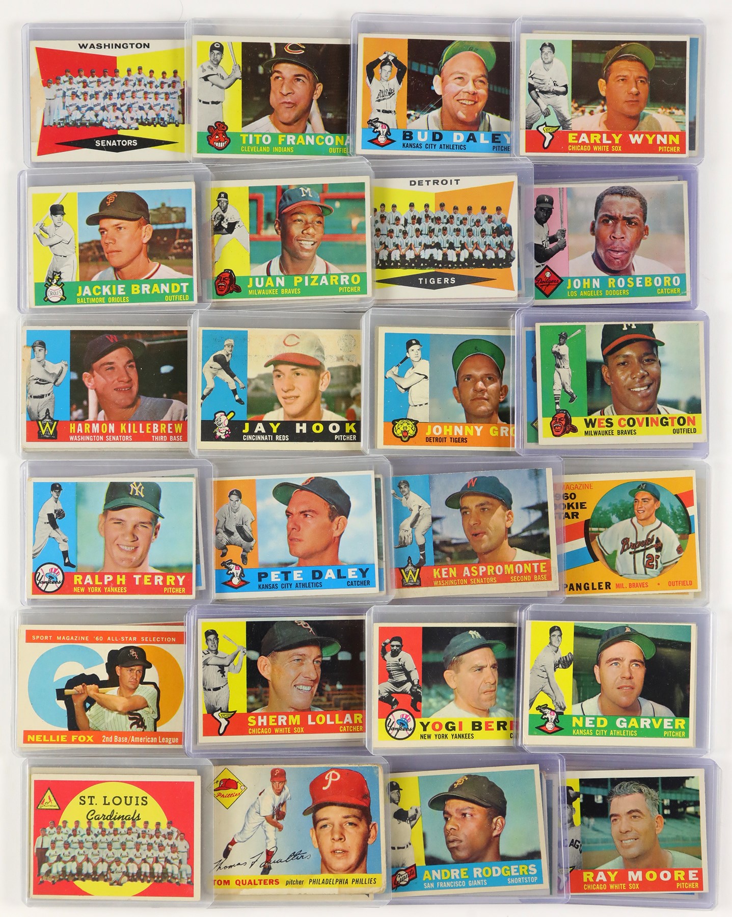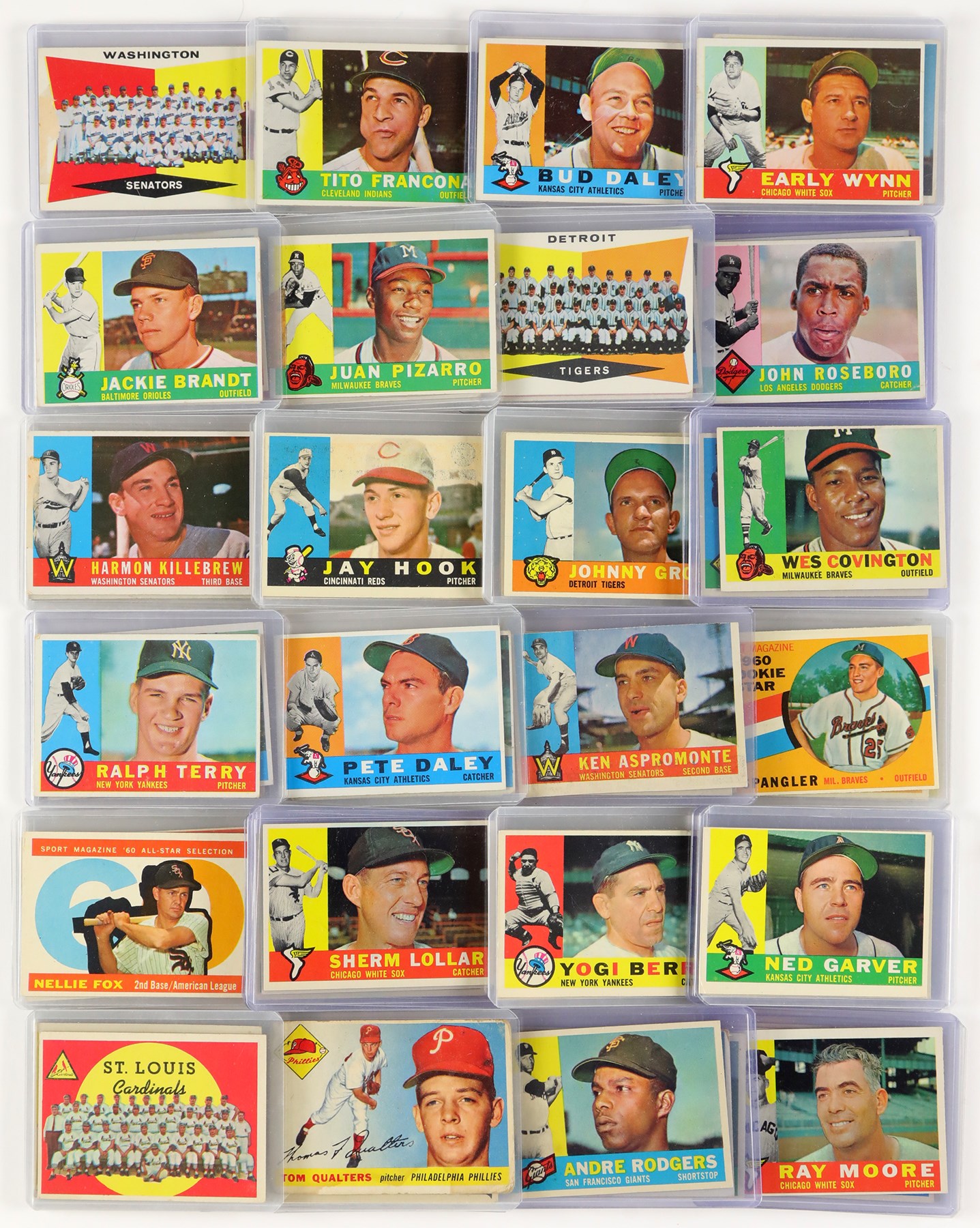 1960 Topps (115): 1 Wynn VG, 3, 4, 7 Master and Mentor VG, 8, 30 (two examples), 42, 43, 51, 52, 53, 55 Mazeroski VG, 56, 59, 65, 70 (two examples), 72, 74, 76, 85, 88, 91, 94 (two examples), 96, 97 (two examples), 108, 110, 113, 114, 117, 118, 121, 143, 146, 148 Yastrzemski (R) PR-Paper loss front, 153, 155, 158, 167, 168 (two examples), 171, 180, 181, 183, 187, 196, 205, 209, 210 Killebrew PR Paper loss front, 218, 221, 249, 260, 262, 267, 276, 287 (two examples), 299 (two examples), 314, 316 McCovey (R) VG-EX (MC), 327, 340 (two examples), 344 (two examples), 345, 353, 355, 360, 364, 365 Minoso VG-EX, 366, 373, 378, 381, 390, 391, 394, 399, 431, 436, 444, 445 Spahn VG-EX, 447, 453, 454, 456, 471, 472, 473, 475 Drysdale VG-EX, 476, 480 Berra PR-Paper loss front, 484, 488, 493 Snider VG, 495, 503, 504, 512, 536, 541, 555 Fox AS VG-EX, 560 Banks AS VG, 561 Kaline AS VG-EX, 566 Aaron AS VG, 568, and 569.