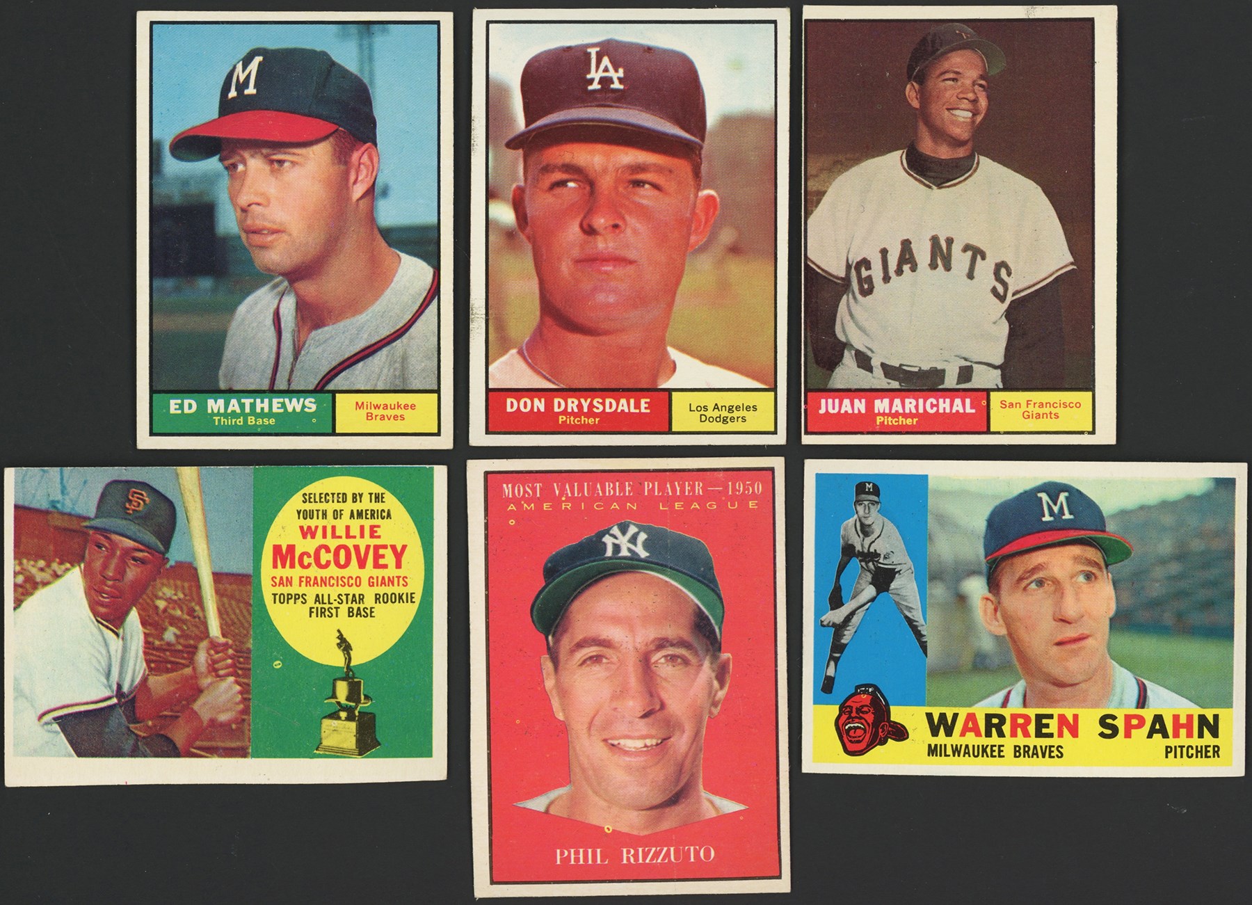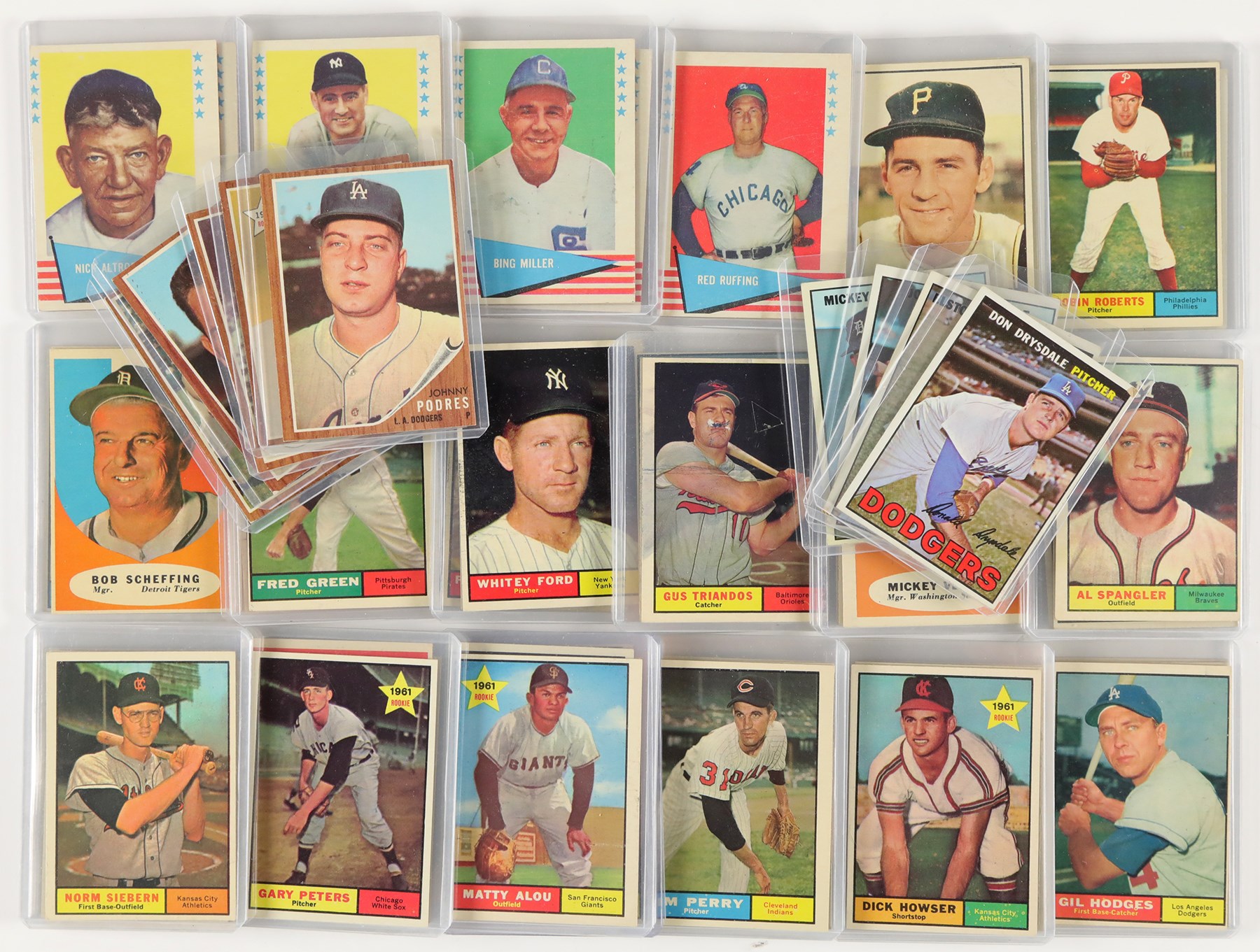 1961 Topps (55): 1, 6, 8 D. Williams VG, 20 Roberts (two examples) (1) VG (1) VG-EX, 43, 73, 113 (two examples), 120 Mathews EX, 134, 136 Alston VG-EX, 138, 140 (two examples), 158, 160 Ford VG-EX, 168, 171, 181, 191, 195, 211 Gibson EX, 223, 232, 241, 260 Drysdale VG-EX, 267, 292, 296, 301, 303, 311, 320, 326, 327, 341, 344 Koufax VG, 353, 365, 367, 385, 388 Clemente VG, 393, 394, 410, 416, 417 Marichal (R) EX (MC), 453, 456, 460 Hodges (two examples) (1) VG (1) VG-EX, 471 Rizzuto MVP EX, and 490 Bunning (two examples) (2) VG-EX.