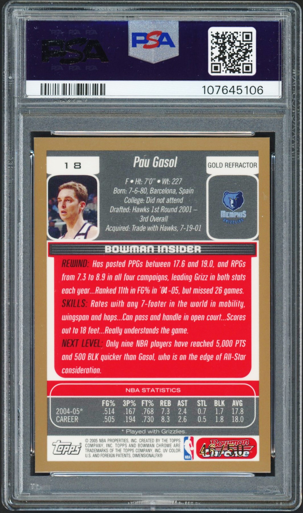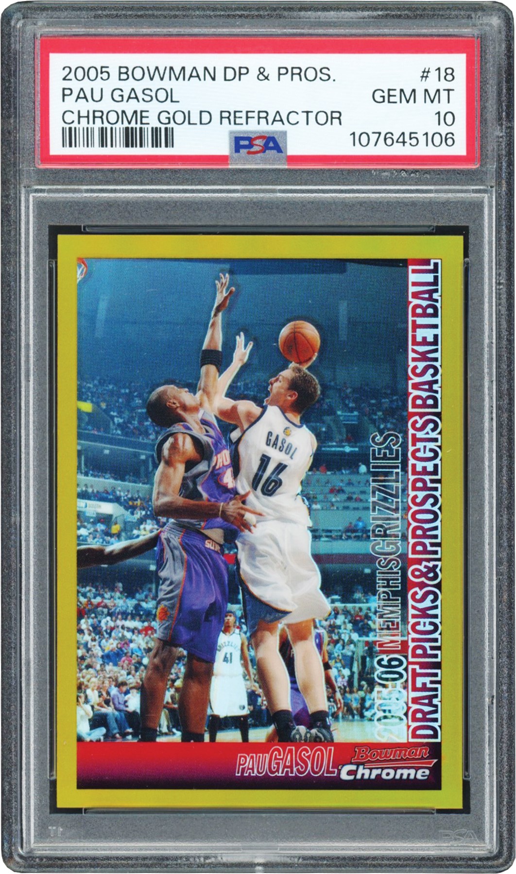 This lot features a 2005 Bowman Draft Picks & Prospects #18 Pau Gasol Chrome Gold Refractor #46/50. This card has been graded and encapsulated by PSA GEM MINT 10. This card is POP 2 highest graded in the PSA registry. This card is number 46 out of only 50 copies of this card that were produced. This card is hobby fresh and was submitted to PSA by Leland's in the Summer of 2025.