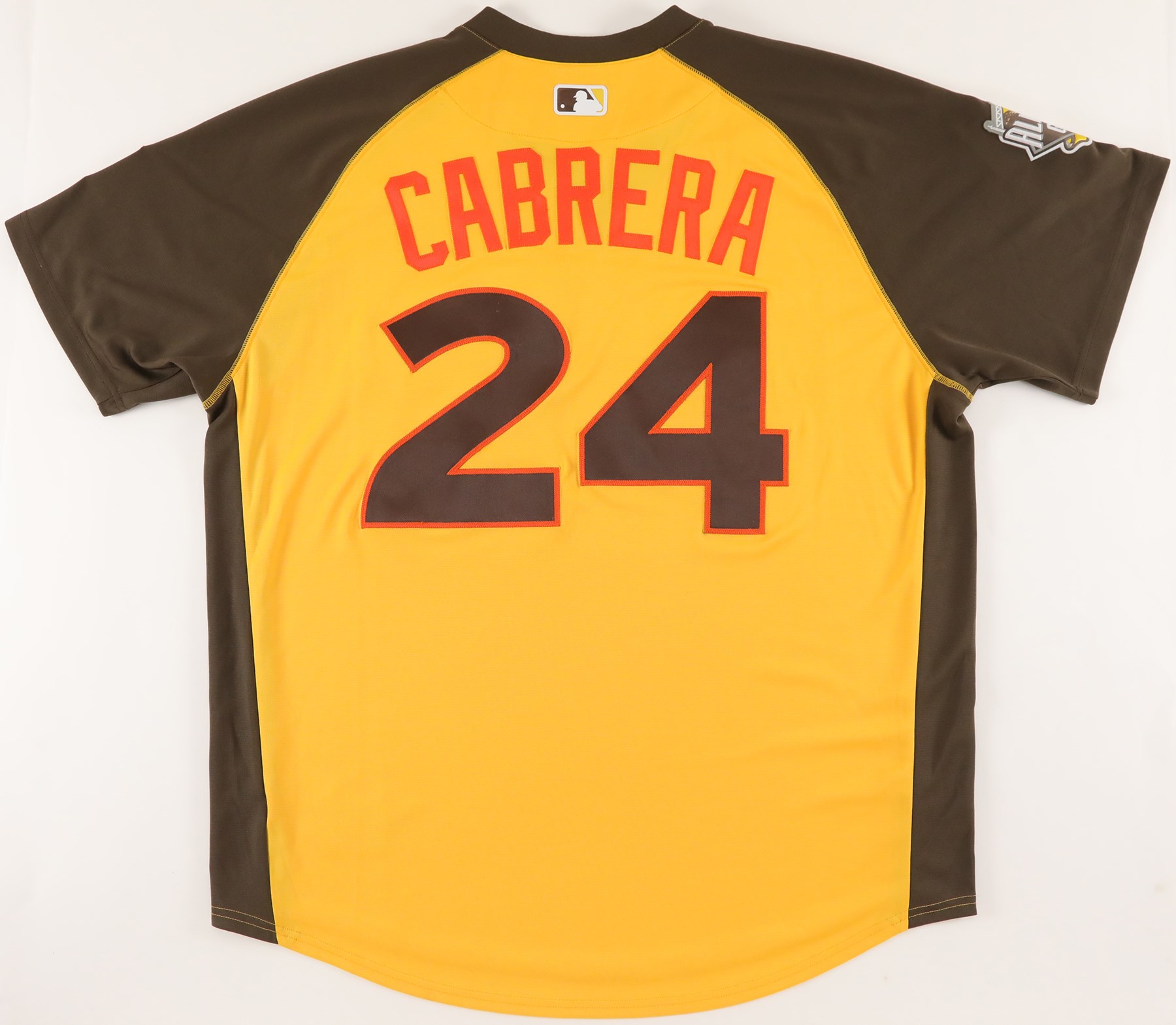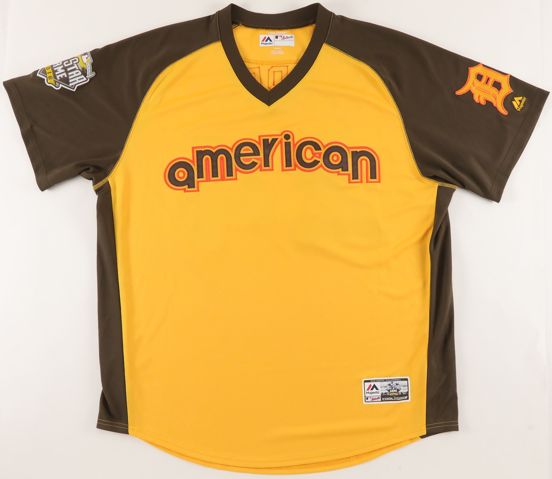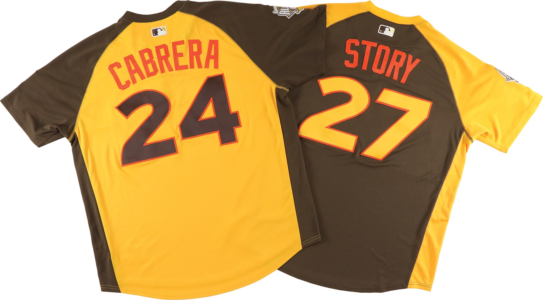 Miguel Cabrera and Trevor Story 2016 All-Star game jerseys. Each jersey in the lot has the Majestic/MLB Authentic patch printed on the front left tail, and the All-Star Game 2016 patch on the left sleeve. The Cabrera jersey has a Tigers "D" logo on the left sleeve. "american" is sewn across the chest of the the pullover-style jersey, and "CABRERA" is sewn to the back, above "24." "50/50/50" is printed inside the back neck area. The Trevor Story jersey has "national" across the chest in lower case letters. "STORY" is on the back, above "27." The Rockies "CR" logo is sewn to the left sleeve, and "46/46/46" is printed inside the neck area. The laundry tags inside of each jersey have "Inspected By" stickers on them, suggesting that these are possibly game-issued jerseys. The jerseys are in near-mint condition and do not show signs of game use.