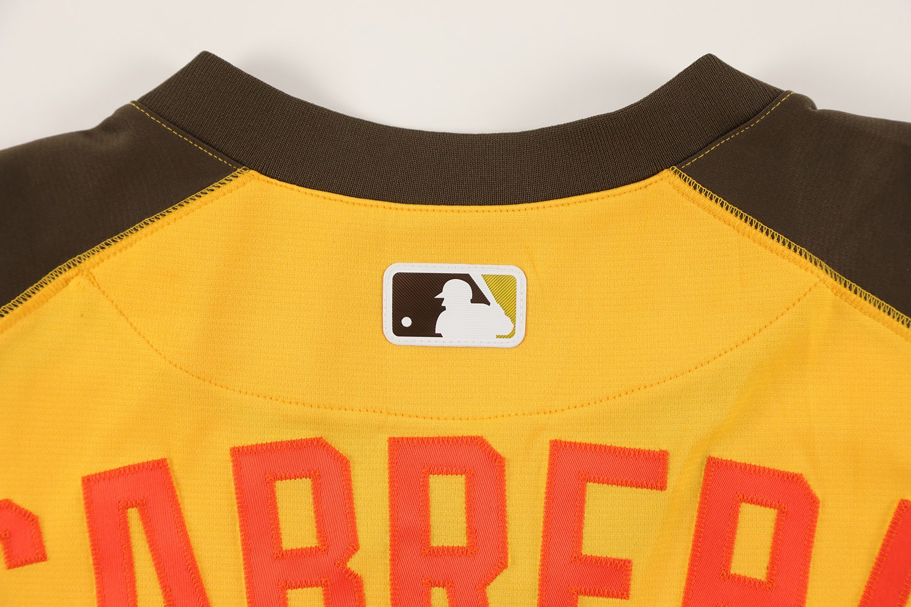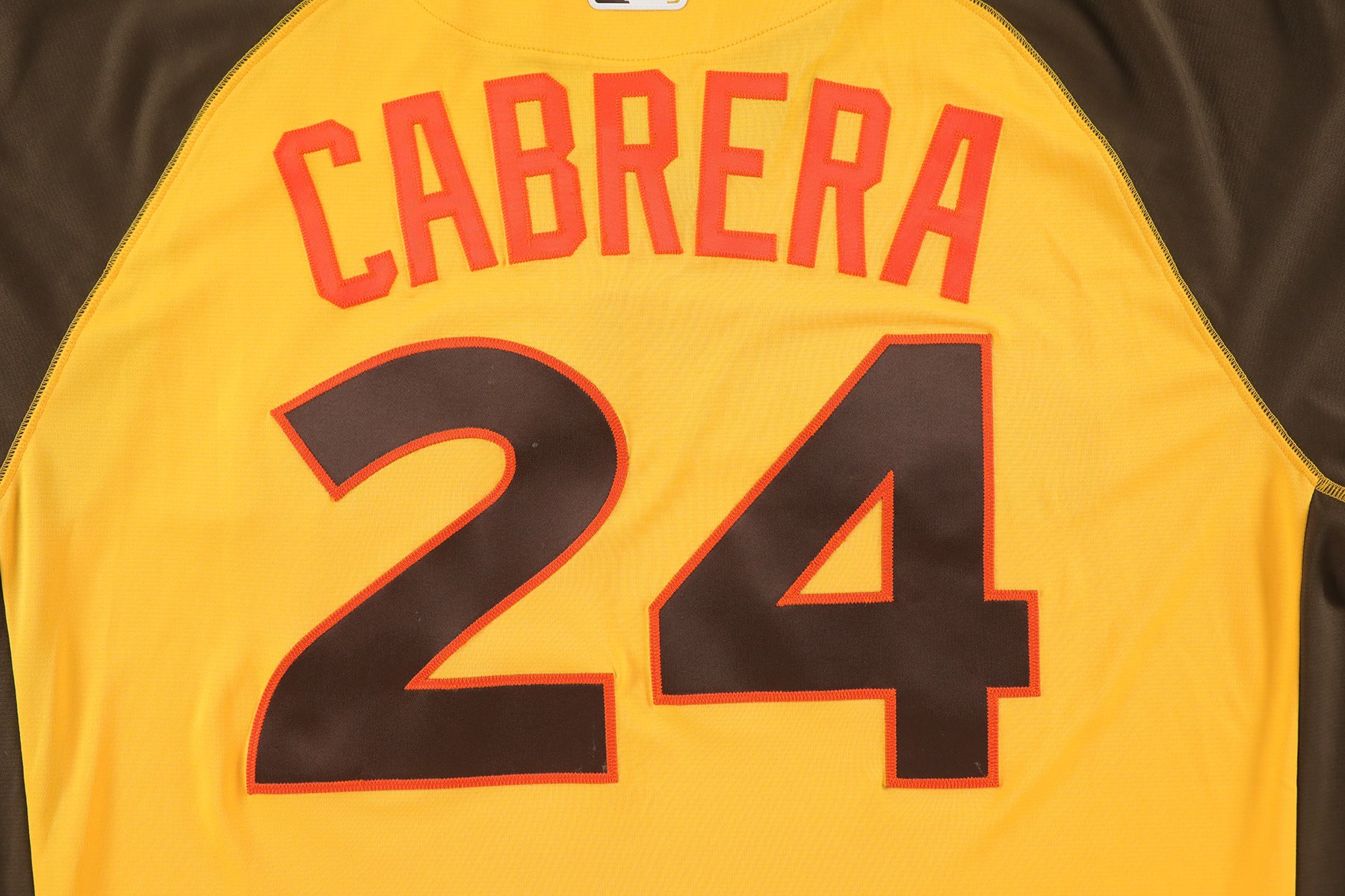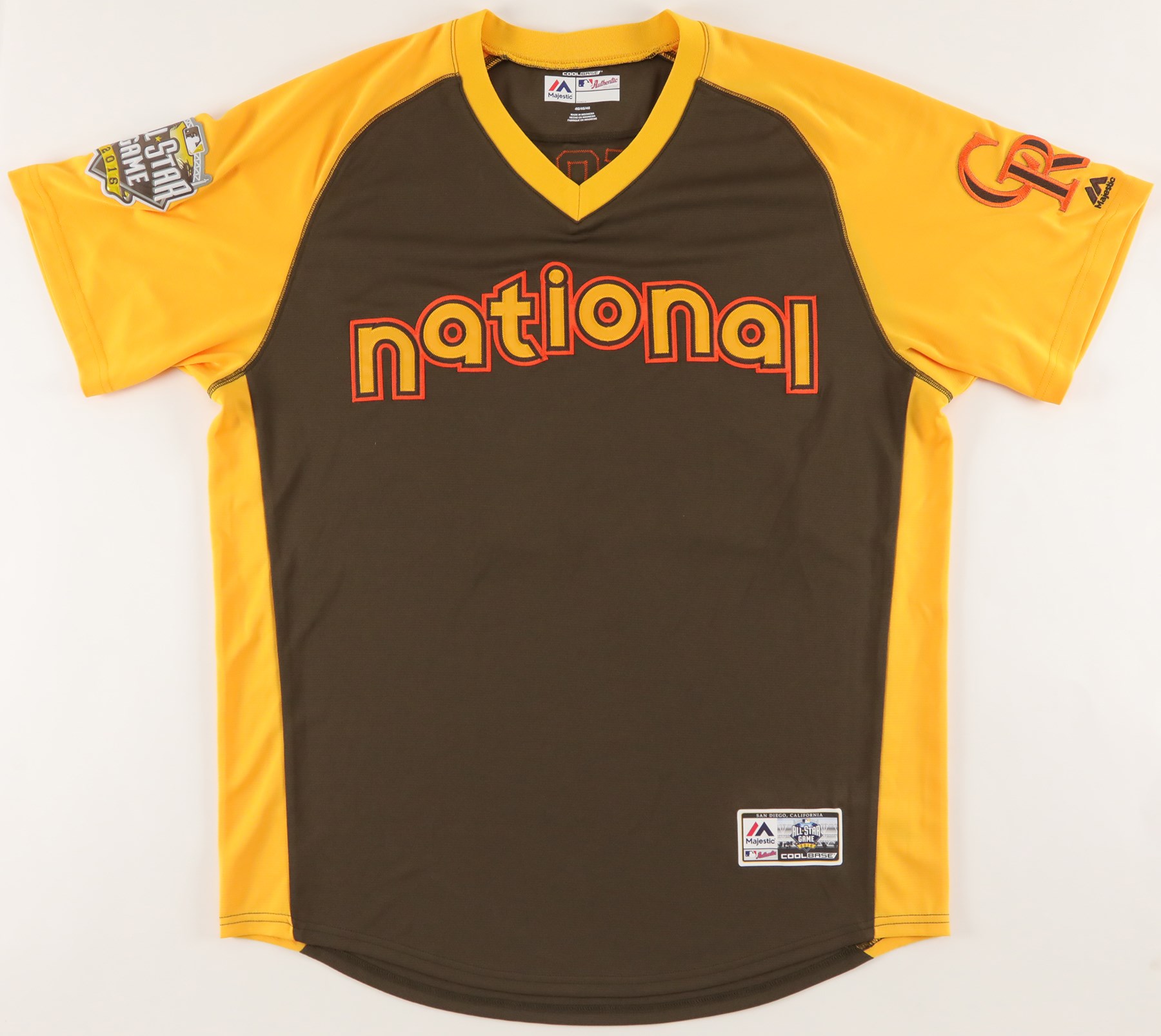 Miguel Cabrera and Trevor Story 2016 All-Star game jerseys. Each jersey in the lot has the Majestic/MLB Authentic patch printed on the front left tail, and the All-Star Game 2016 patch on the left sleeve. The Cabrera jersey has a Tigers "D" logo on the left sleeve. "american" is sewn across the chest of the the pullover-style jersey, and "CABRERA" is sewn to the back, above "24." "50/50/50" is printed inside the back neck area. The Trevor Story jersey has "national" across the chest in lower case letters. "STORY" is on the back, above "27." The Rockies "CR" logo is sewn to the left sleeve, and "46/46/46" is printed inside the neck area. The laundry tags inside of each jersey have "Inspected By" stickers on them, suggesting that these are possibly game-issued jerseys. The jerseys are in near-mint condition and do not show signs of game use.