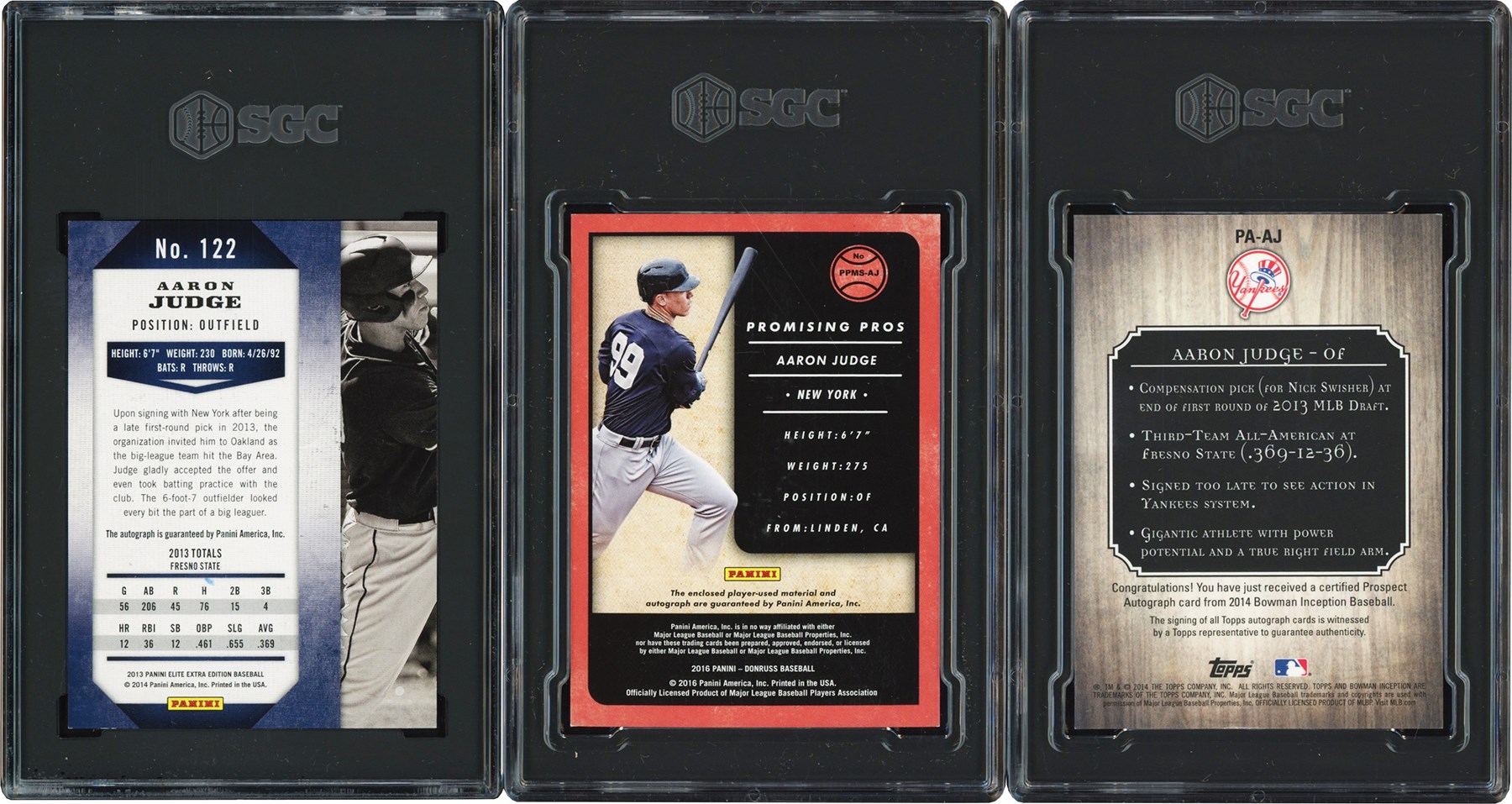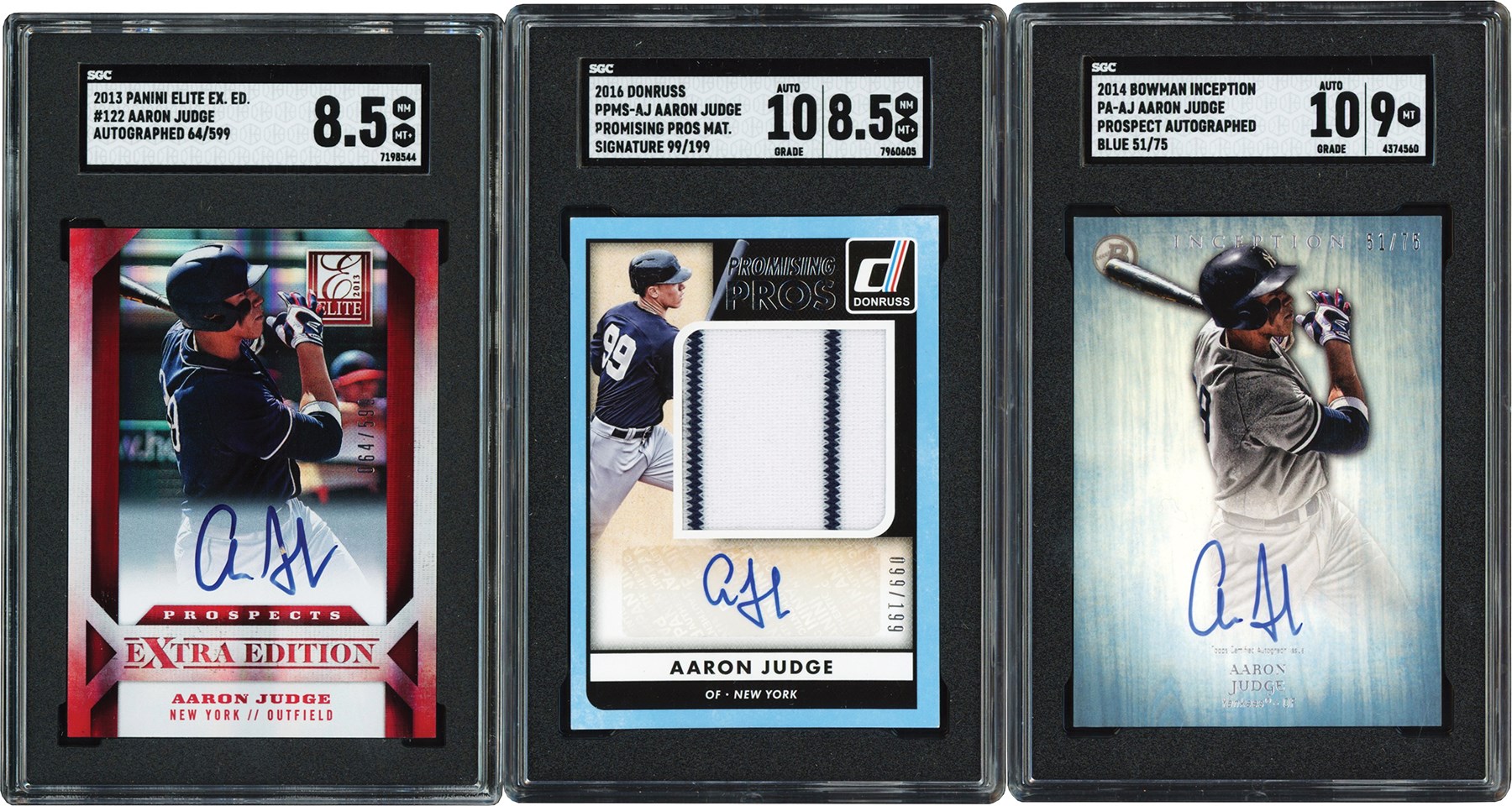 2013-16 Aaron Judge collection of (3) autographed cards. All of the cards have been graded and encapsulated by SGC with: 2013 Panini Elite Extra Edition 122 Aaron Judge Autograph #64/599 NM-MT+ 8.5; 2014 Bowman Inception PA-AJ Aaron Judge Prospect Autograph Blue #51/75 MT 9 Auto 10; 2016 Donruss Promising Pros Materials Signature PPMS-AJ Aaron Judge #99/199 NM-MT+ 8.5 Auto 10.
