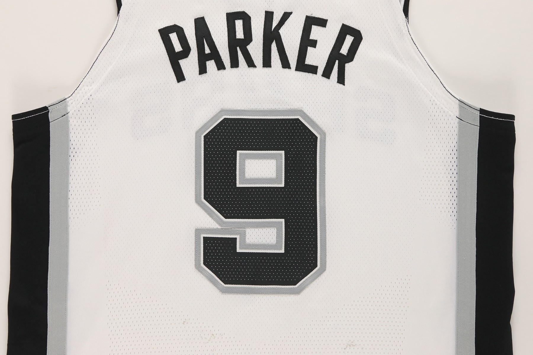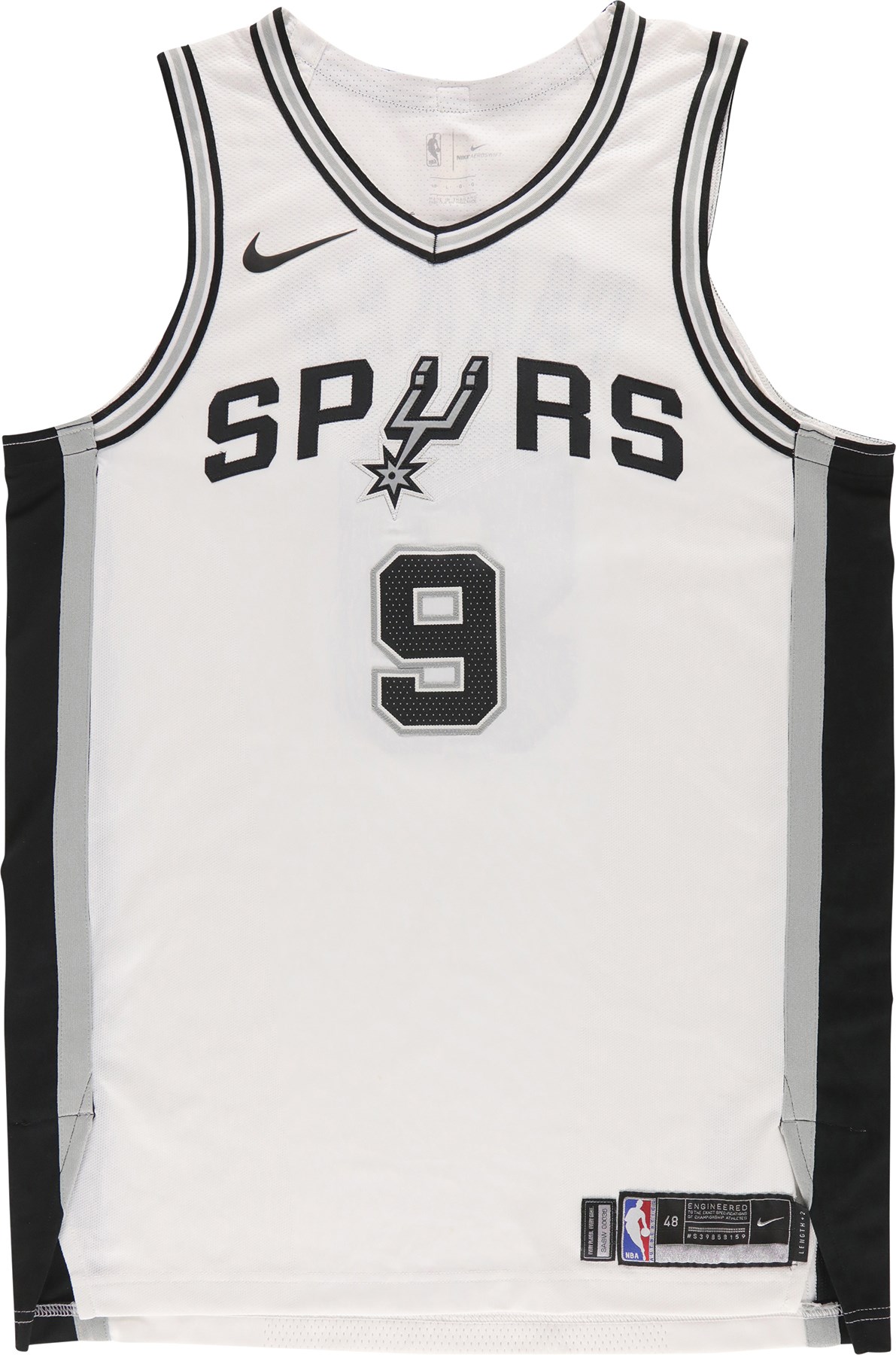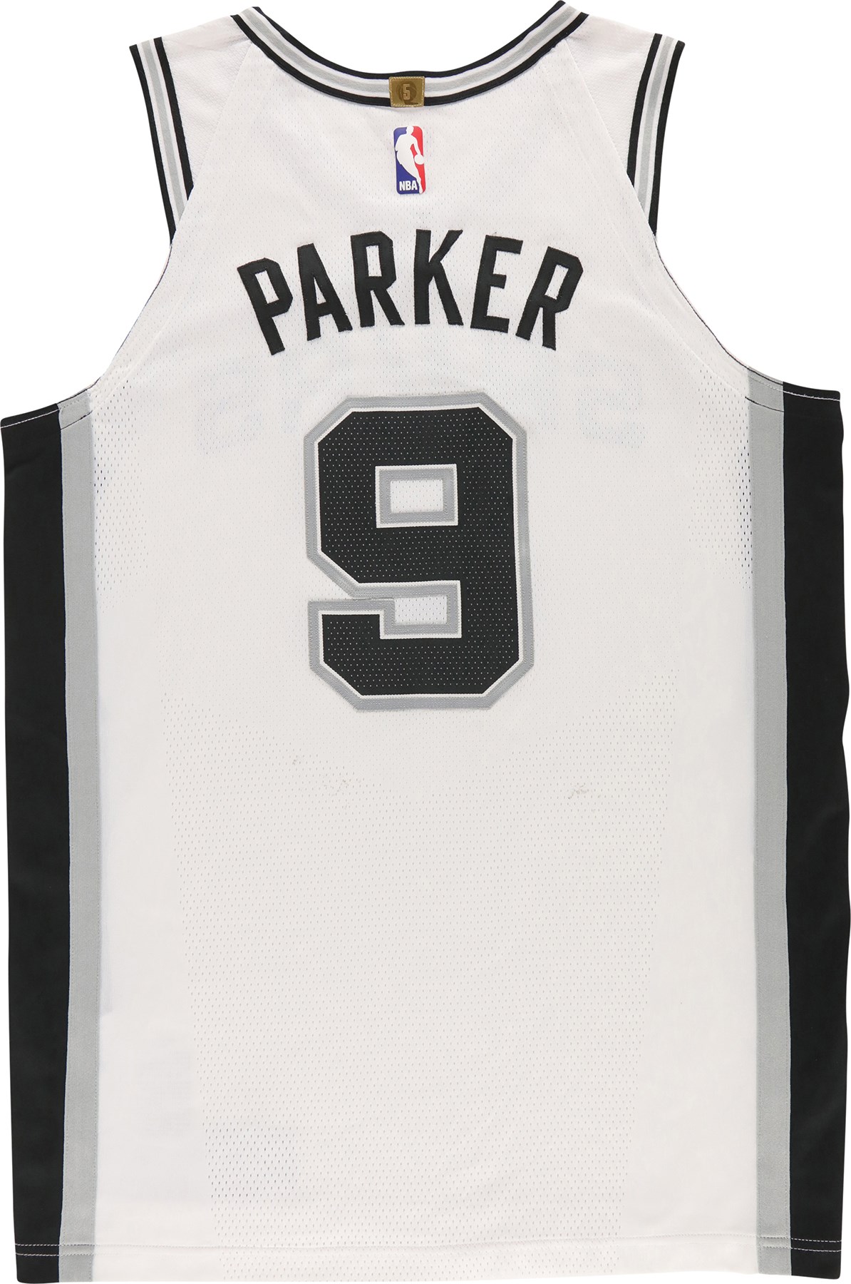 2017 Tony Parker photo-matched San Antonio Spurs game worn jersey. This Nike NBA Authentics jersey was worn by superstar Tony Parker during his last season with the Spurs. A size 48 tag is present at the front left tail of the jersey. Attached to the tag is a "LENGTH +2" tag. The mostly white jersey has "SPURS" sewn across the front, with "9" below. The Nike swoosh logo is stuck to the right shoulder area. "PARKER" is sewn to the back of the jersey, and "9" is underneath. A gold patch that features a basketball and the number 5 is sewn to the back collar. The 5 represents the Spurs NBA titles from 1999, 2003, 2005, 2007, and 2014. The NBA silhouette logo is below the patch. This exact jersey has been photo-matched to the December 12th, 15th, and 18th, 2017 games. Photo-matches can be found on the Getty Images website (image numbers: 891246624, 891254432, 891254486, 893734920, 893749880, and 895183170).
