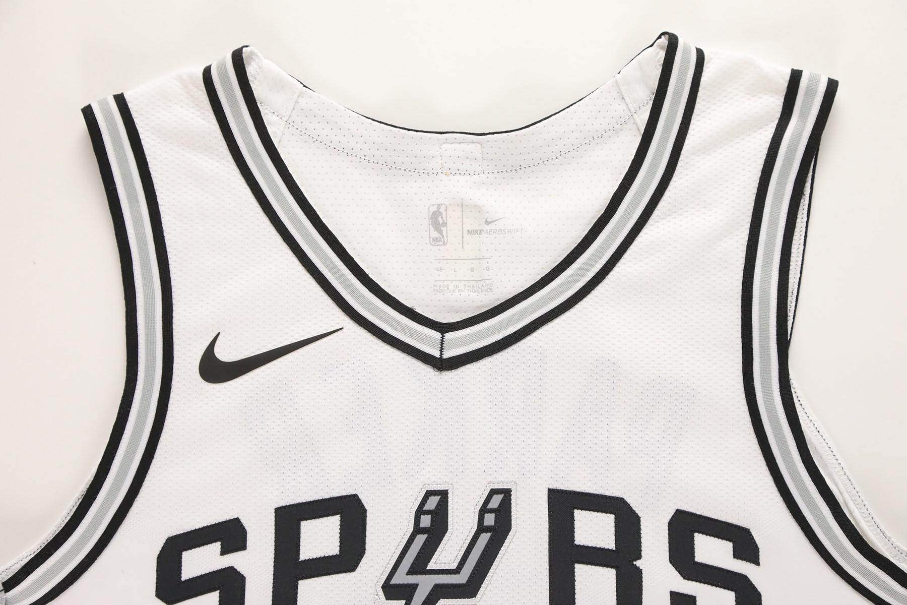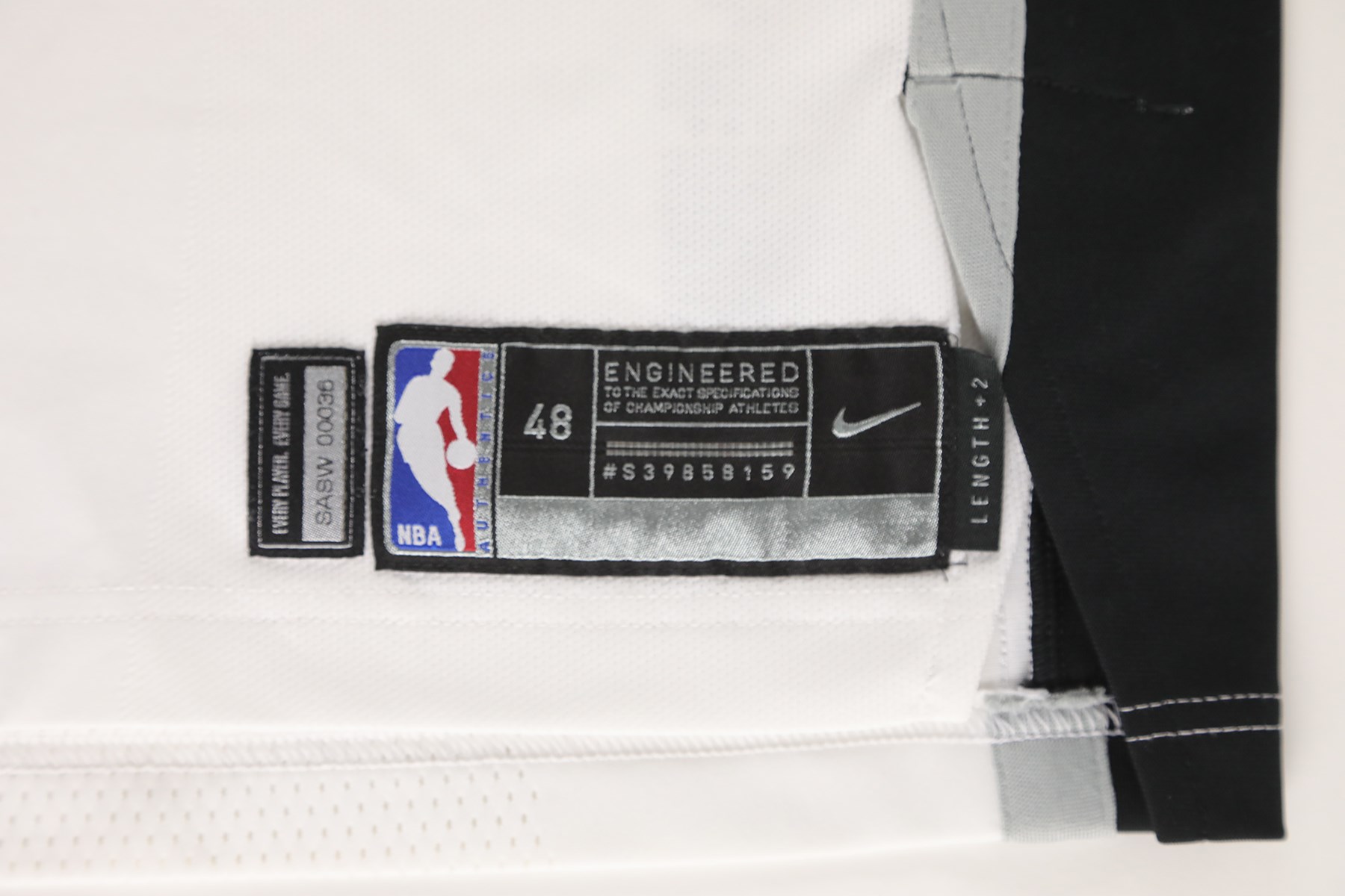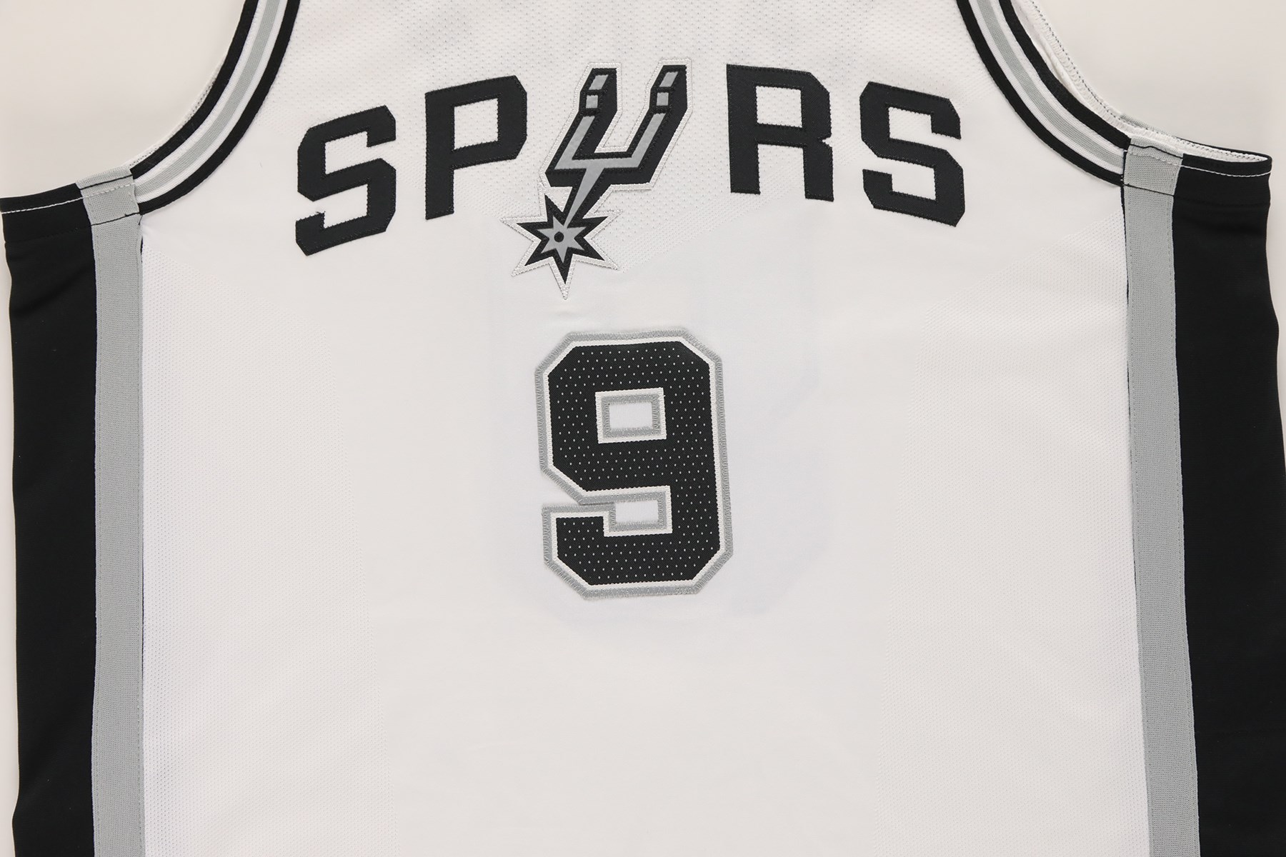 2017 Tony Parker photo-matched San Antonio Spurs game worn jersey. This Nike NBA Authentics jersey was worn by superstar Tony Parker during his last season with the Spurs. A size 48 tag is present at the front left tail of the jersey. Attached to the tag is a "LENGTH +2" tag. The mostly white jersey has "SPURS" sewn across the front, with "9" below. The Nike swoosh logo is stuck to the right shoulder area. "PARKER" is sewn to the back of the jersey, and "9" is underneath. A gold patch that features a basketball and the number 5 is sewn to the back collar. The 5 represents the Spurs NBA titles from 1999, 2003, 2005, 2007, and 2014. The NBA silhouette logo is below the patch. This exact jersey has been photo-matched to the December 12th, 15th, and 18th, 2017 games. Photo-matches can be found on the Getty Images website (image numbers: 891246624, 891254432, 891254486, 893734920, 893749880, and 895183170).