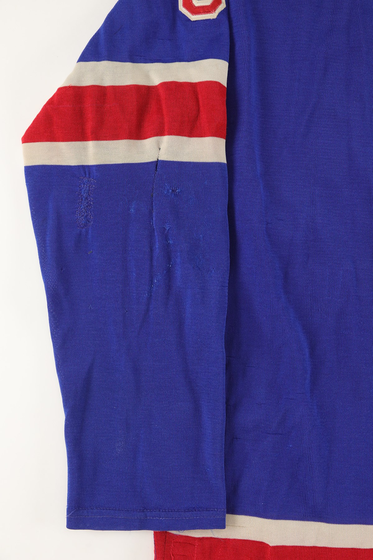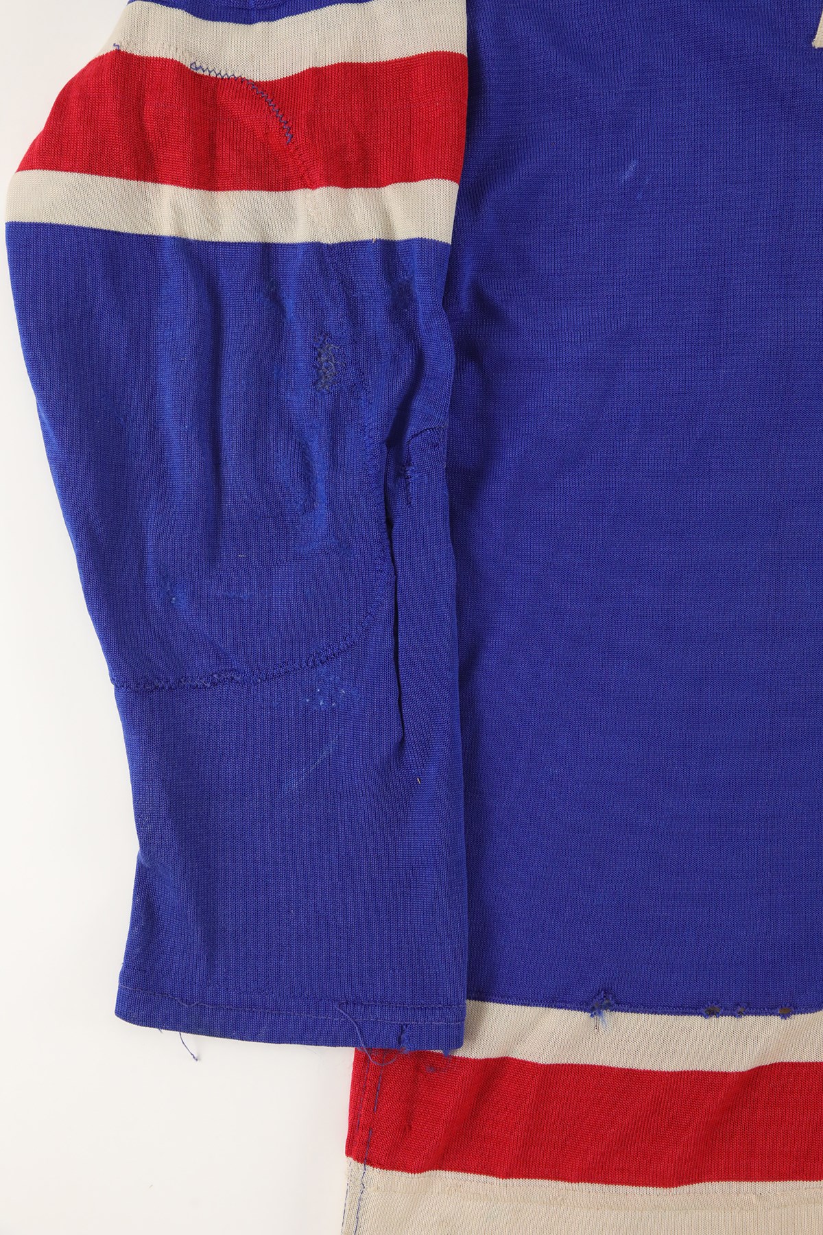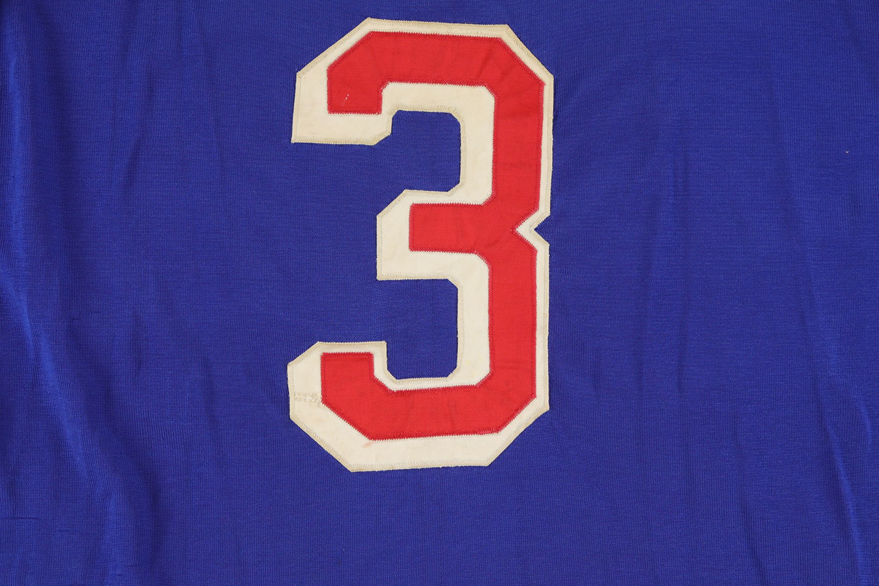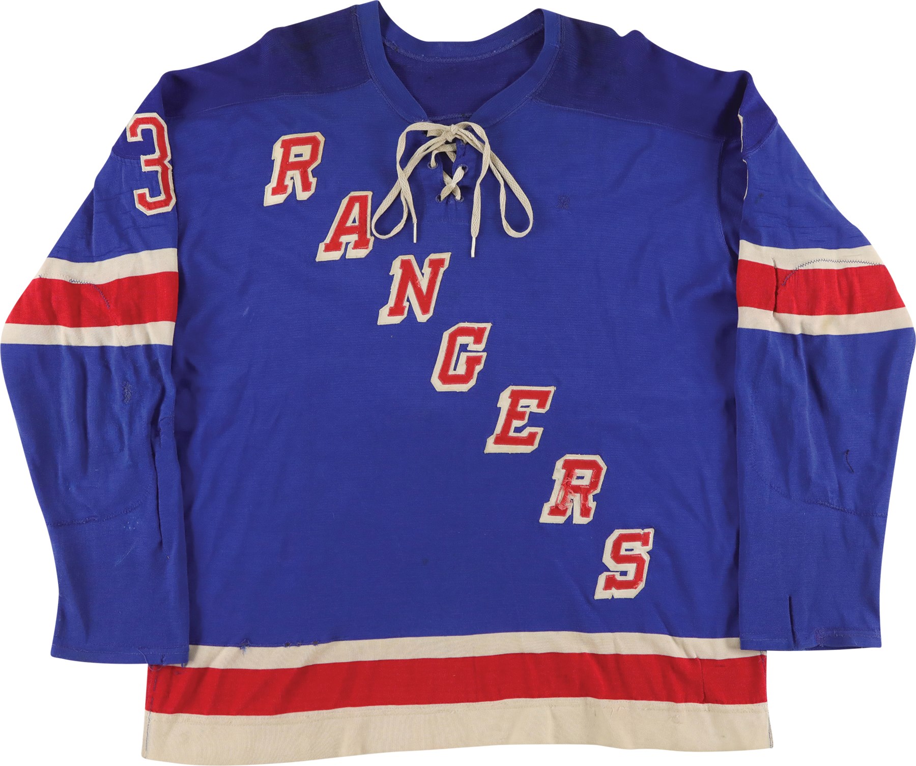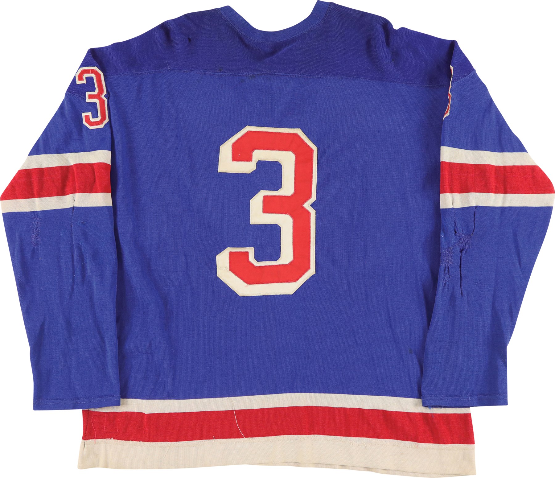 The jersey exhibits outstanding wear: It has eight team repairs - abrasions, scuffs, loose threads and some holes in the sleeves. There is heavy pilling inside. The jersey is all original, minus the alternate "A" patch on the front breast. On the front upper chest are tie strings. Running diagonally across the front, from top left to lower right is "RANGERS" in red lettering with white trim. On each sleeve is a red Number "3" in red with white trim. The lower inside, rear tail has a "50" size tag, and the other tag, which was next to it, has been removed. The back has "3" in red with white trim and with a 10.5" height.