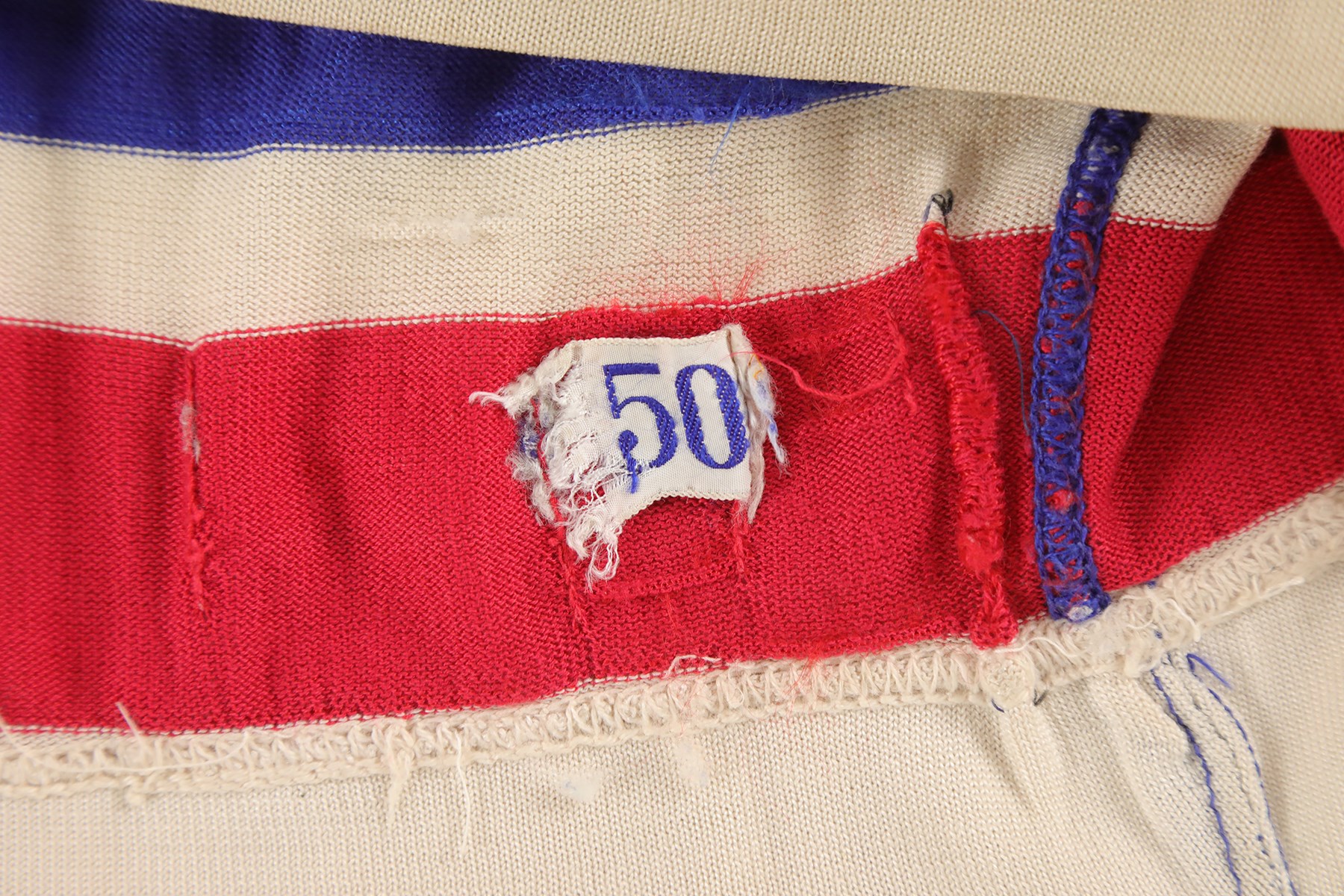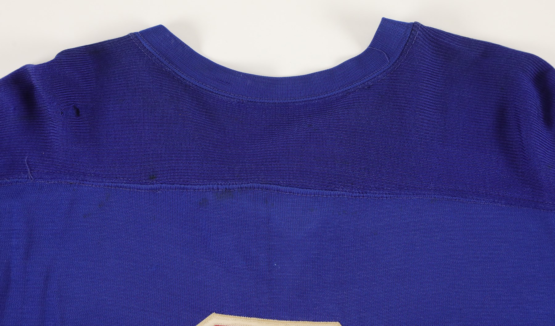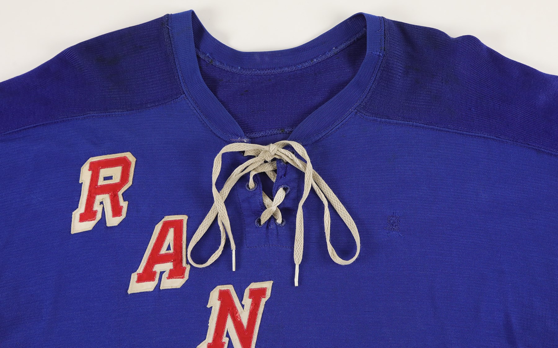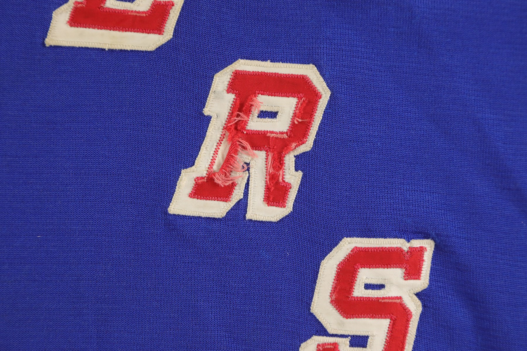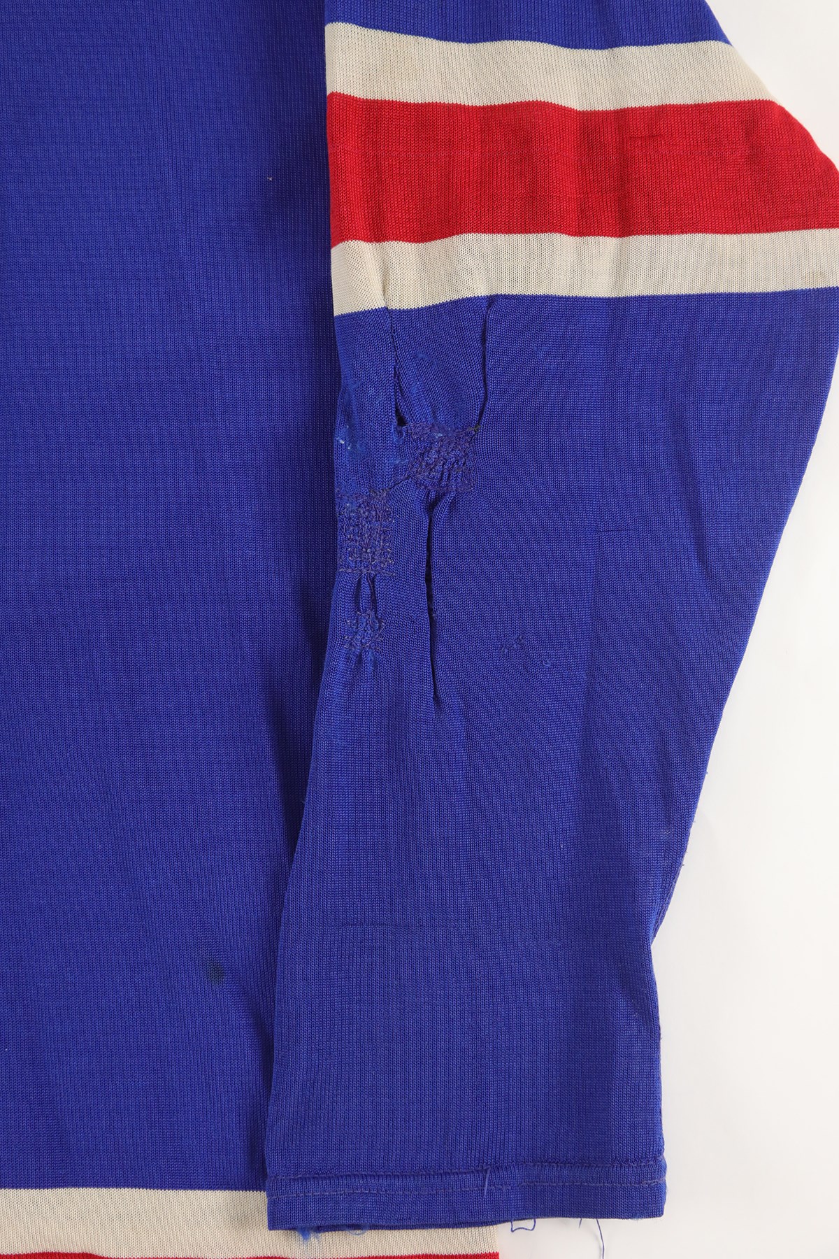The jersey exhibits outstanding wear: It has eight team repairs - abrasions, scuffs, loose threads and some holes in the sleeves. There is heavy pilling inside. The jersey is all original, minus the alternate "A" patch on the front breast. On the front upper chest are tie strings. Running diagonally across the front, from top left to lower right is "RANGERS" in red lettering with white trim. On each sleeve is a red Number "3" in red with white trim. The lower inside, rear tail has a "50" size tag, and the other tag, which was next to it, has been removed. The back has "3" in red with white trim and with a 10.5" height.