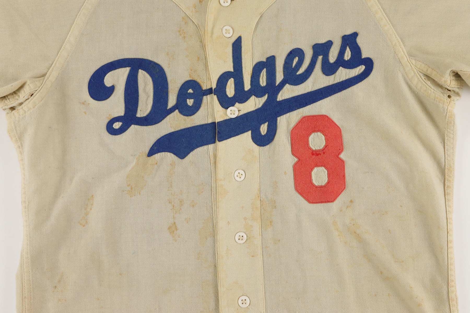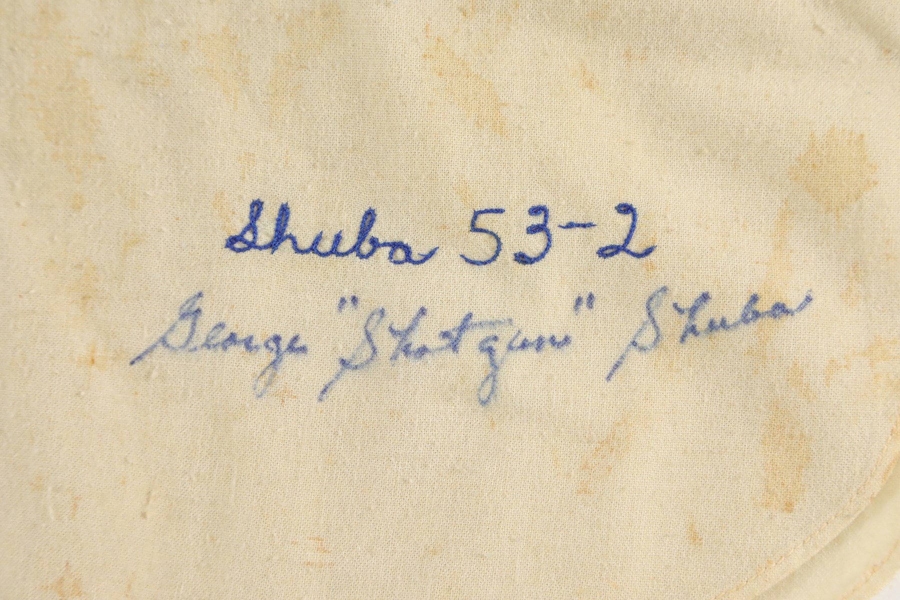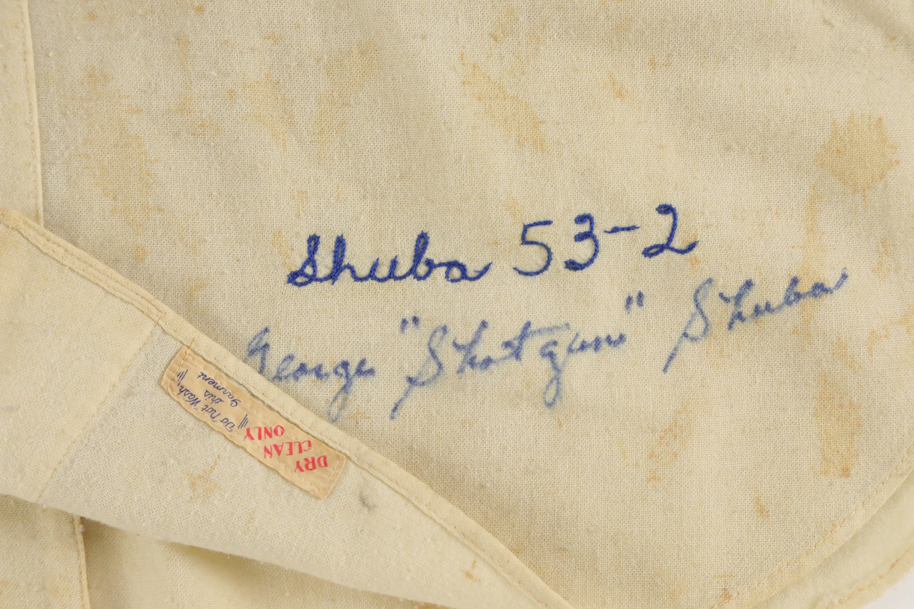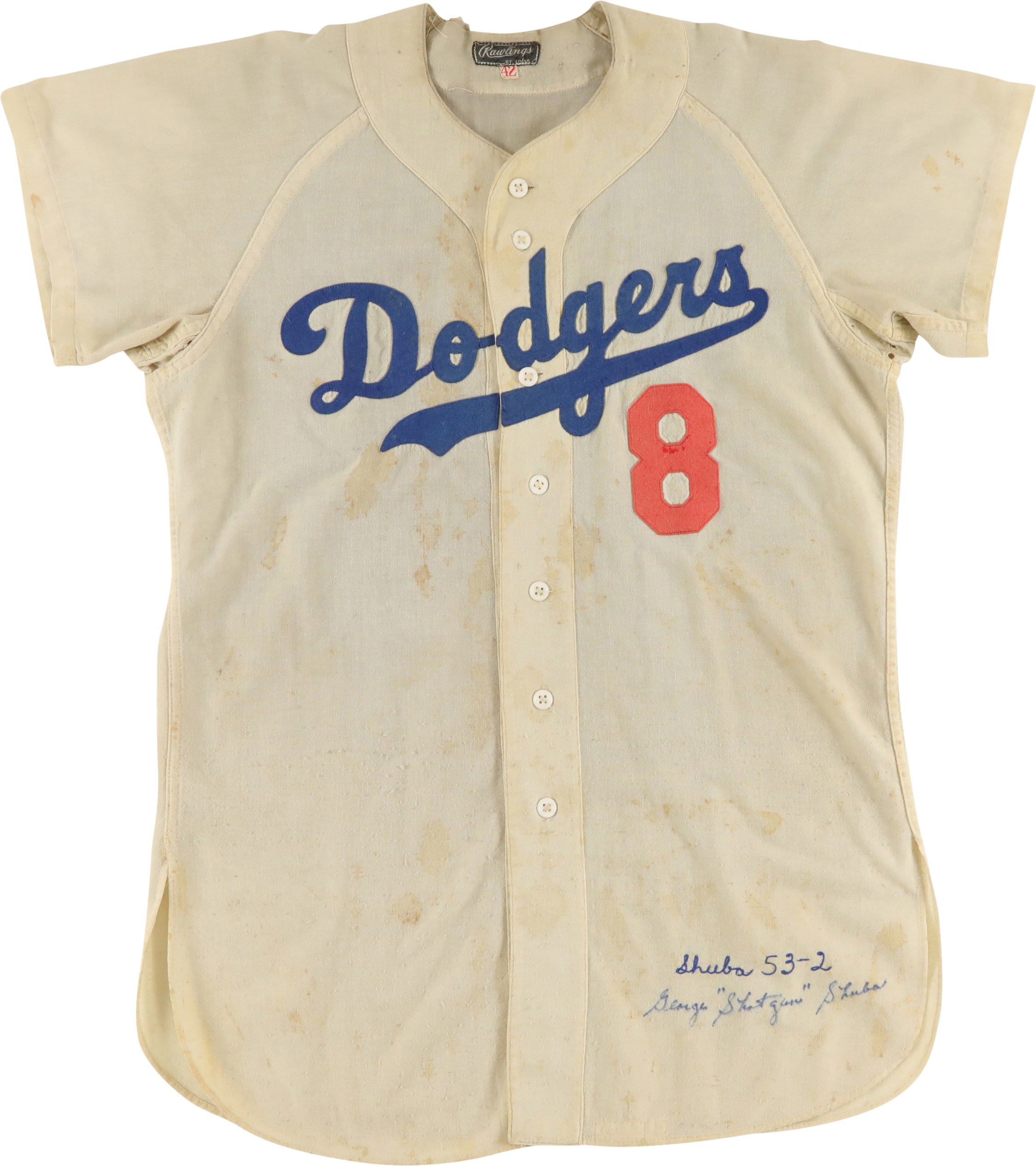 Brooklyn Dodgers home jersey worn by outfielder George "Shotgun" Shuba during the club's 1953 pennant-winning season. The white flannel jersey is lettered "Dodgers" across the front and features the number "8" on the left breast and reverse. All front letters and reverse numerals are applied in blue felt. All front numerals are applied in red felt. Both a "Rawlings" label and adjacent "42" size tag appear in the collar. Shuba's name, the year, and the set number ("Shuba 53-2") are chain-stitched in blue on the left front tail. A wash tag is located on the interior left front tail. Shuba has signed the jersey "George 'Shotgun' Shuba" in blue marker (grading 7/10) on the lower left tail. The jersey is original as issued and displays heavy wear, including numerous stains on the front, reverse, and shoulders, as well as heavy puckering on the front. Shuba played his entire Major League career with the Brooklyn Dodgers (1948-50 and 1952-55) and was a member of the club's 1955 World Championship club. An outfielder, almost one-third of his at bats during his career came as a pinch-hitter. In 1953 he appeared in 74 games, batting .254 with 5 home runs, 23 RBI. He retired after the 1955 season with 24 home runs, 125 RBI, and a .259 lifetime average. Despite those modest numbers, he was later immortalized in Roger Kahn's book "The Boys of Summer," which was published in 1972.