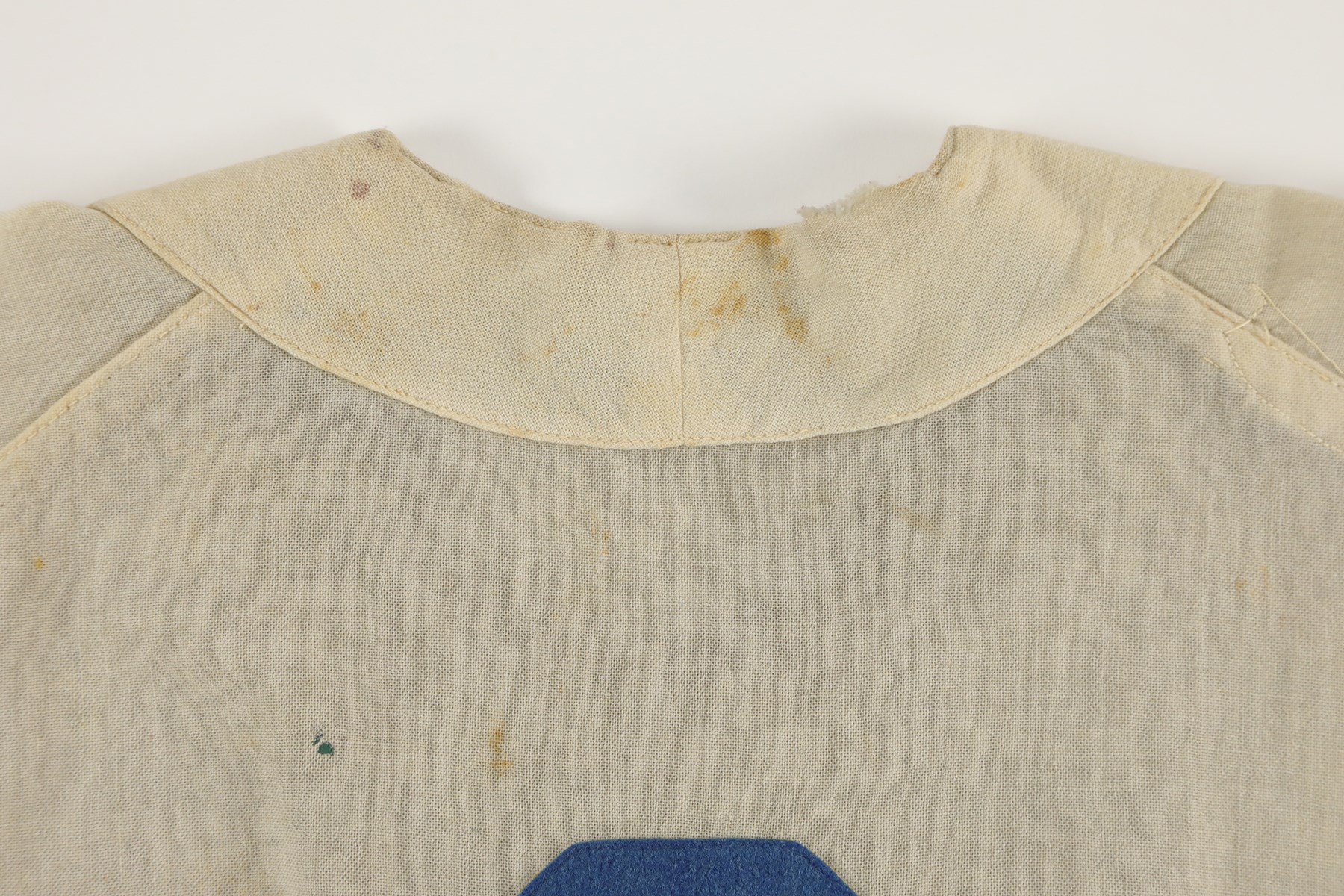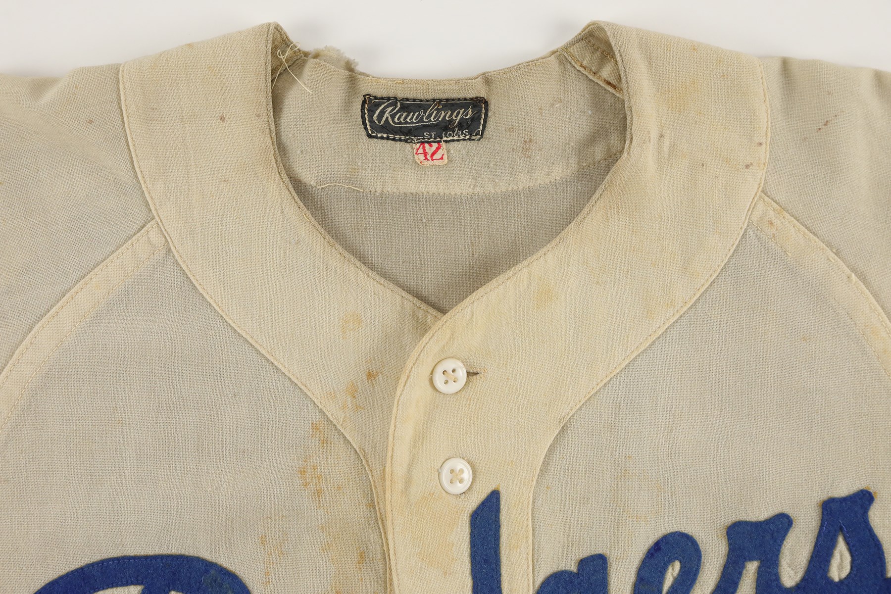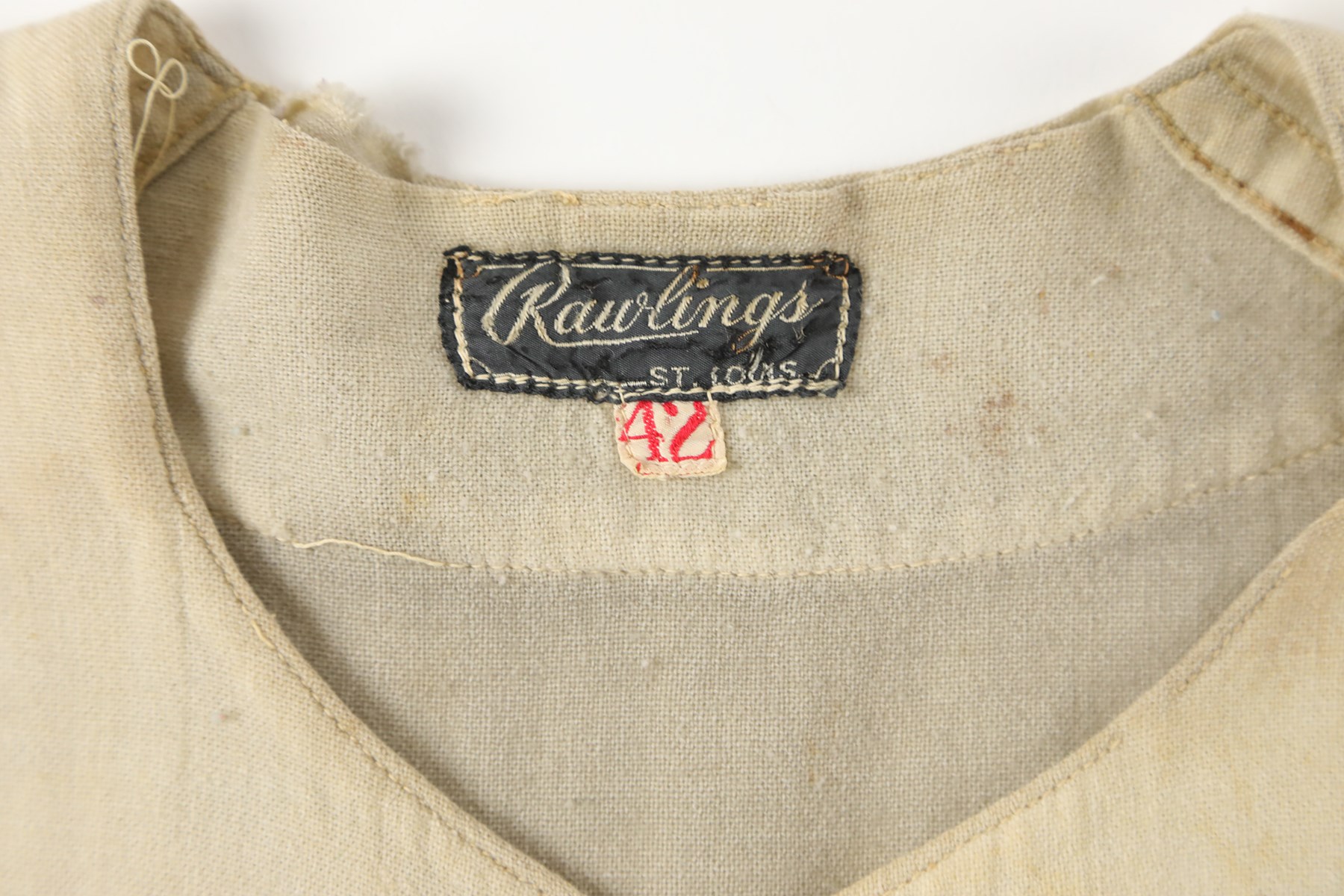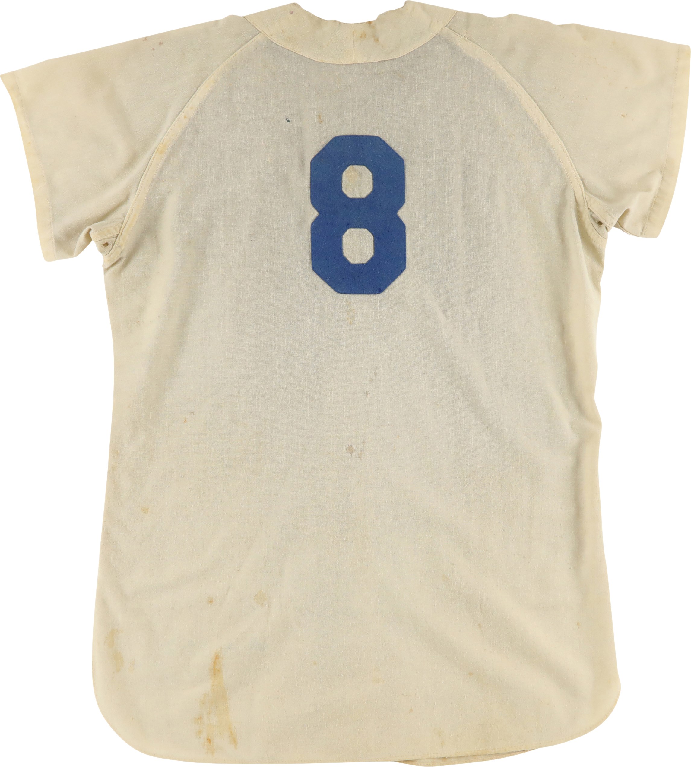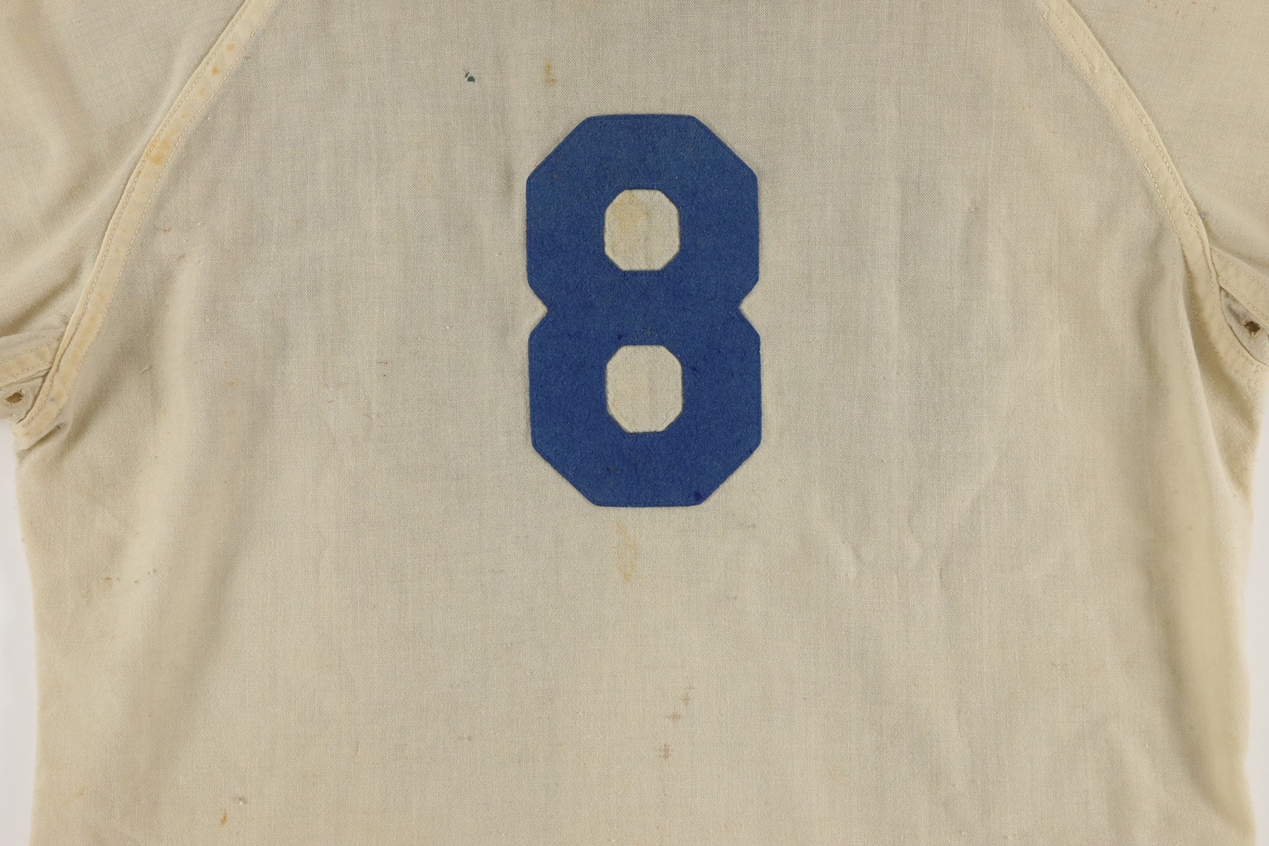 Brooklyn Dodgers home jersey worn by outfielder George "Shotgun" Shuba during the club's 1953 pennant-winning season. The white flannel jersey is lettered "Dodgers" across the front and features the number "8" on the left breast and reverse. All front letters and reverse numerals are applied in blue felt. All front numerals are applied in red felt. Both a "Rawlings" label and adjacent "42" size tag appear in the collar. Shuba's name, the year, and the set number ("Shuba 53-2") are chain-stitched in blue on the left front tail. A wash tag is located on the interior left front tail. Shuba has signed the jersey "George 'Shotgun' Shuba" in blue marker (grading 7/10) on the lower left tail. The jersey is original as issued and displays heavy wear, including numerous stains on the front, reverse, and shoulders, as well as heavy puckering on the front. Shuba played his entire Major League career with the Brooklyn Dodgers (1948-50 and 1952-55) and was a member of the club's 1955 World Championship club. An outfielder, almost one-third of his at bats during his career came as a pinch-hitter. In 1953 he appeared in 74 games, batting .254 with 5 home runs, 23 RBI. He retired after the 1955 season with 24 home runs, 125 RBI, and a .259 lifetime average. Despite those modest numbers, he was later immortalized in Roger Kahn's book "The Boys of Summer," which was published in 1972.
